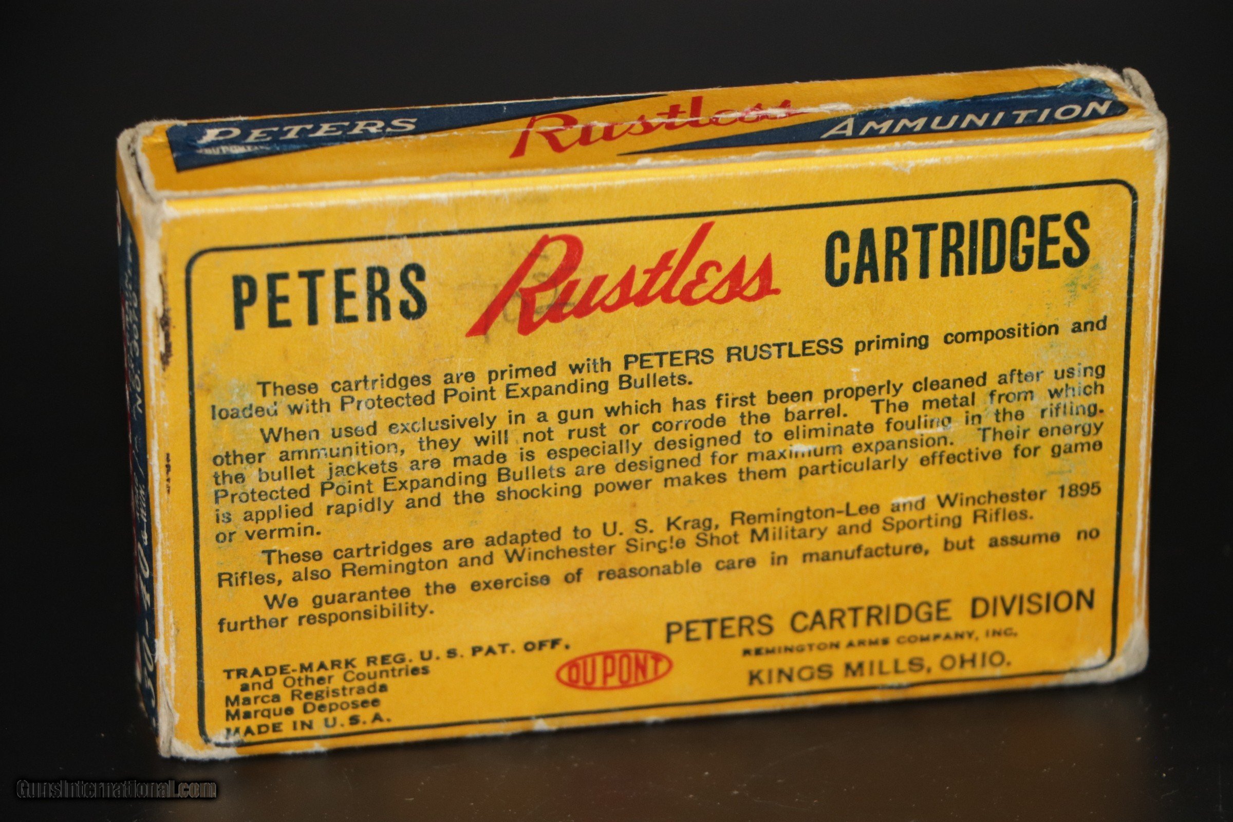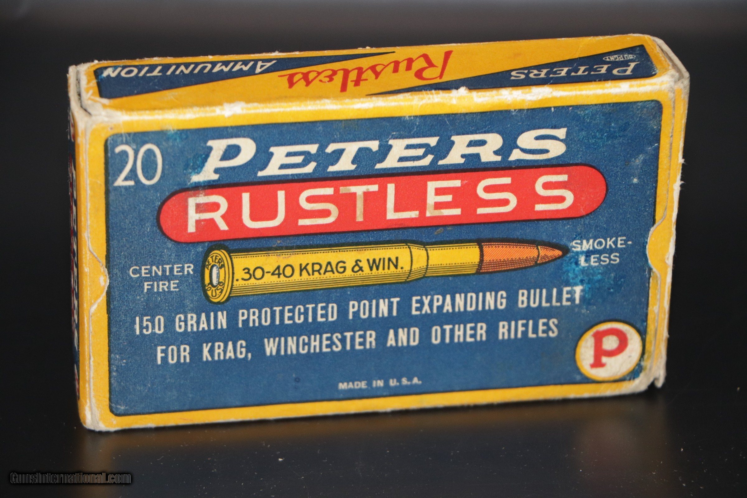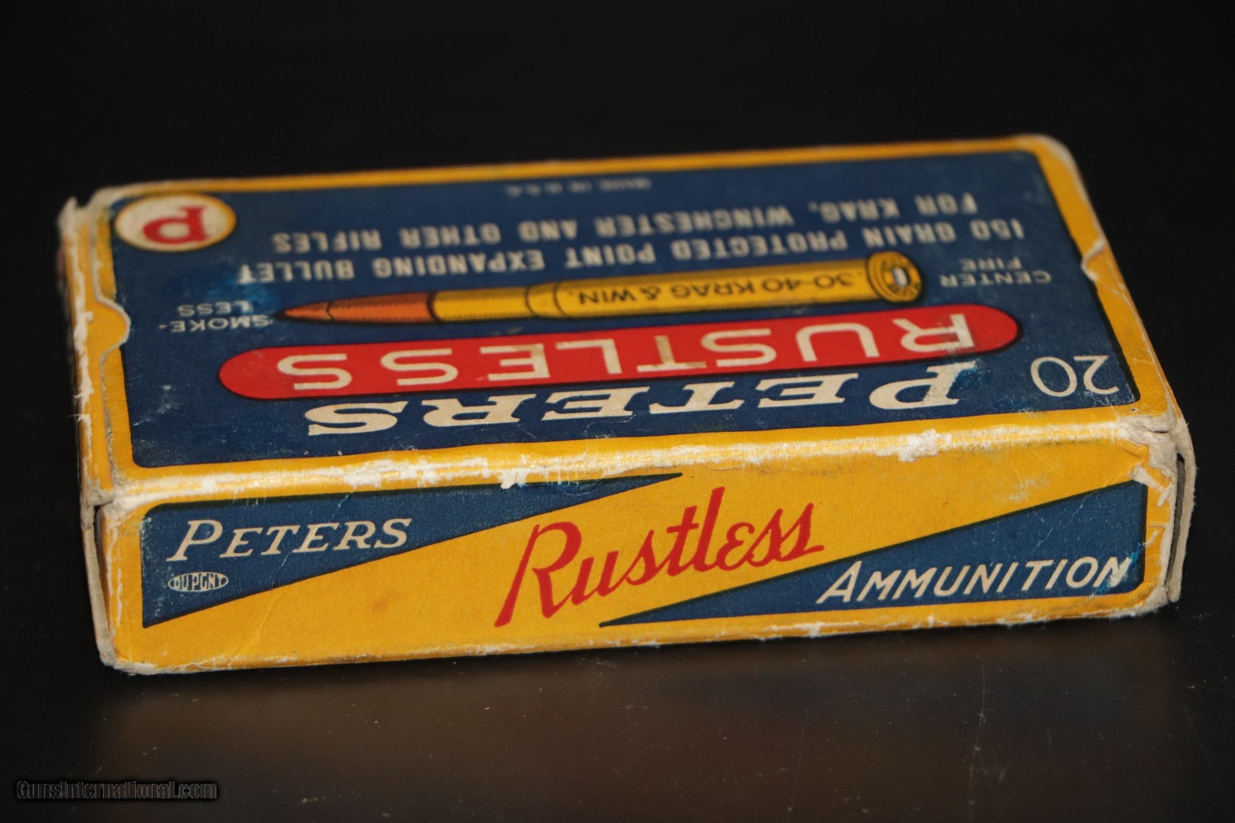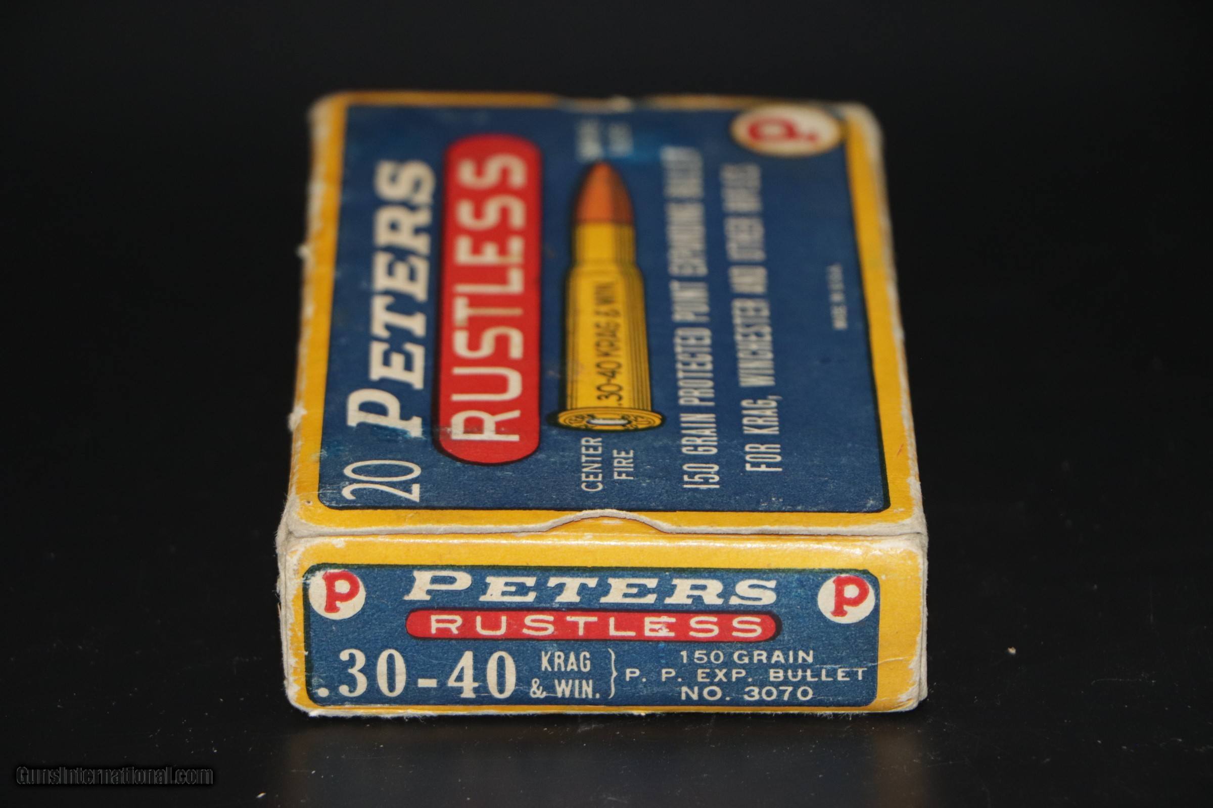 Description: Peters Cartridge Div, Kings Mills, OH. Peters Rustless, 30-40 KRAG & Win, 150 Grain, Protected Point, Exp Bullet. Box is VG+ with some scuffing, edge wear and light stains. Ammo is perfect. Add $16.50 S+H SOLD Rifle Caliber: .30-40 Krag |
