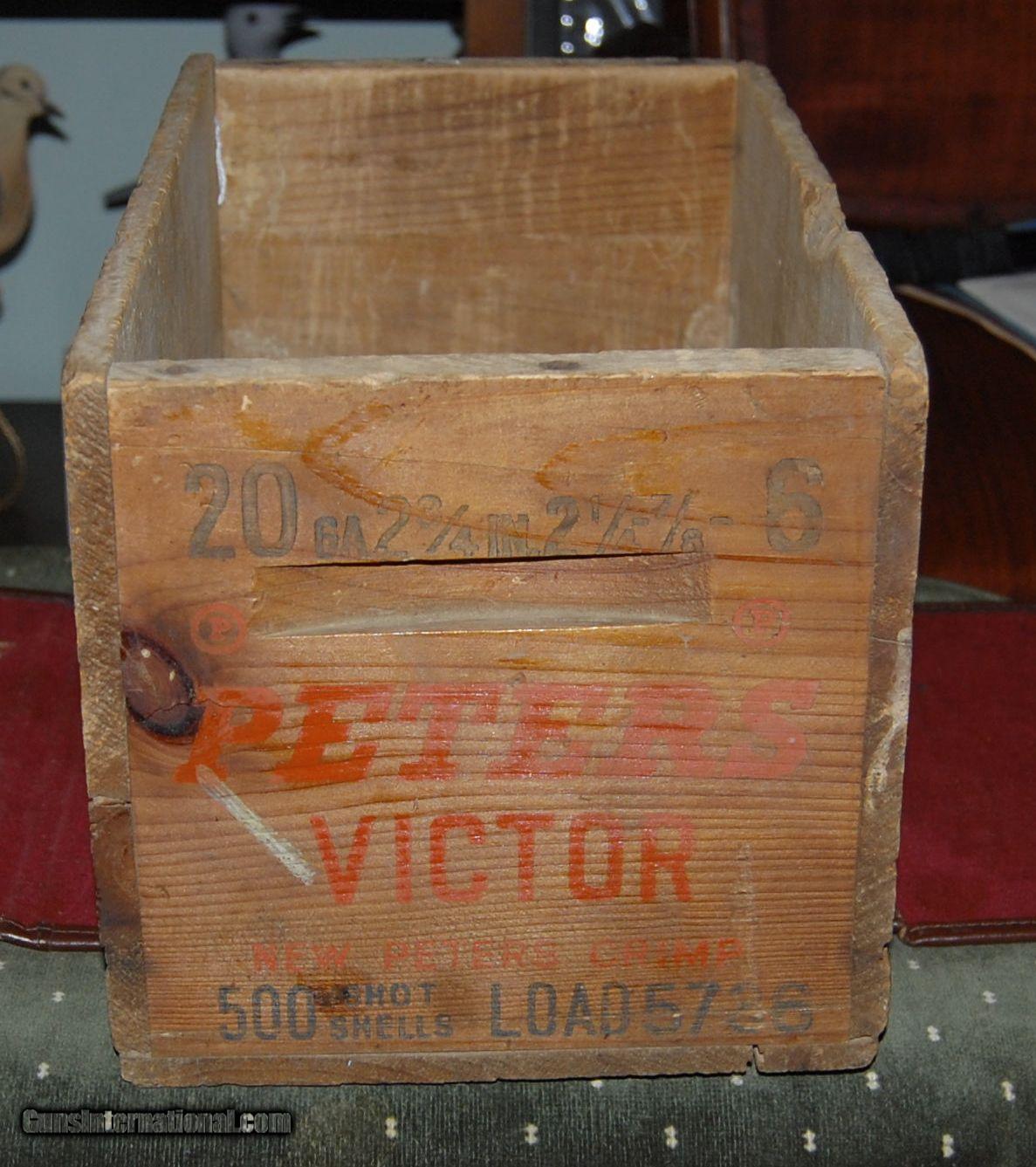 Description: A 20 gauge Peters Victor wooden shotshell box circa 1940s.This box has bright lettering and solid construction.It is built with nailed corners typical of the 1940s and 1950s.A nice addition to your office,den,or gun room. SOLD |