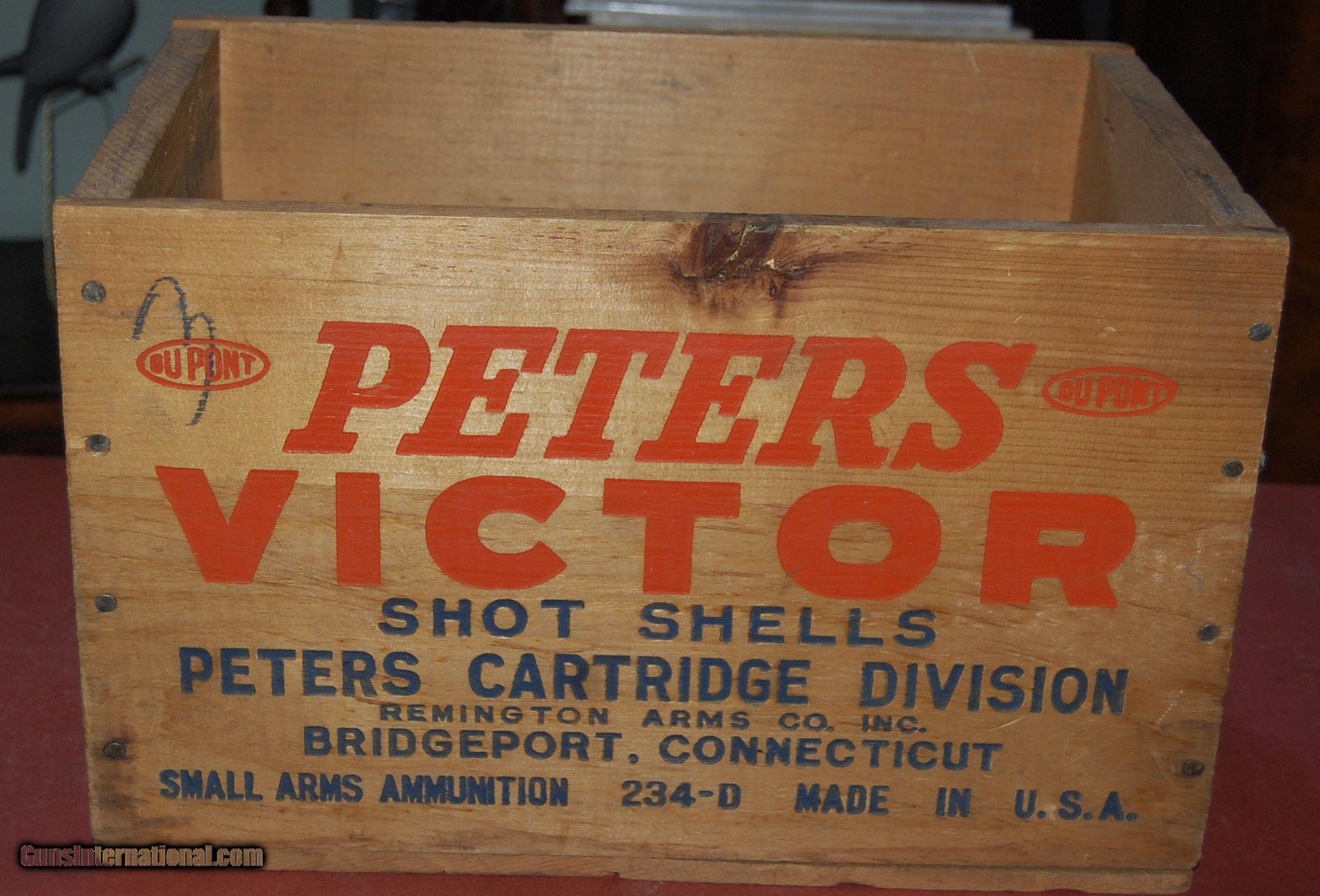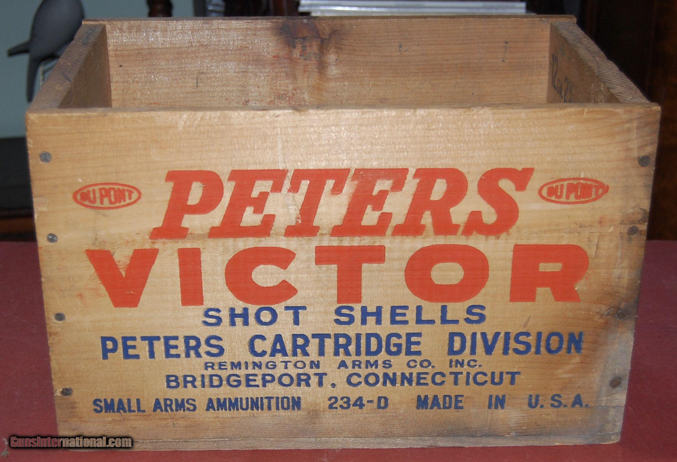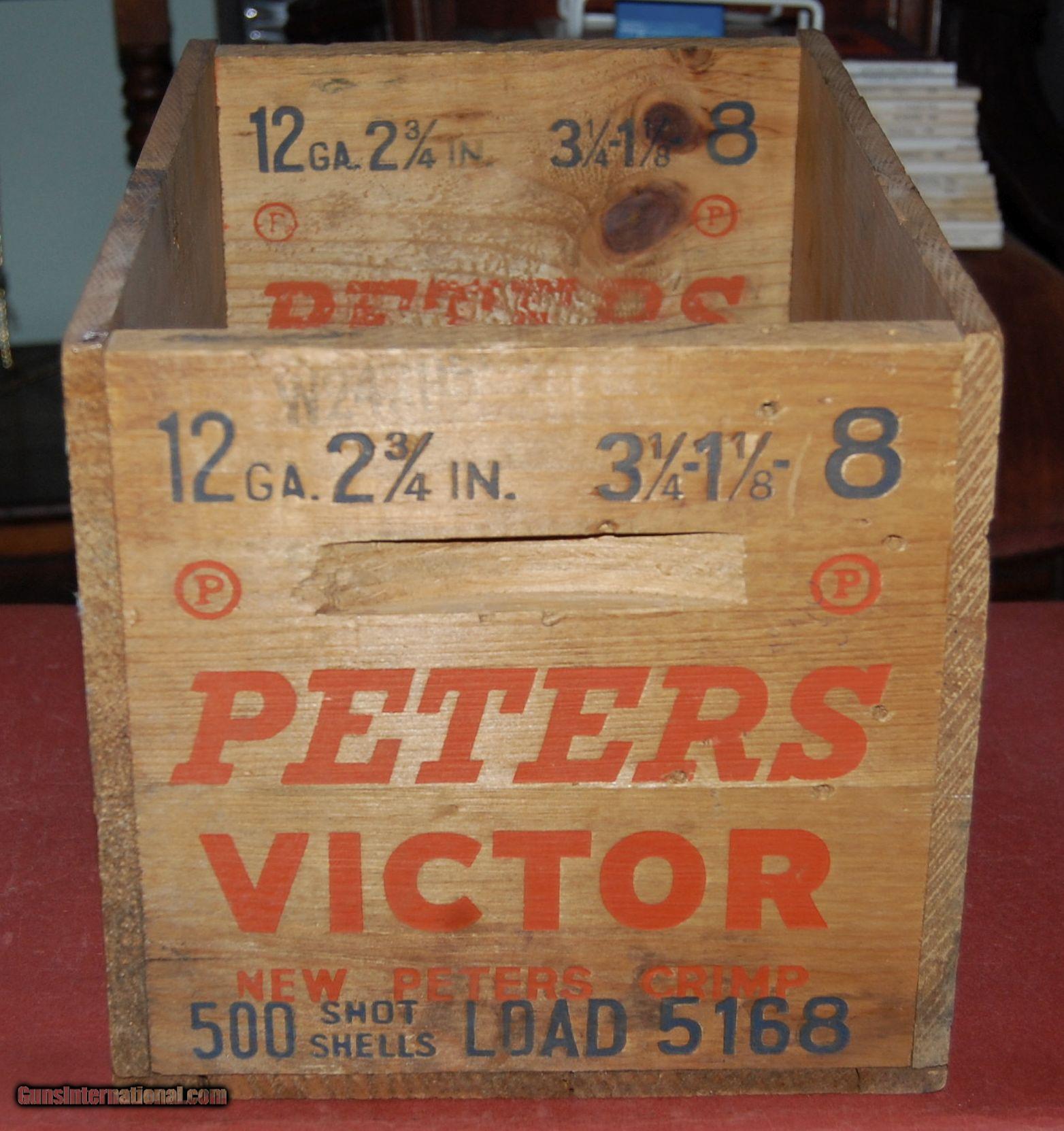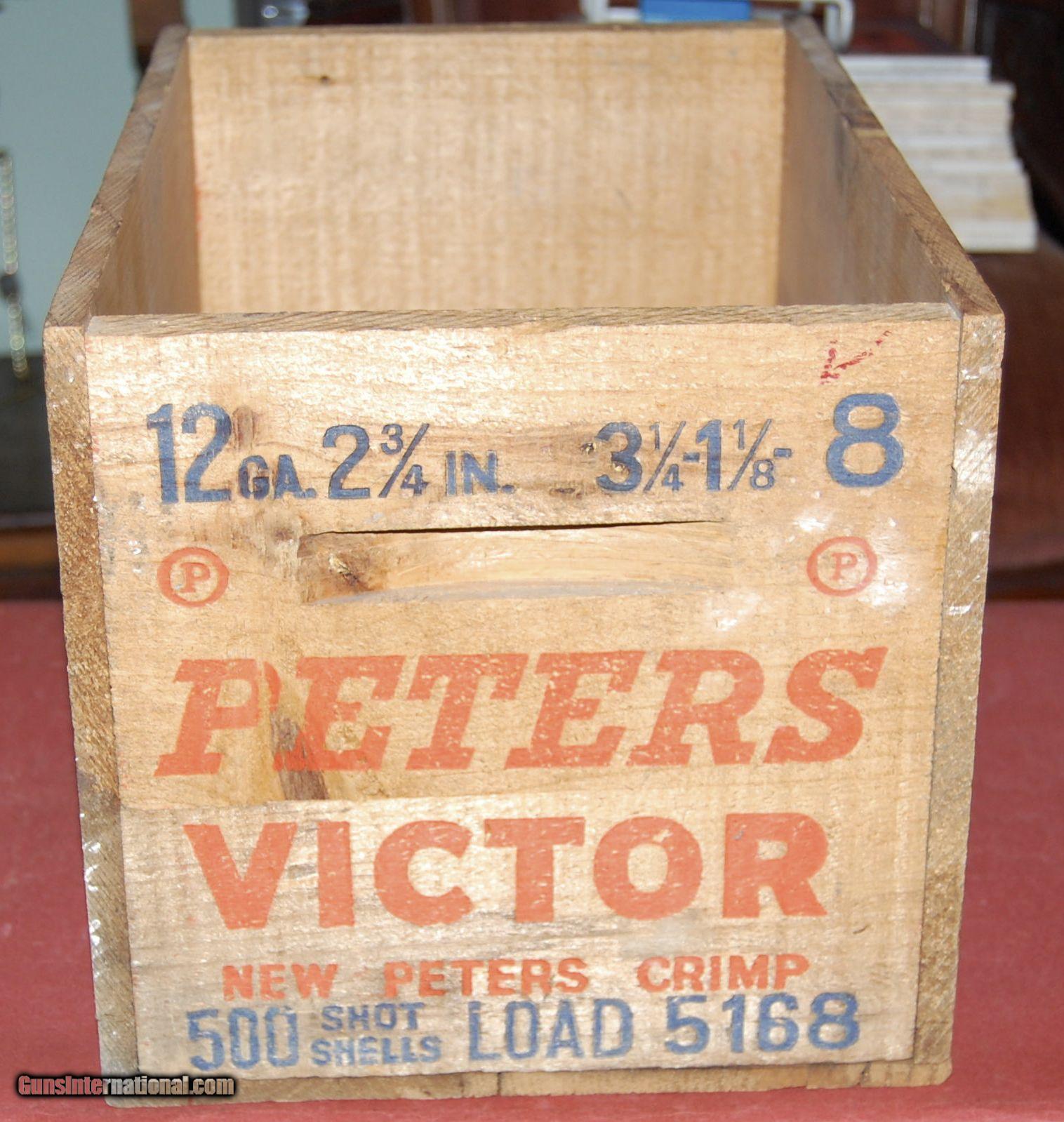 Description: Peters Victor 12 gauge wooden shell box.Circa late 1940s or early 1950s.This box has vivid original colors on all sides.It is a nailed corner box,It is is excellent condition and very sound.A great addition to the den ori gunroom. SOLD |