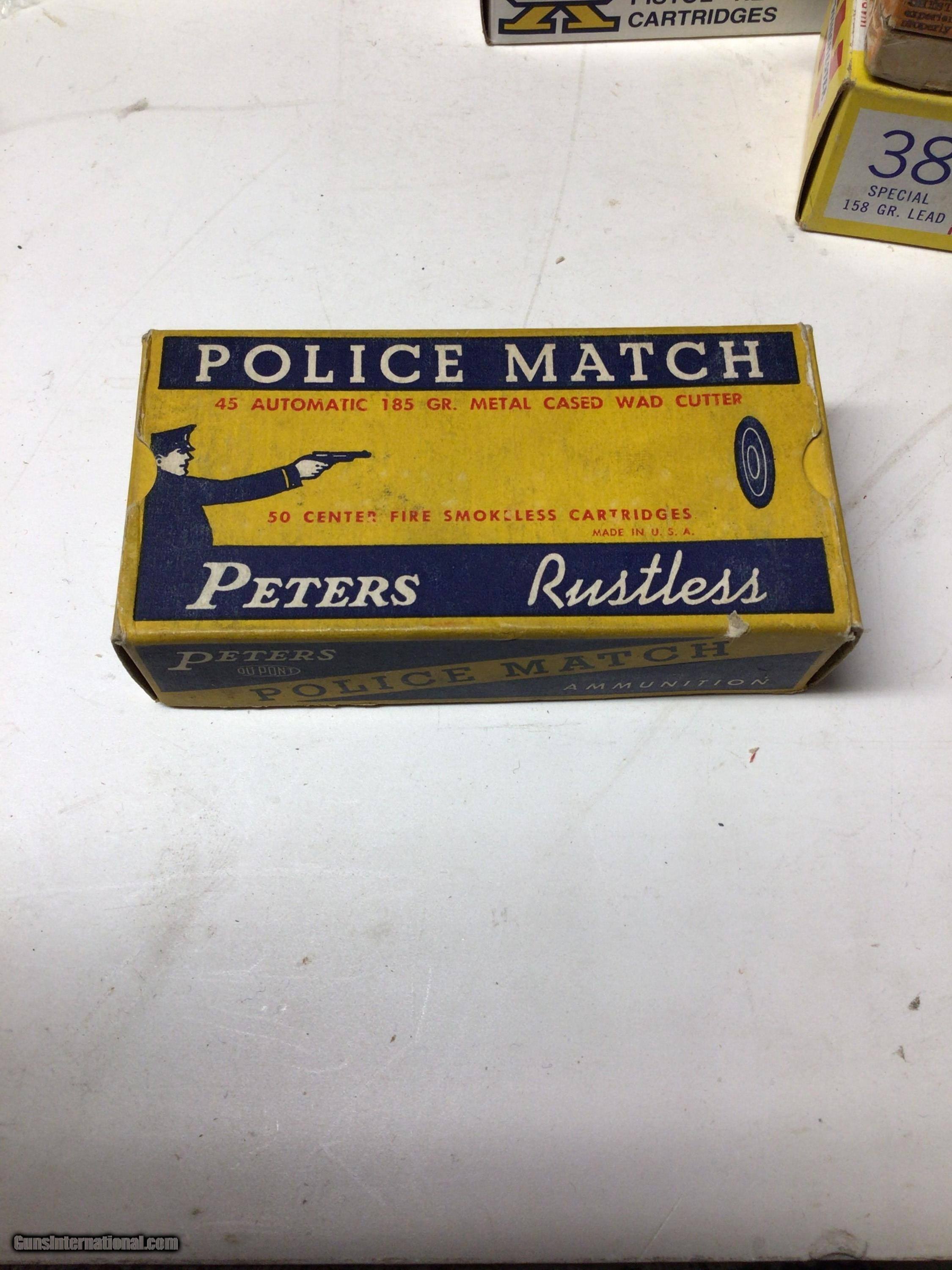 Description: Peters Police Match 45,nice full box with some lite tarnish on bullets. SOLD |