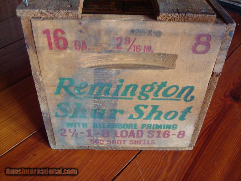 Description: HERE IS AN ORIGINAL REMINGTON WOOD CASE FILLED WITH 10 BOXES OF SHUR SHOT 16GA. 10Z. #8 SHOT. ALL BOXES ARE NEW AND FULL AND UNOPENED, JUST AS THEY WERE PACKED AT THE FACTORY. AL IN FINE OVERALL CONDITION. RARE. SOLD |