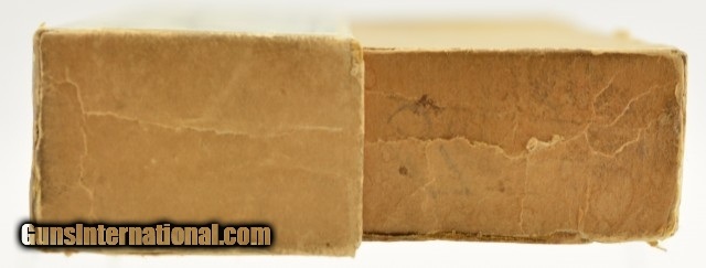 Description: This is a full box, 20 original rounds, of .40-70 Ballard Rifle ammunition manufactured by Winchester with 330 grain patched bullets. This is the very seldom-seen 1890's picture box dating to the very late 1890's with "Center Fire" designation on the top label and the later right facing wood cut of a Ballard rife showing in detail the large tang sight. The two piece box is solid with expert brown tape repairs to the bottom inside corners and shows some age soiling to the buff box with light edge and rub wear. The green labels are near excellent with beautiful graphics. The cartridges are correct and appear native to the box and in excellent condition. SOLD |
