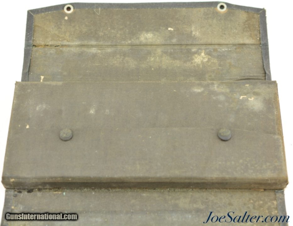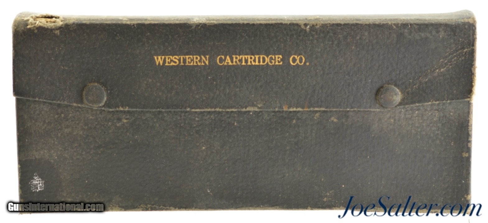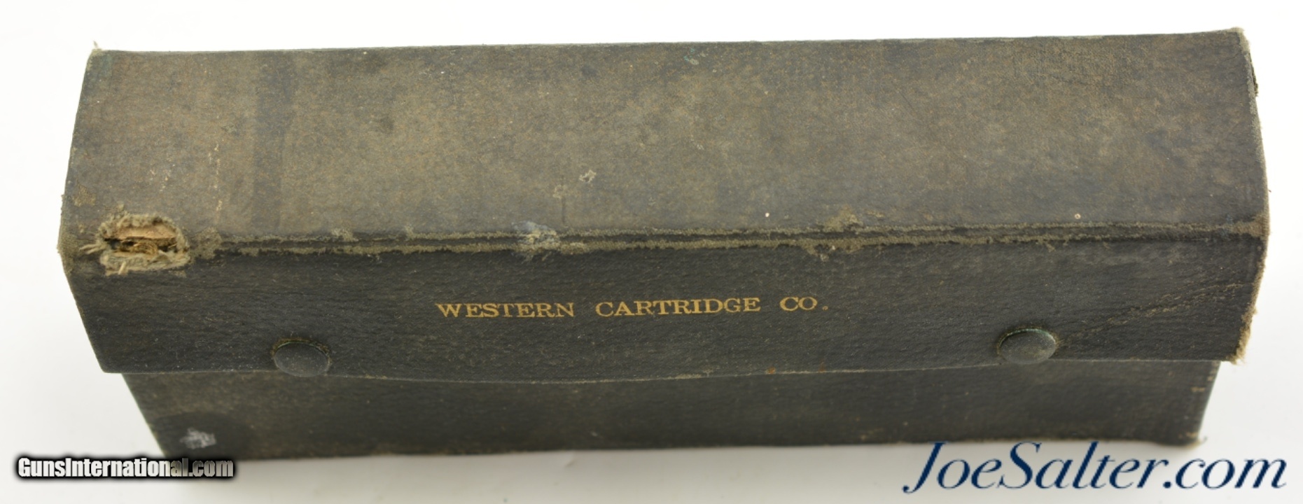 Description: This is a Salesman's sample folding three panel kit for rifle and handgun cartridges manufactured by the Western Cartridge Company. The kit has three compartments to hold a sample of each caliber manufactured by the company folding up and snapping closed when not displayed. Unfolded the kit measures 21 inches wide by 10.5 high. Included are 83 original Western cartridges in caliber ranging from .22 up to .45-70 with many of the long obsolete large caliber rim fire rounds. The front flap is gold embossed with "Western Cartridge Co." with a green velvet lined interior. Overall condition is good to very good with a slight separation on the outer flap edge, slightly brittle overall with several of the cartridge loops also torn. The cartridges range from excellent to badly corroded. A rare kit that with a little restoration would make an excellent display item. SOLD |