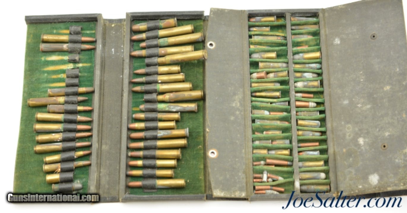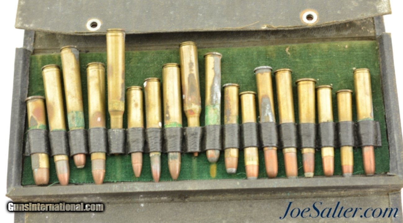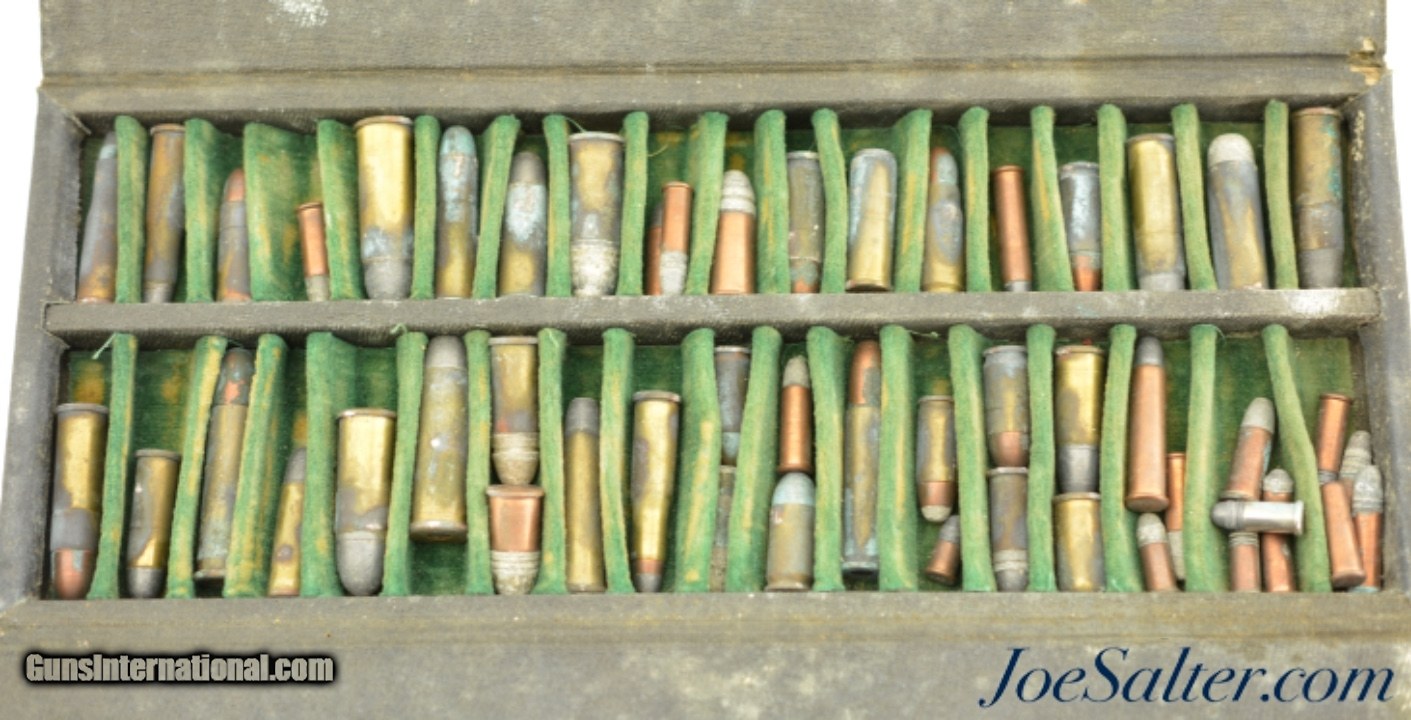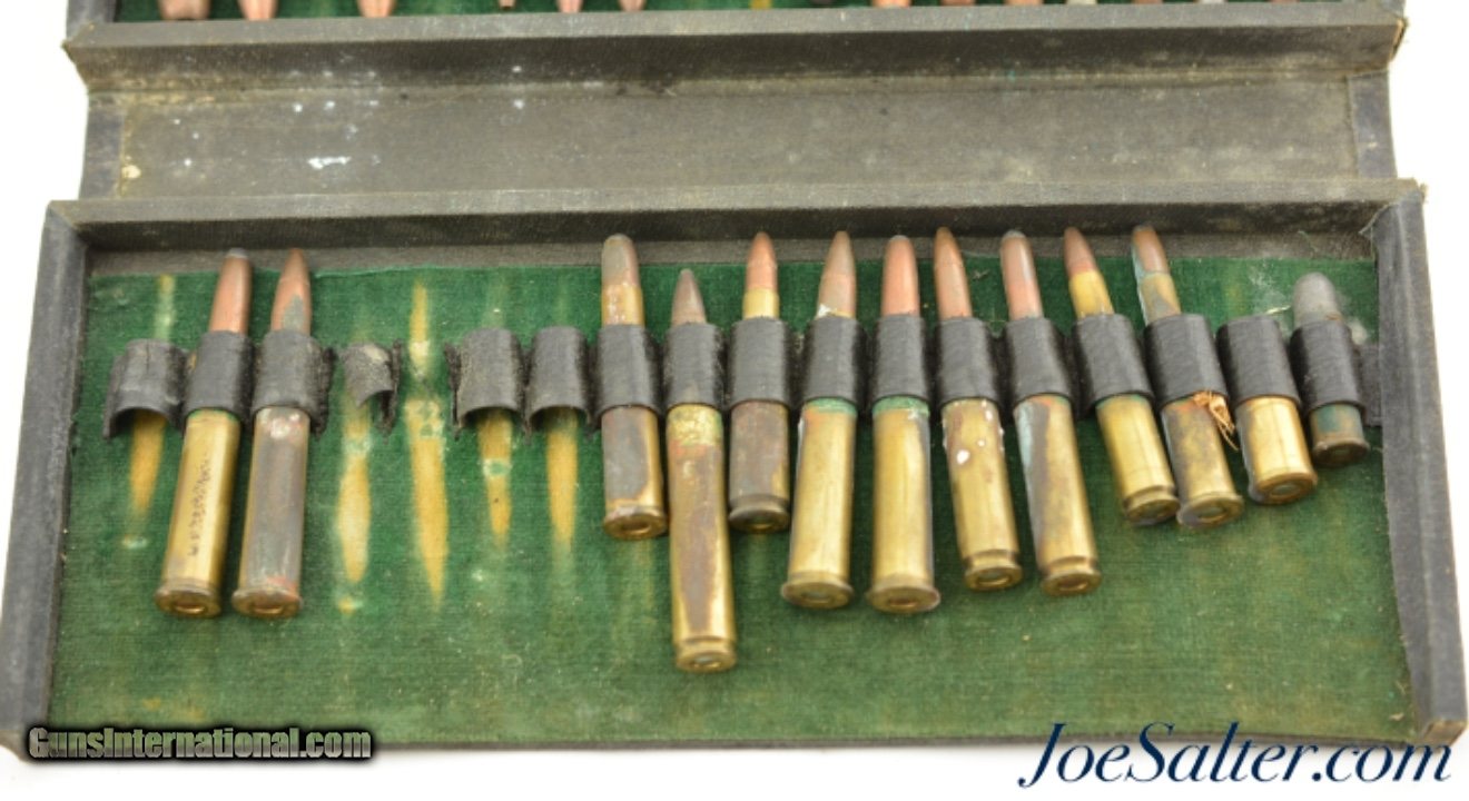 Description: This is a Salesman's sample folding three panel kit for rifle and handgun cartridges manufactured by the Western Cartridge Company. The kit has three compartments to hold a sample of each caliber manufactured by the company folding up and snapping closed when not displayed. Unfolded the kit measures 21 inches wide by 10.5 high. Included are 83 original Western cartridges in caliber ranging from .22 up to .45-70 with many of the long obsolete large caliber rim fire rounds. The front flap is gold embossed with "Western Cartridge Co." with a green velvet lined interior. Overall condition is good to very good with a slight separation on the outer flap edge, slightly brittle overall with several of the cartridge loops also torn. The cartridges range from excellent to badly corroded. A rare kit that with a little restoration would make an excellent display item. SOLD |
