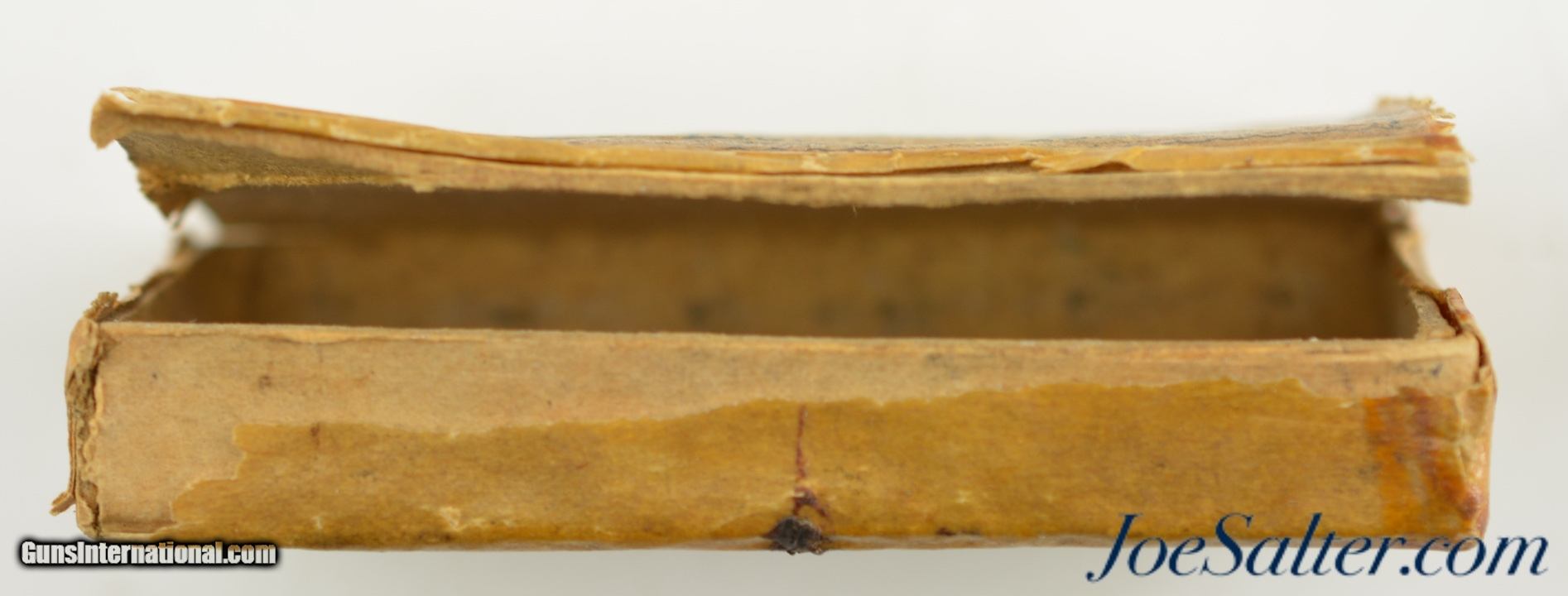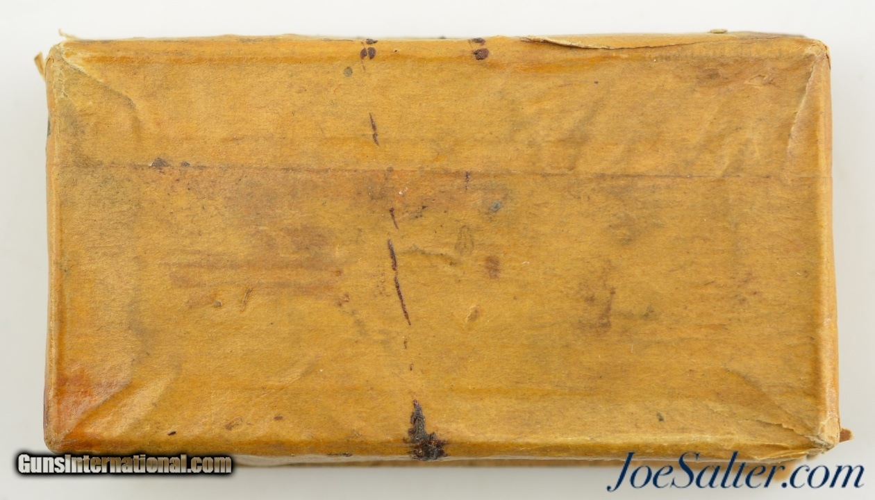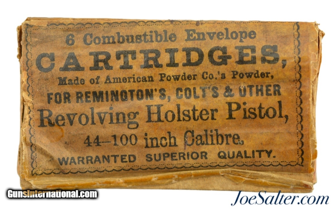 Description: This is an excellent condition empty, 6 Combustible Envelope cartridges box with an easy to read, clear front cover stating "made of American Powder Co. Powder for the Remington, Colt & Others Revolving Holster Pistol, 44-100 Inch Calibre" Box is complete with cover open on three edges. The combustible cartridges for use in Colt’s patent revolvers had been developed during the mid-1850s. Colt had experimented with a variety of combustible materials to contain the powder charge and attach it to the bullet. The rectangular packet measures 2 3/4" x 1 1/2 SOLD |