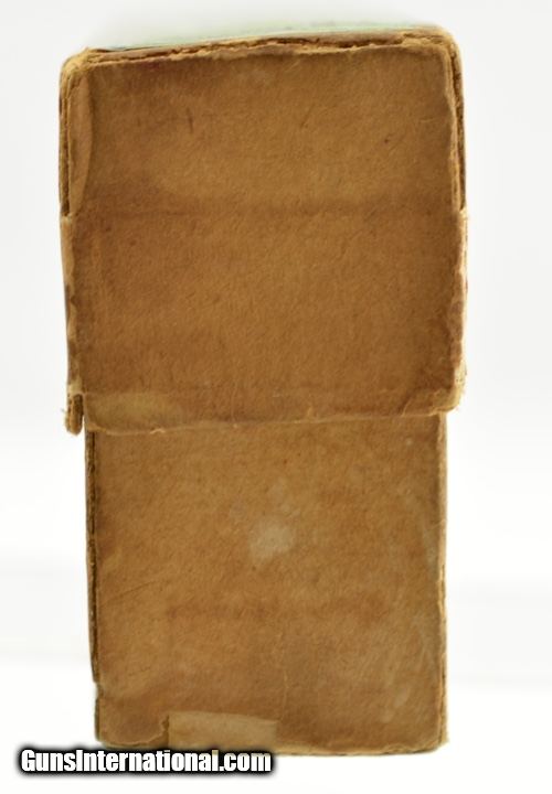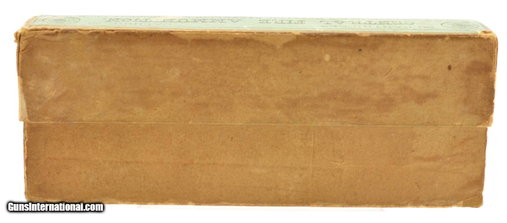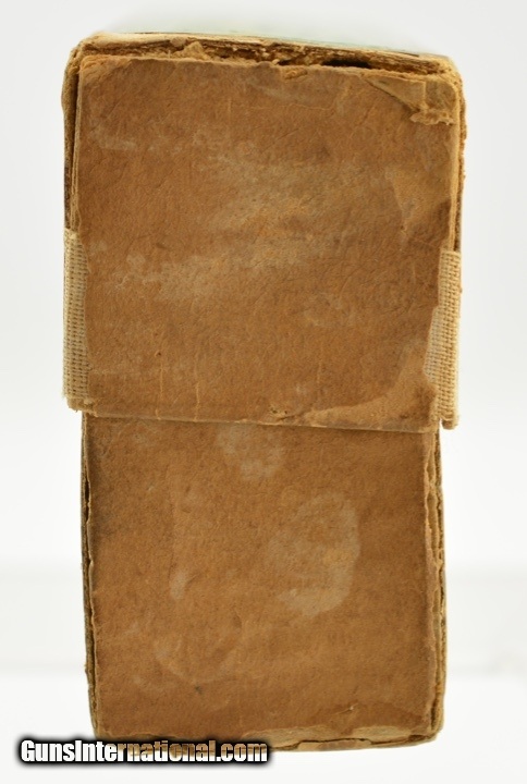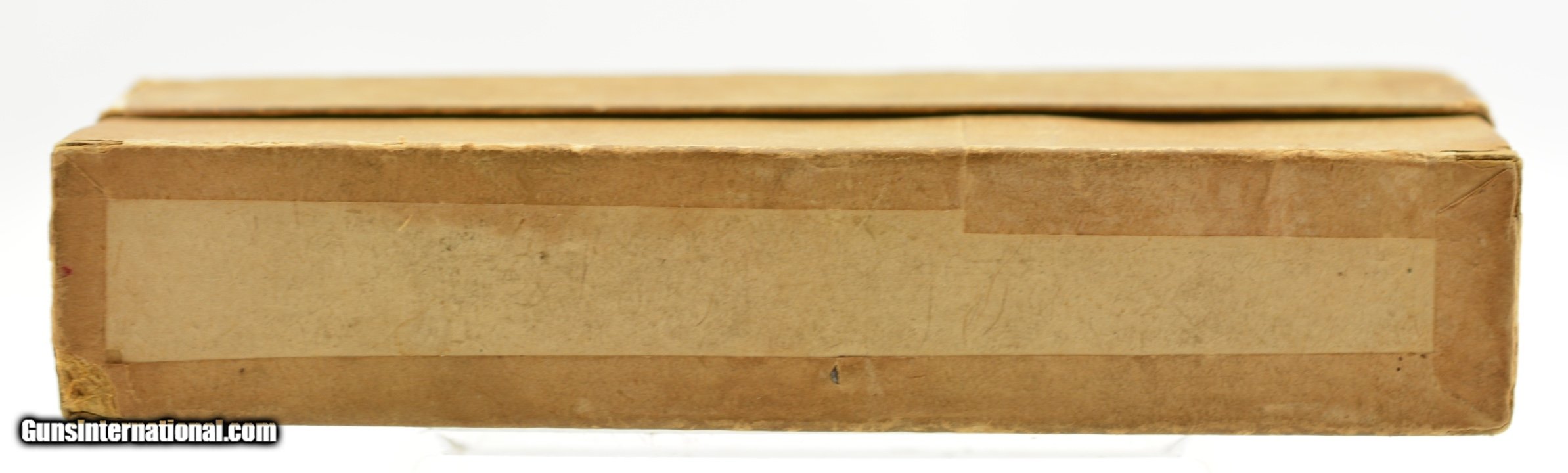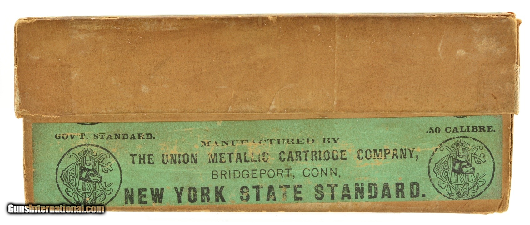 Description: This is a full box, 20 original rounds, of .50-70 ammunition manufactured by the Union Metallic Cartridge Company (UMC). The early 1880's two piece buff box with green and black labels has a call out for the "New York State Standard" in addition to "Government" standard and is notable for the Double Dog UMC logos on both the top and side. The box is solid with professional repairs to the inside edges and shows some mild age soiling and slight flaking to the labels. The cartridges appear native to the box and are in excellent condition with age splits on several of the rims. A seldom-seen box in very good plus condition. SOLD |