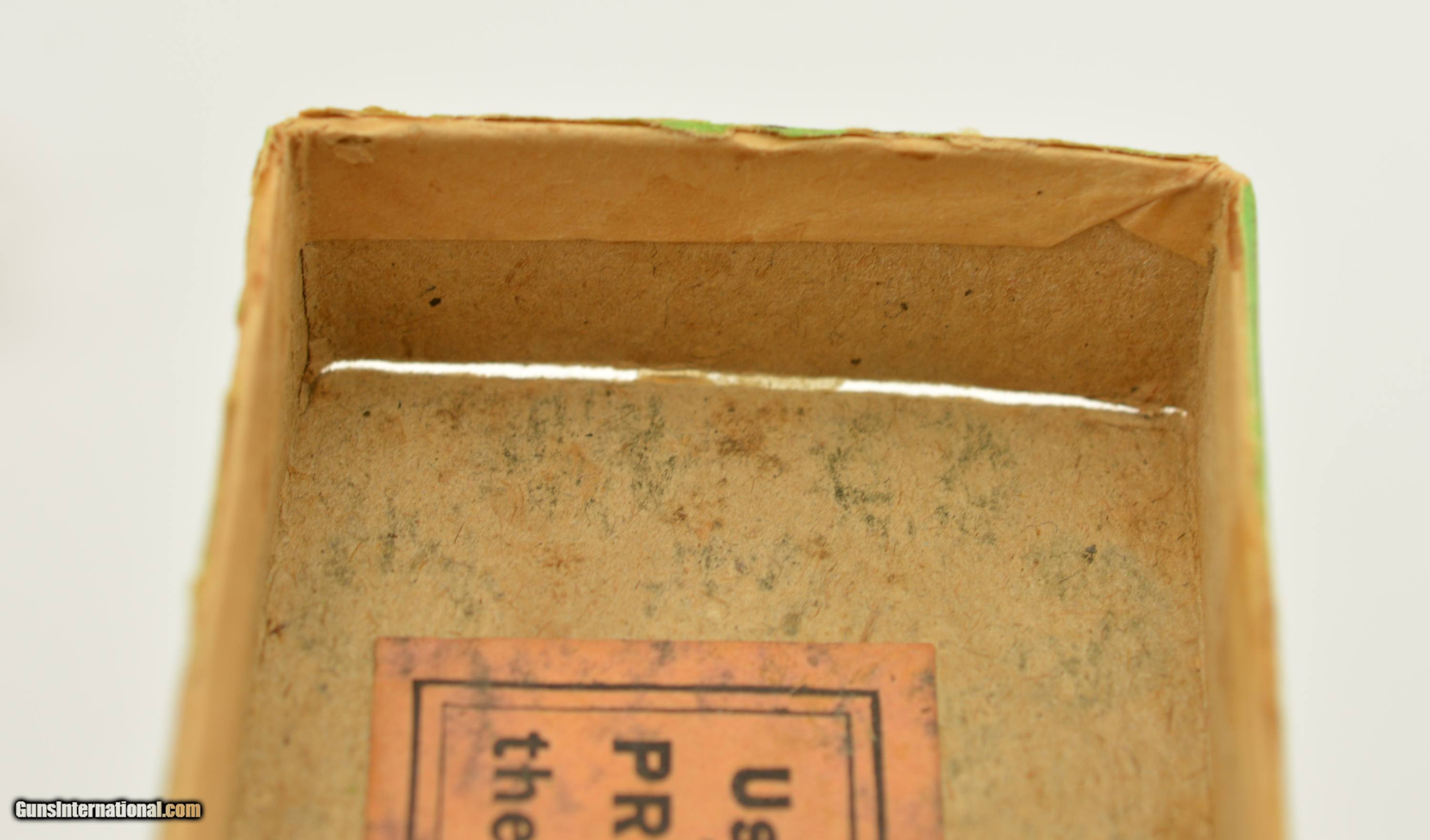 Description: This is a full box, 50 original rounds, of .38-44 S&W Target ammunition manufactured by U.M.C. With 146 grain bullets and 20 grains of powder. The reduced powder load has the bullet loaded inside the case and the side label has a Smith & Wesson endorsement stating they are to be used in S&W target revolvers. The box is now solid with professional repairs to the inside edges and an older tape repair on the outside cover. The primary label has a very nice cartridge cut and shows mild flaking along with some soiling and the side label is fully intact with some minor flaking. The cartridges are in excellent condition. A seldom-seen and short lived caliber. SOLD Manufacturer: Remington Model: Ammo Caliber Info: .38-44 Gauge Info: .38-44 |