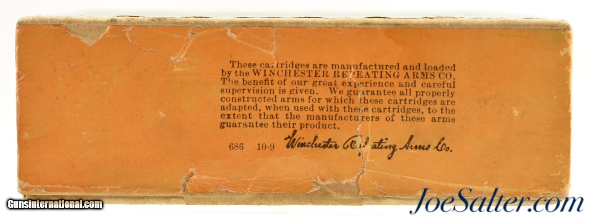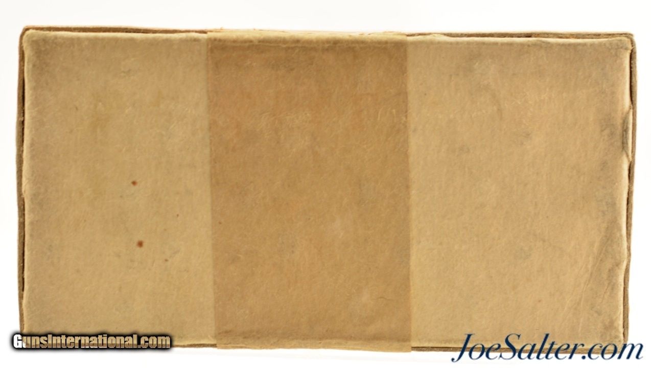 Description: This is a rare full and sealed box, 50 original rounds, of .44 Colt Center Fire black powder ammunition manufactured by Winchester with "9-6" date code on the primary and "10-9" on the side label with 210 grain bullets. . The box has an excellent primary green and black label with a very nice cartridge cut showing some very minor staining. The side seal label is intact with mid label cracks and slight crush that may have been gently repaired in the past and is now stable with several very small flakes missing on either side. A now rare caliber with a sealed box that will make an excellent display item. SOLD |