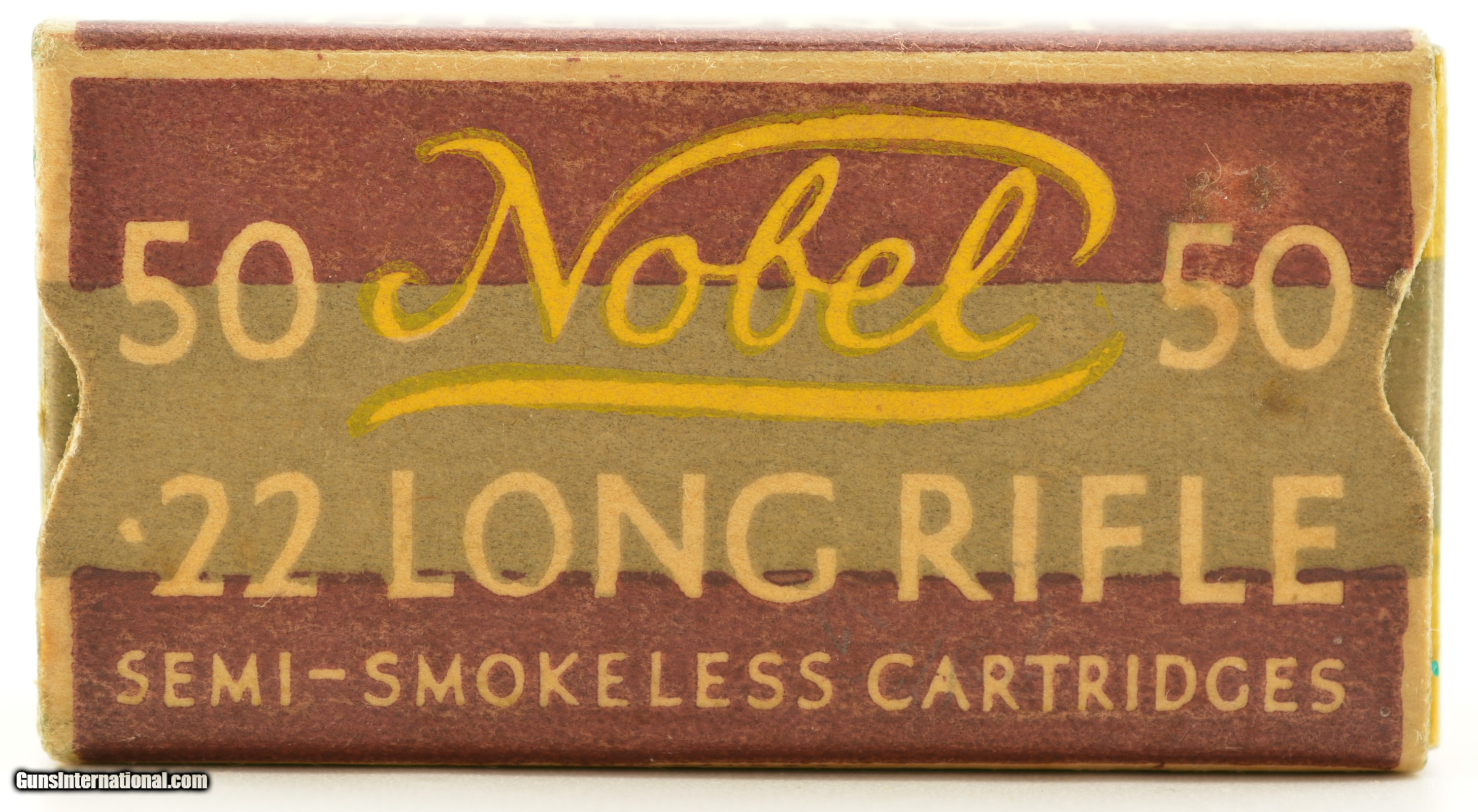 Description: This is a full, 50 original rounds, box of .22 LR semi-smokeless ammunition manufactured by Nobel Industries Ltd. Of Birmingham, England. Part of the original Nobel Dynamite company fame this iteration in England was a short lived company name in England it produced .22 ammunition from 1920 to 1926 under the Nobel label before merging into Imperial Chemical Industries. The one piece red brown and yellow box is in excellent condition with clear graphics and crisp edges. The cartridges have darkened with age, showing a “N" head stamp and have spots of verdigris on some edges. A seldom seen box that would be a great addition to any collection. SOLD Manufacturer: Nobel Model: Ammo Caliber Info: .22 Gauge Info: .22 |