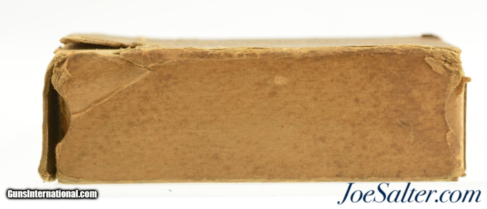 Description: This is a partial box, 33 original rounds, of .30 Auto Pistol ball cartridges for use in the Pedersen Device in 1903 Springfield rifles manufactured by Remington UMC. Built originally for use in WWI trench warfare the device converted the standard issue rifles into semi-automatic ones with 40 round magazines. Most of them were destroyed as they never saw service and the same with the ammunition. The box is marked "40-CAL. 30 AUTO. PISTOL / BALL CARTRIDGES / MODEL OF 1918 / THE REMINGTON ARMS / UNION METALLIC CARTRIDGE COMPANY, INC. / BRIDGEPORT, CONN." The cartridges are headstamped "R A 18" and remain in excellent condition. The box is missing one flap with the other detached having a small piece of missing paper on the left corner with edge and corner wear. A rare item for the advanced US Military and WWI collector. Price: $145.00 Contact Seller |