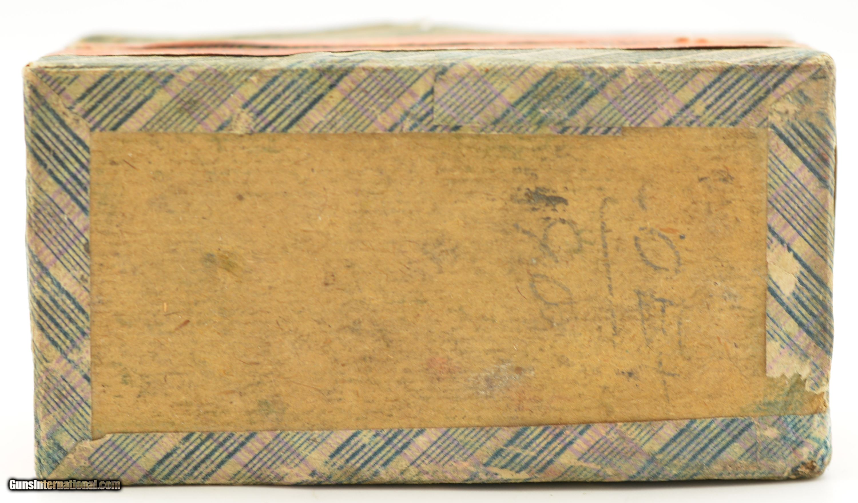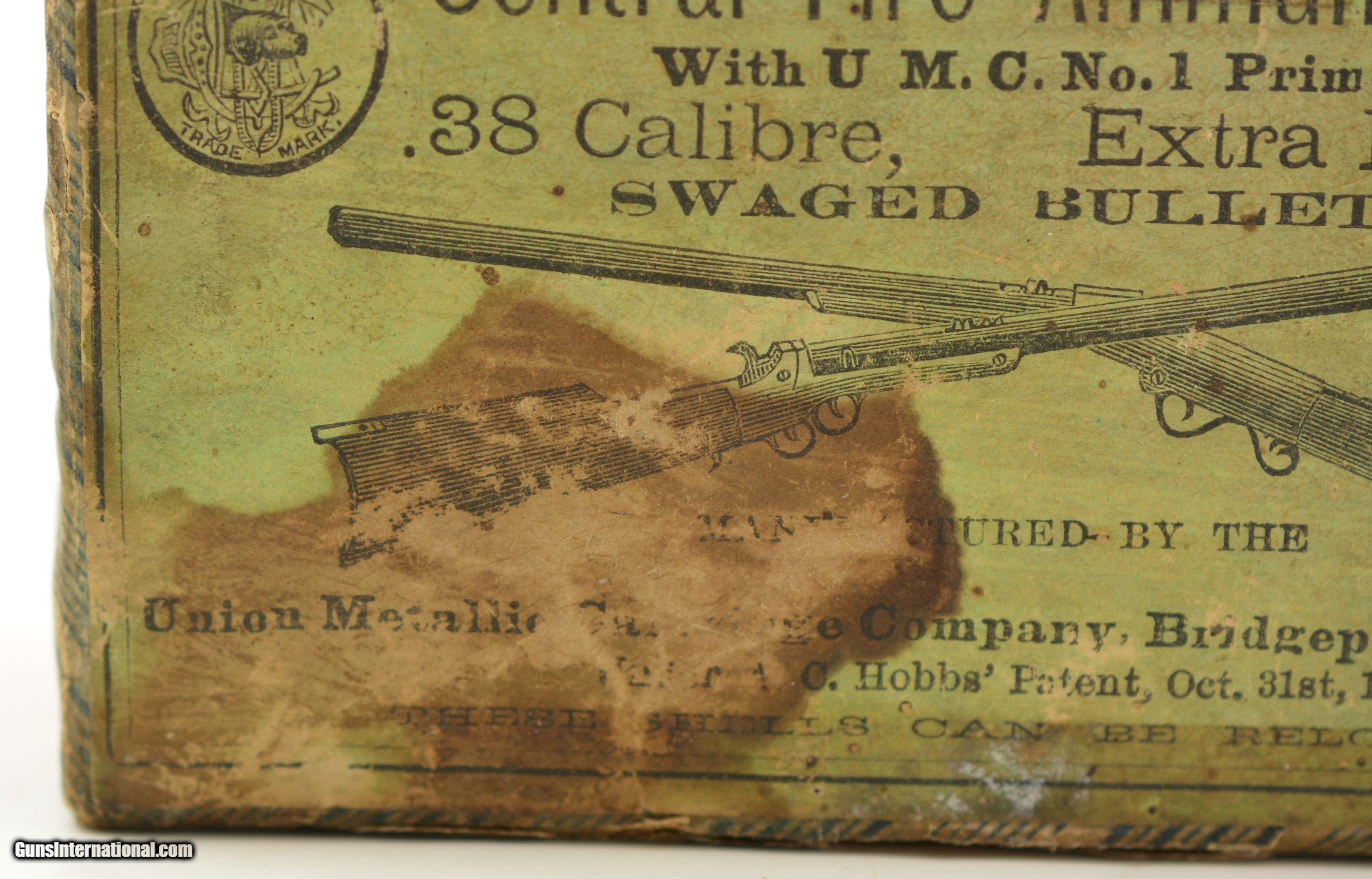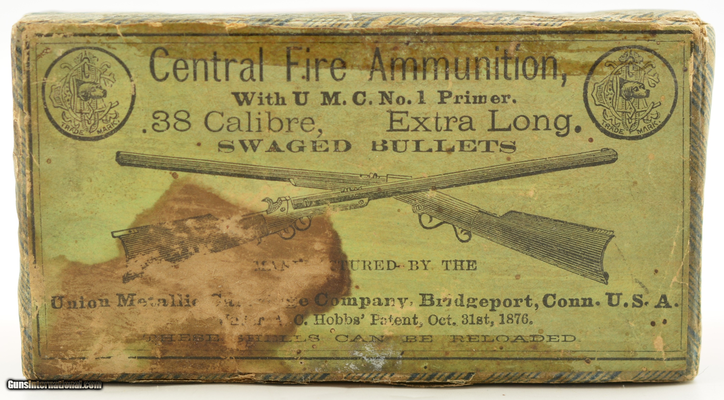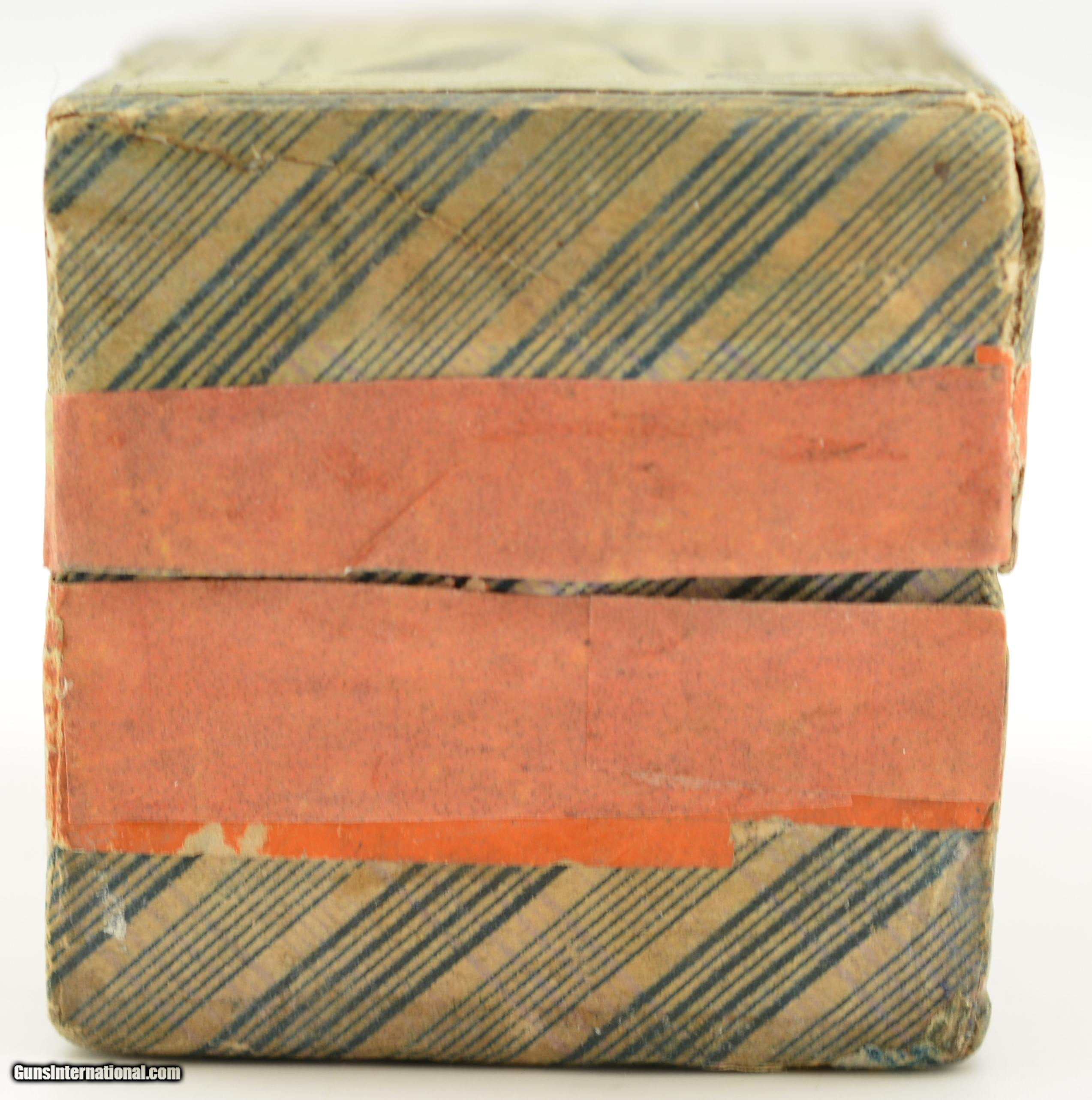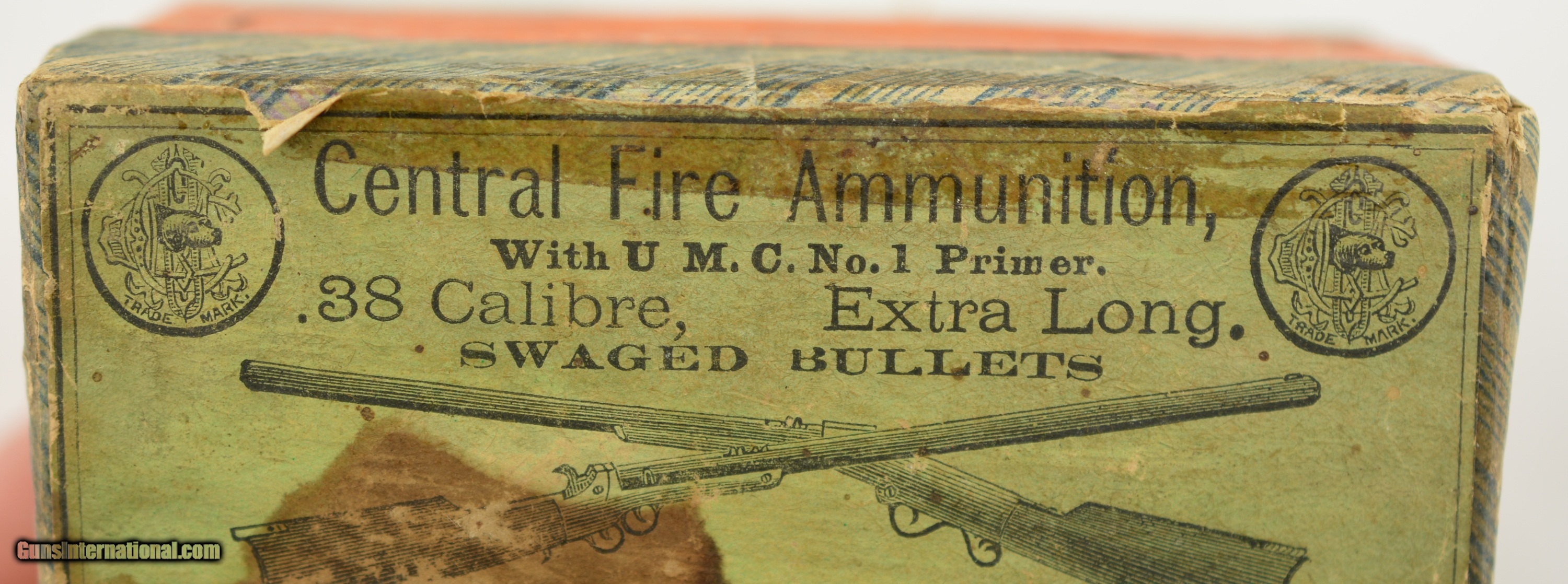 Description: This is a rare early box of UMC .38 Calibre, Extra Long center fire ammunition. The two piece, black powder box, has the desirable "crossed rifles" art work along with the early UMC logo with the dog head. Collectible in any condition this box solid with very good near excellent graphics save for the large stain in lower left quadrant. The box contains 47 rounds that appear original with oxidized bullet lube, light casing tarnish and some verdigris and light corrosion on a few cases and heads. A great collectible box in a rare caliber. SOLD |