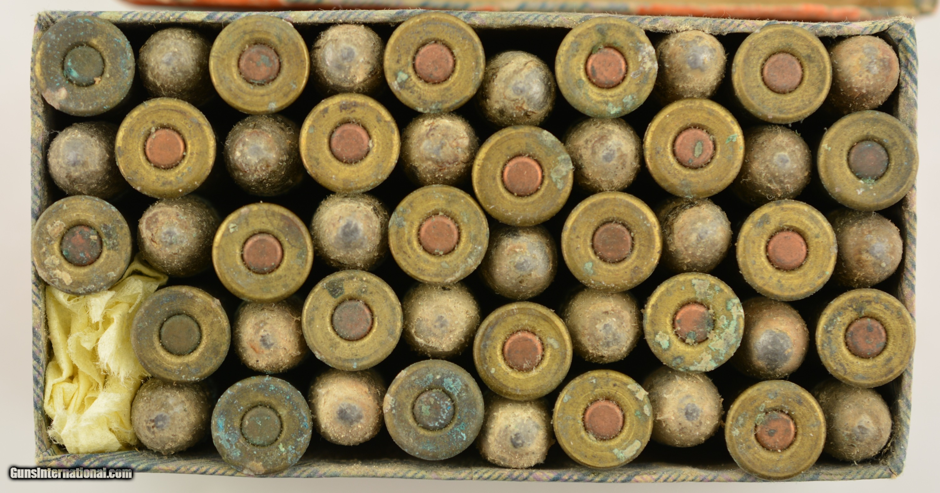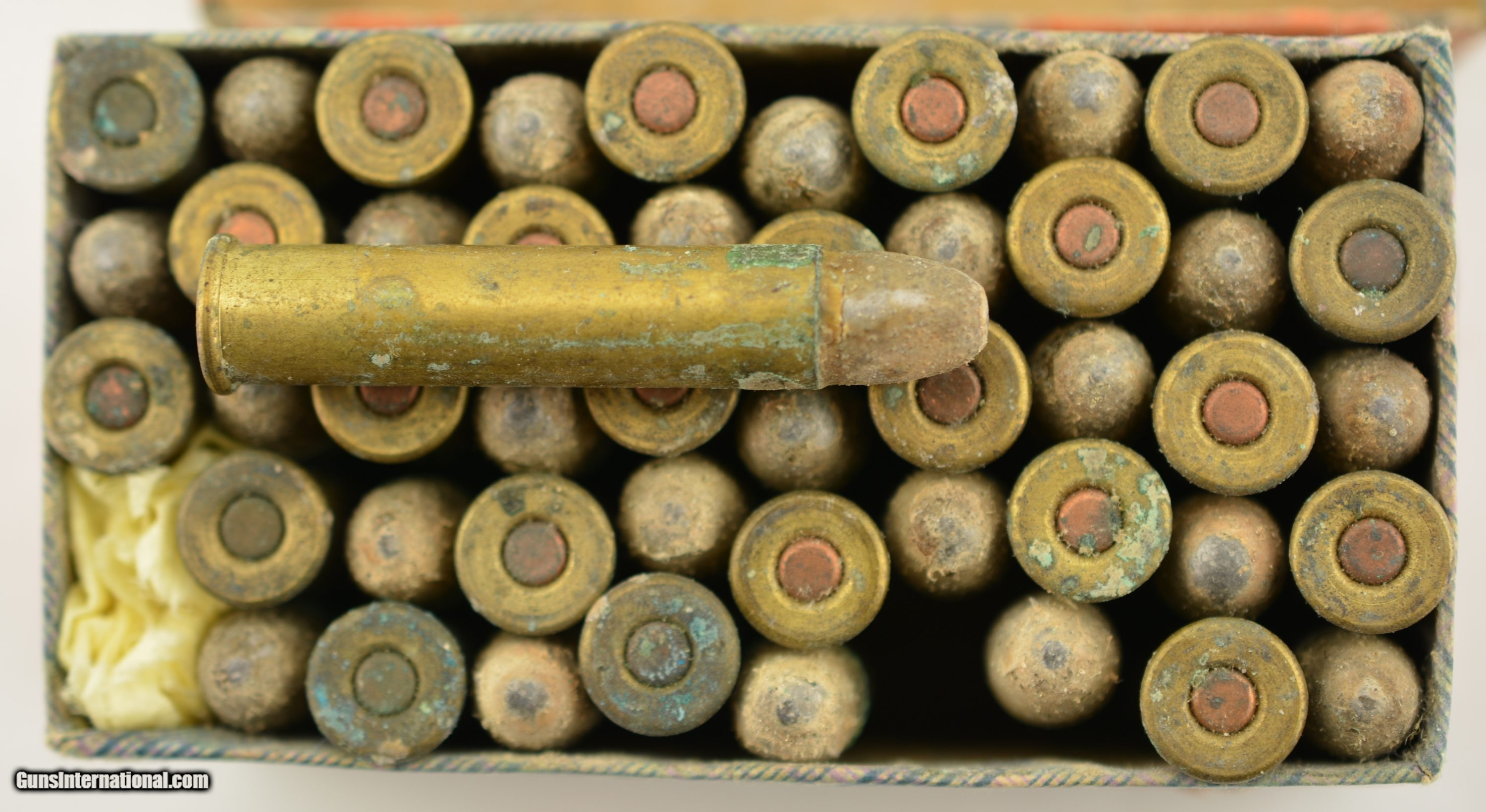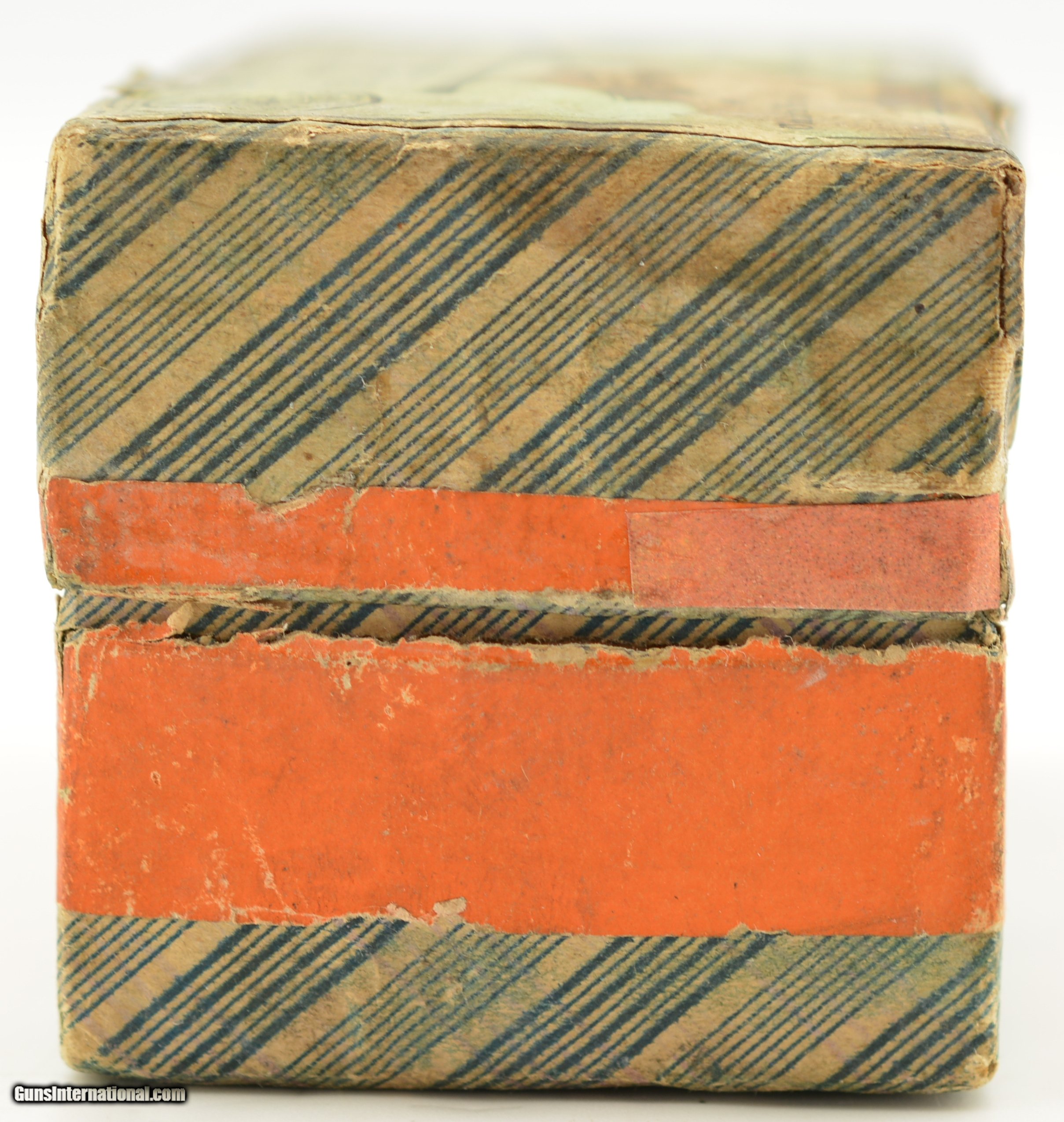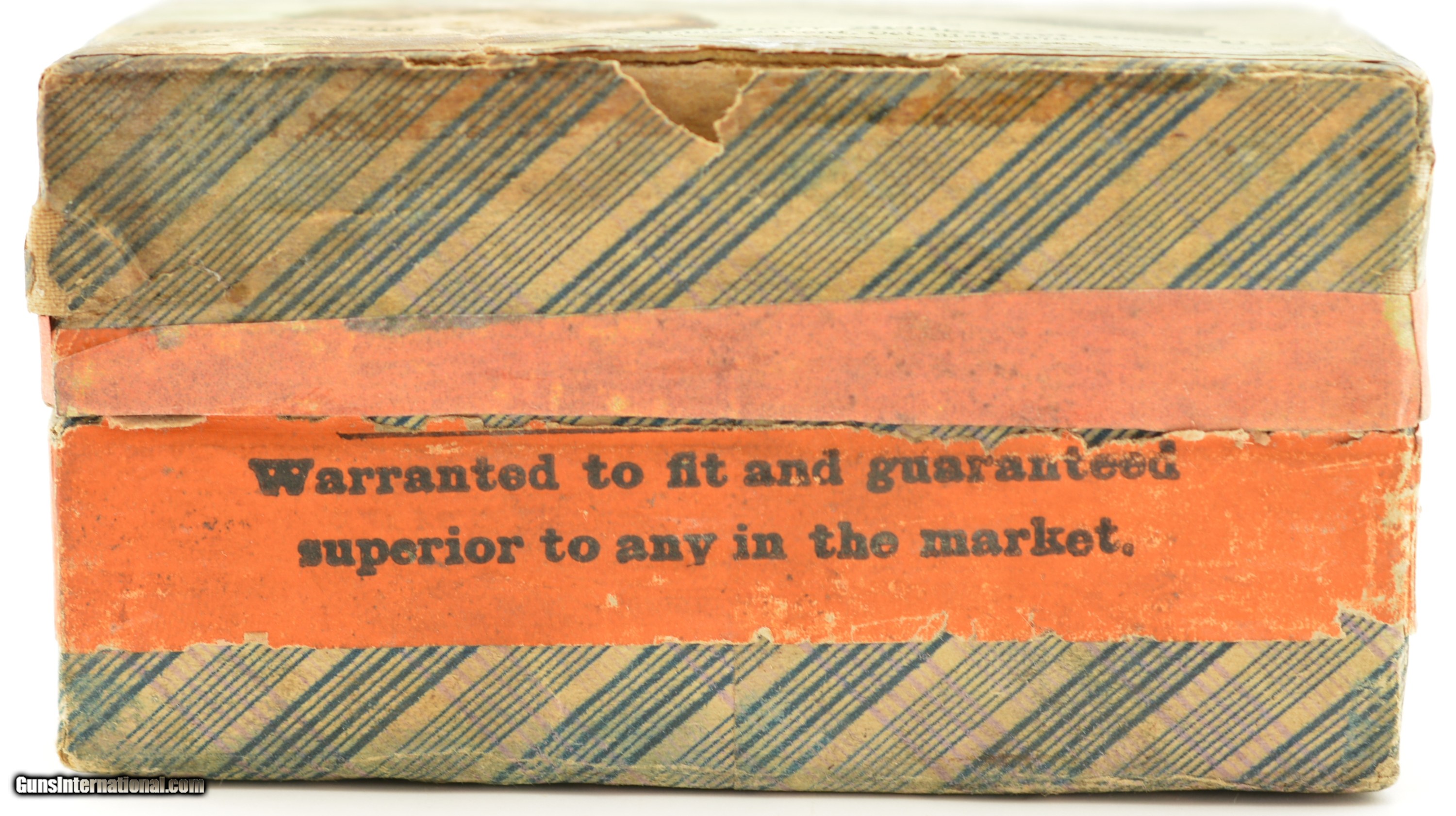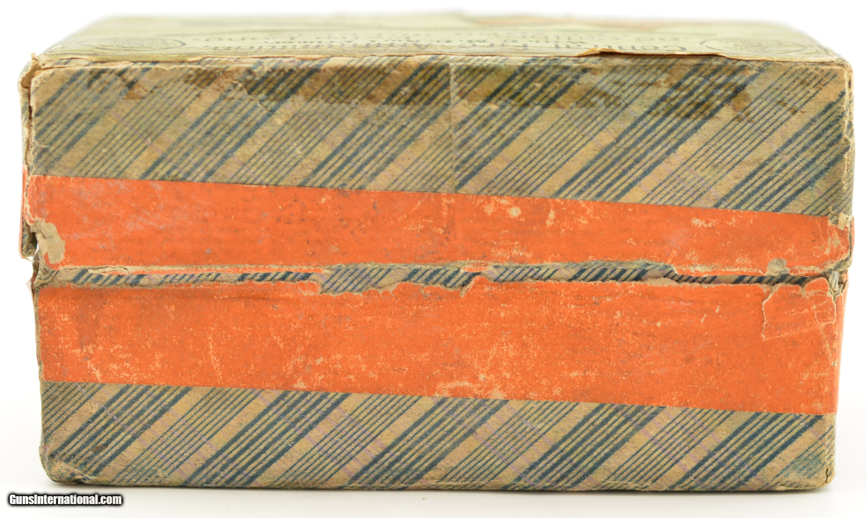 Description: This is a rare early box of UMC .38 Calibre, Extra Long center fire ammunition. The two piece, black powder box, has the desirable "crossed rifles" art work along with the early UMC logo with the dog head. Collectible in any condition this box solid with very good near excellent graphics save for the large stain in lower left quadrant. The box contains 47 rounds that appear original with oxidized bullet lube, light casing tarnish and some verdigris and light corrosion on a few cases and heads. A great collectible box in a rare caliber. SOLD |