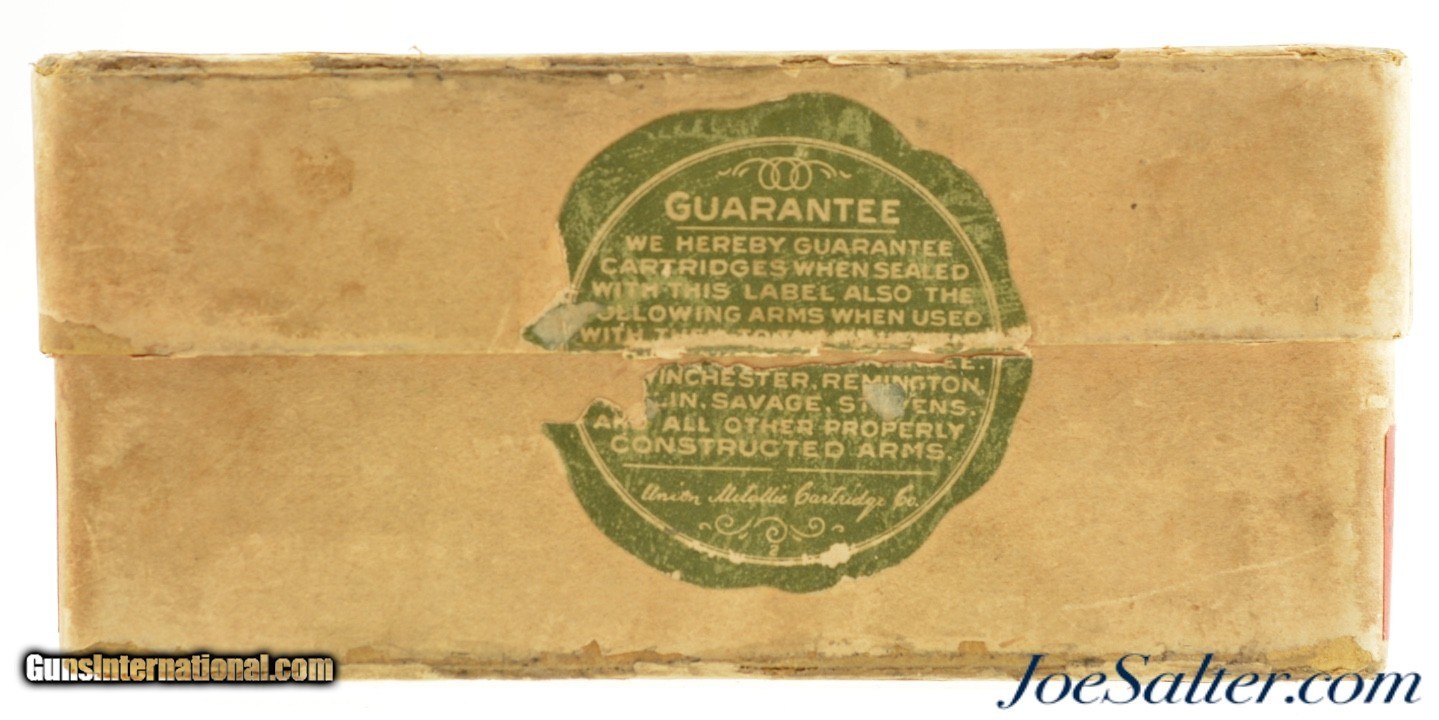 Description: This is a partial box, 18 rounds, of .45-70 Marlin black powder ammunition manufactured by UMC with 405 grain flat nose solid head lead bullets. The two piece box is solid with small pieces missing on the top corners having excellent graphics showing an excellent cartridge cut with overall mild age soiling. The cartridges are in excellent condition with slight age darkening on the heads. These are correct 45-70 Marlin rounds with the designated small No. 1 ½ primers and flat lead bullets. The do lack the "S H" as shown on the cartridge cut and are likely a later loading using up the earlier solid head call out boxes that were popular in the 1880's. Price: $295.00 Contact Seller |