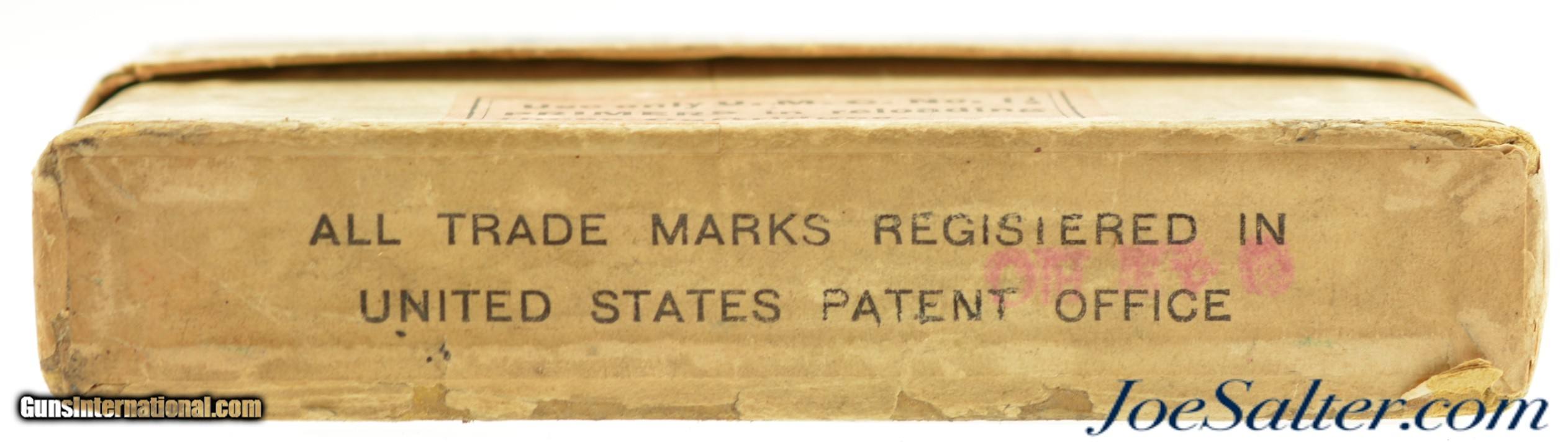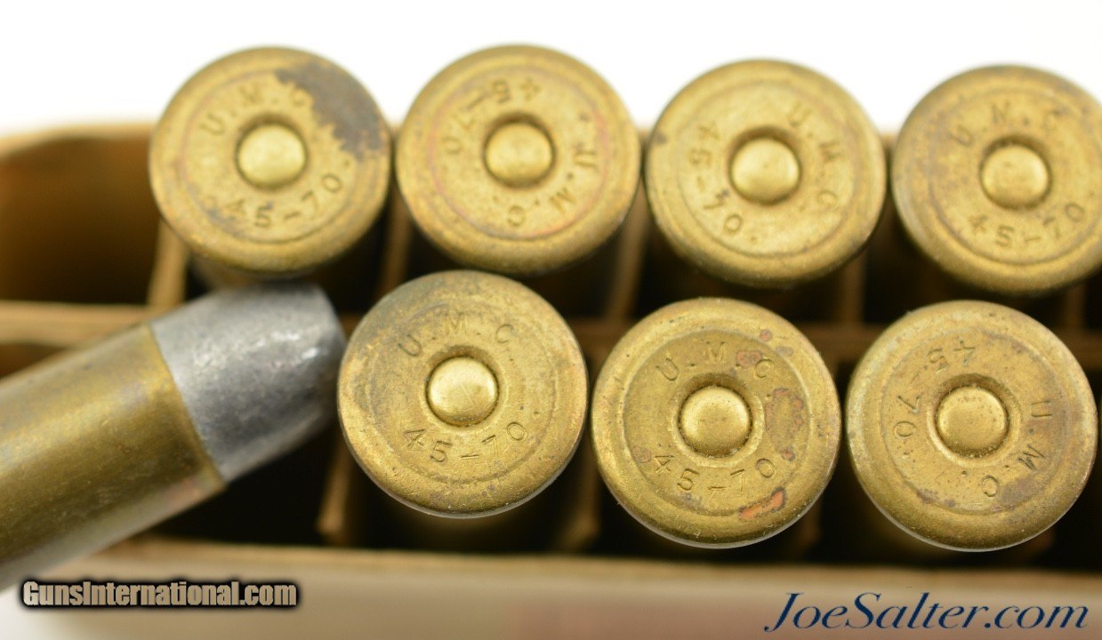 Description: This is a partial box, 18 rounds, of .45-70 Marlin black powder ammunition manufactured by UMC with 405 grain flat nose solid head lead bullets. The two piece box is solid with small pieces missing on the top corners having excellent graphics showing an excellent cartridge cut with overall mild age soiling. The cartridges are in excellent condition with slight age darkening on the heads. These are correct 45-70 Marlin rounds with the designated small No. 1 ½ primers and flat lead bullets. The do lack the "S H" as shown on the cartridge cut and are likely a later loading using up the earlier solid head call out boxes that were popular in the 1880's. Price: $225.00 Contact Seller |