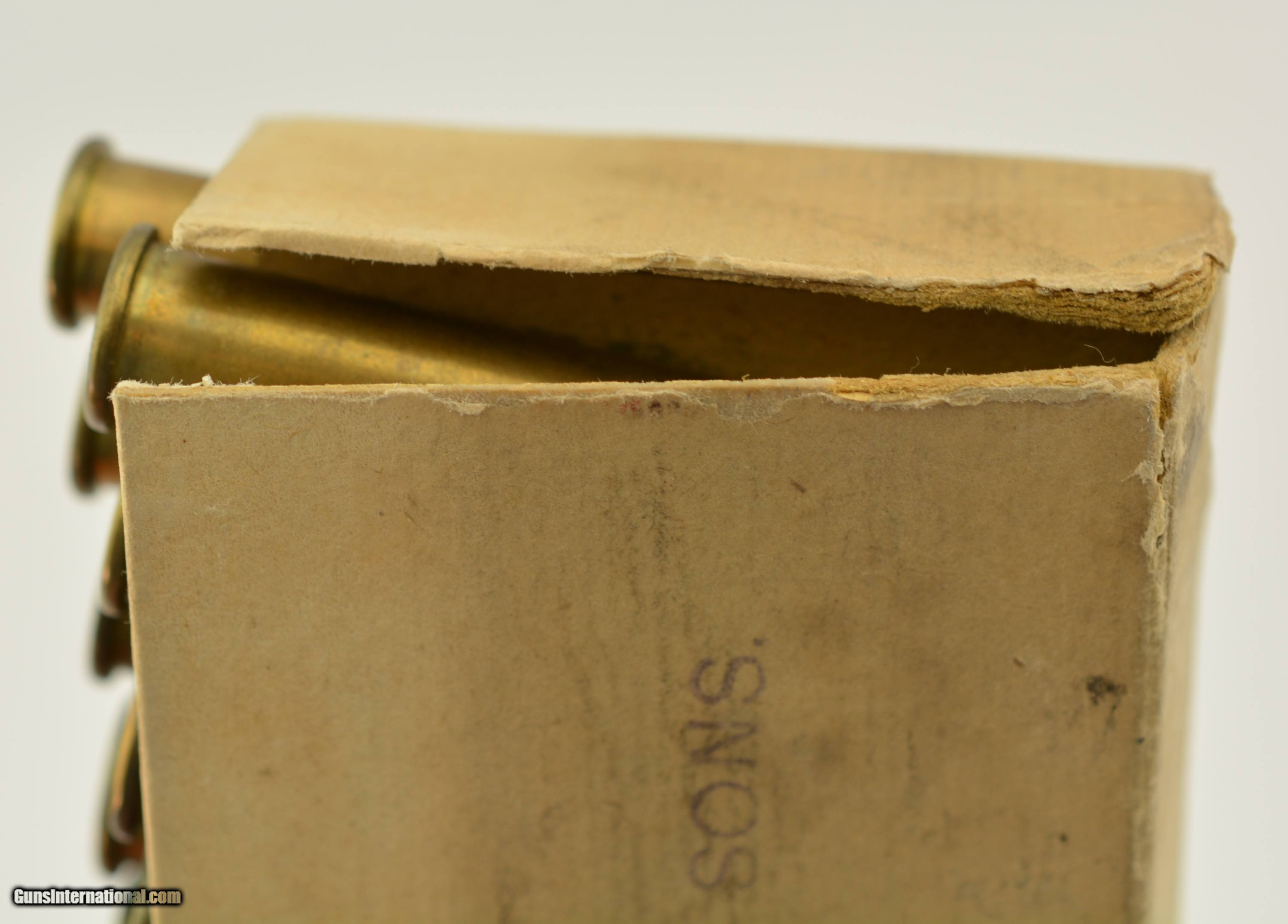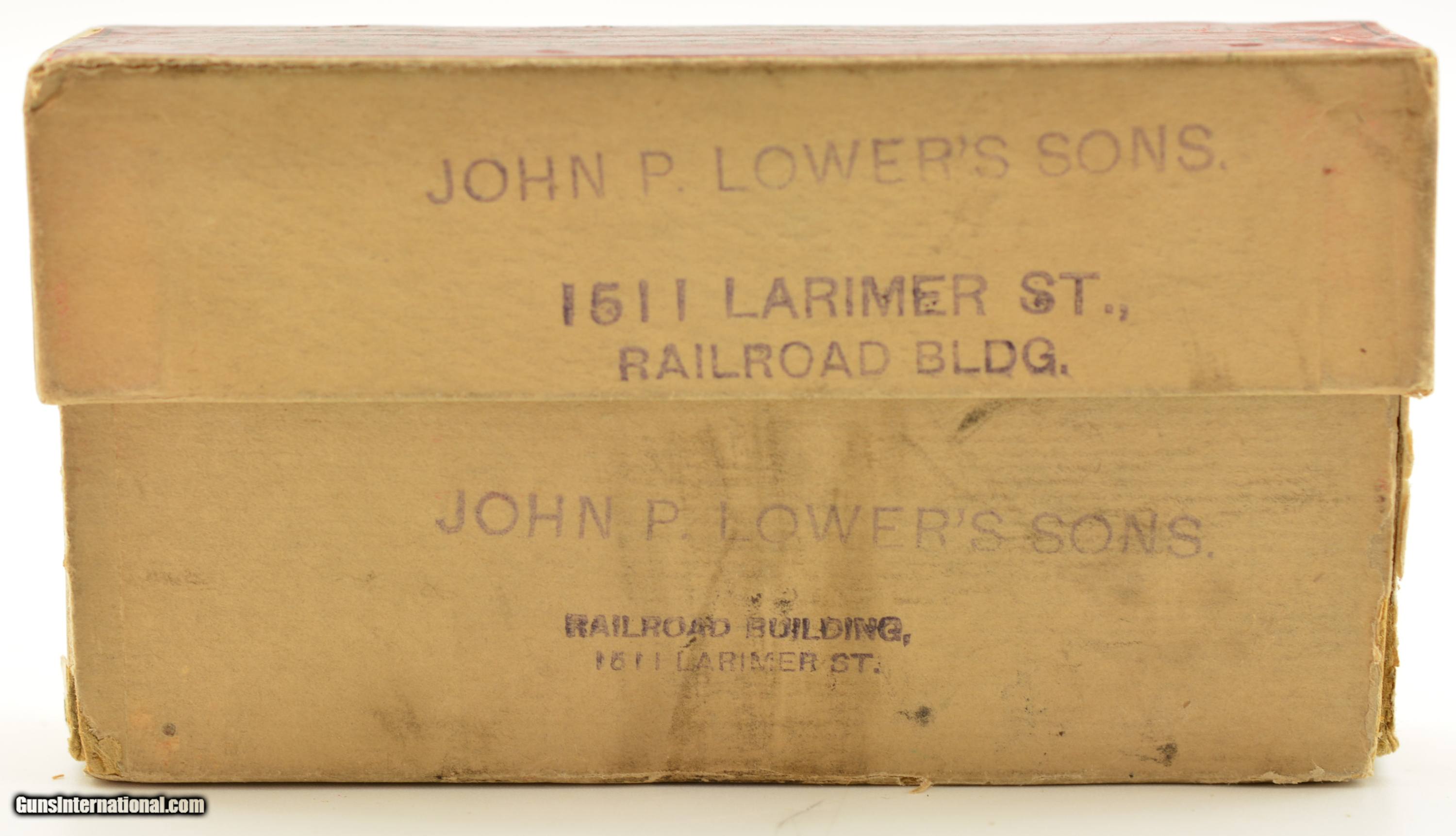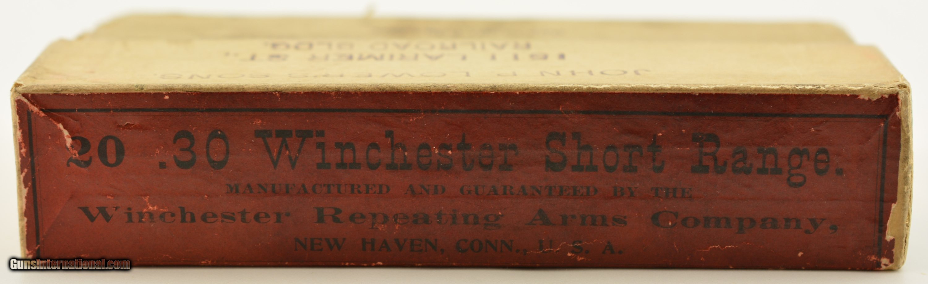 Description: This is a full box, 20 original rounds, of .30 Winchester (.30-30) in the scarce Short Range loading with 100 grain bullets and 6 grains of smokeless powder manufactured by Winchester. The square corner, two piece Variety 2 box (identified on P183 of One Hundred Years of Winchester Cartridge Boxes, 1856-1956 by Giles & Shuey) manufactured circa 1897-1898. The box is in very fine to near excellent condition with an excellent primary label and bright yellow sunbust label stamped with the seller "JOHN P LOWER"S SONS" on the sides having repairable seam separation on the bottom and side edges. The wood inserts are present and the cartridges are in near excellent condition with slight age darkening and some tiny spots of verdigris. SOLD Antique: Yes |