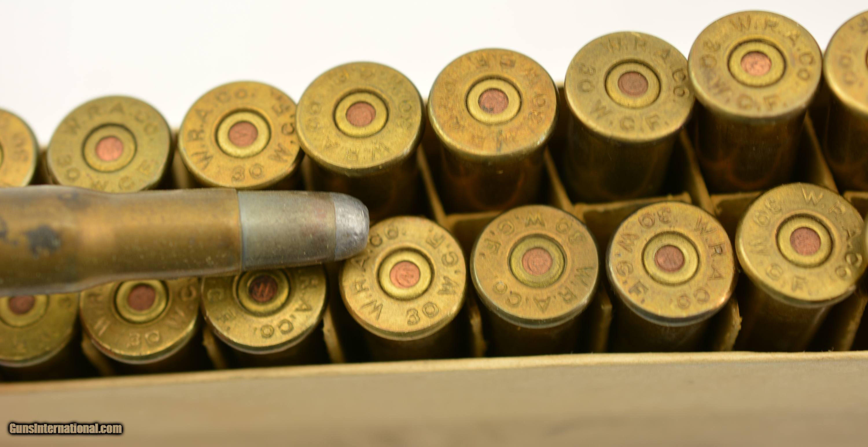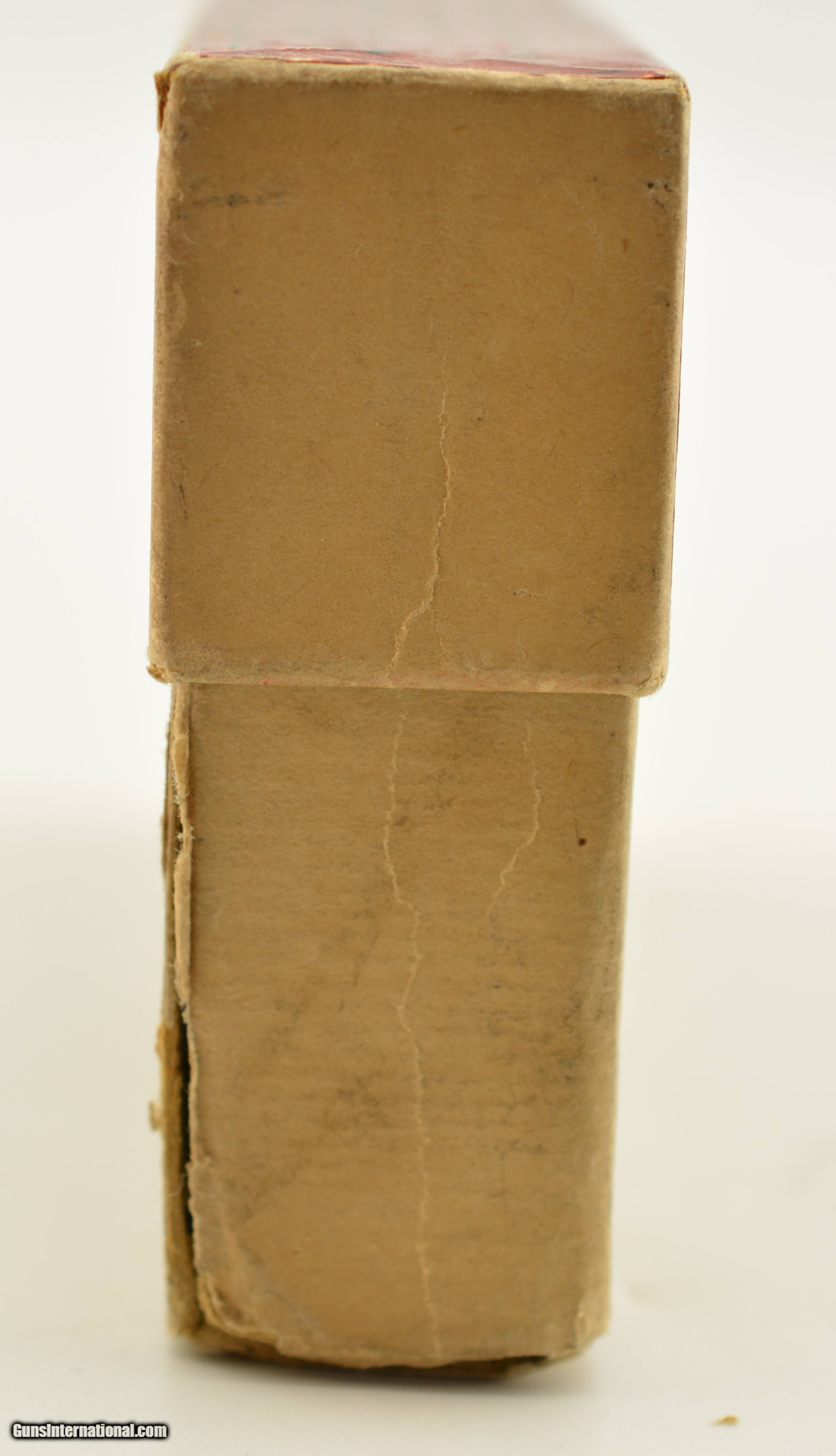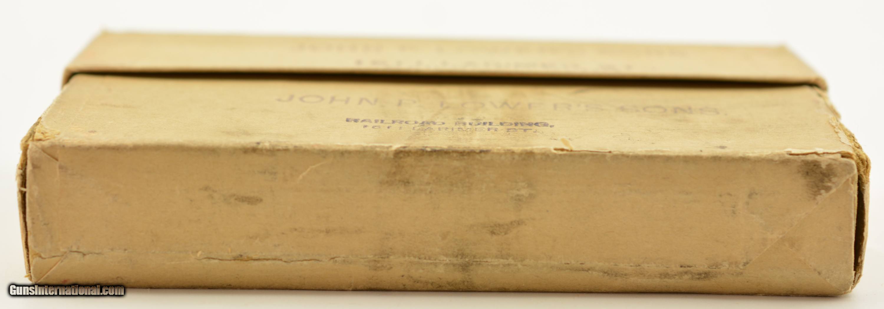 Description: This is a full box, 20 original rounds, of .30 Winchester (.30-30) in the scarce Short Range loading with 100 grain bullets and 6 grains of smokeless powder manufactured by Winchester. The square corner, two piece Variety 2 box (identified on P183 of One Hundred Years of Winchester Cartridge Boxes, 1856-1956 by Giles & Shuey) manufactured circa 1897-1898. The box is in very fine to near excellent condition with an excellent primary label and bright yellow sunbust label stamped with the seller "JOHN P LOWER"S SONS" on the sides having repairable seam separation on the bottom and side edges. The wood inserts are present and the cartridges are in near excellent condition with slight age darkening and some tiny spots of verdigris. SOLD Antique: Yes |