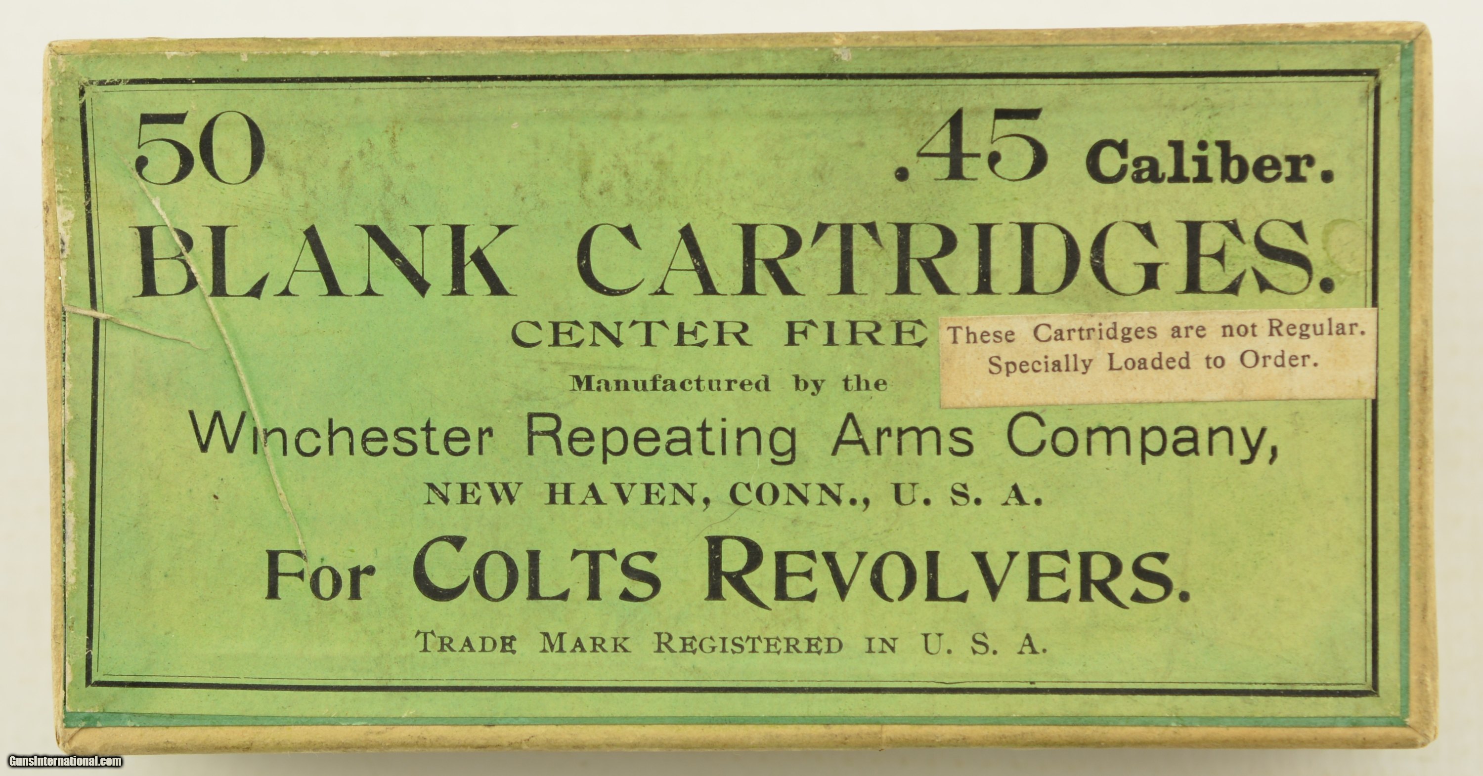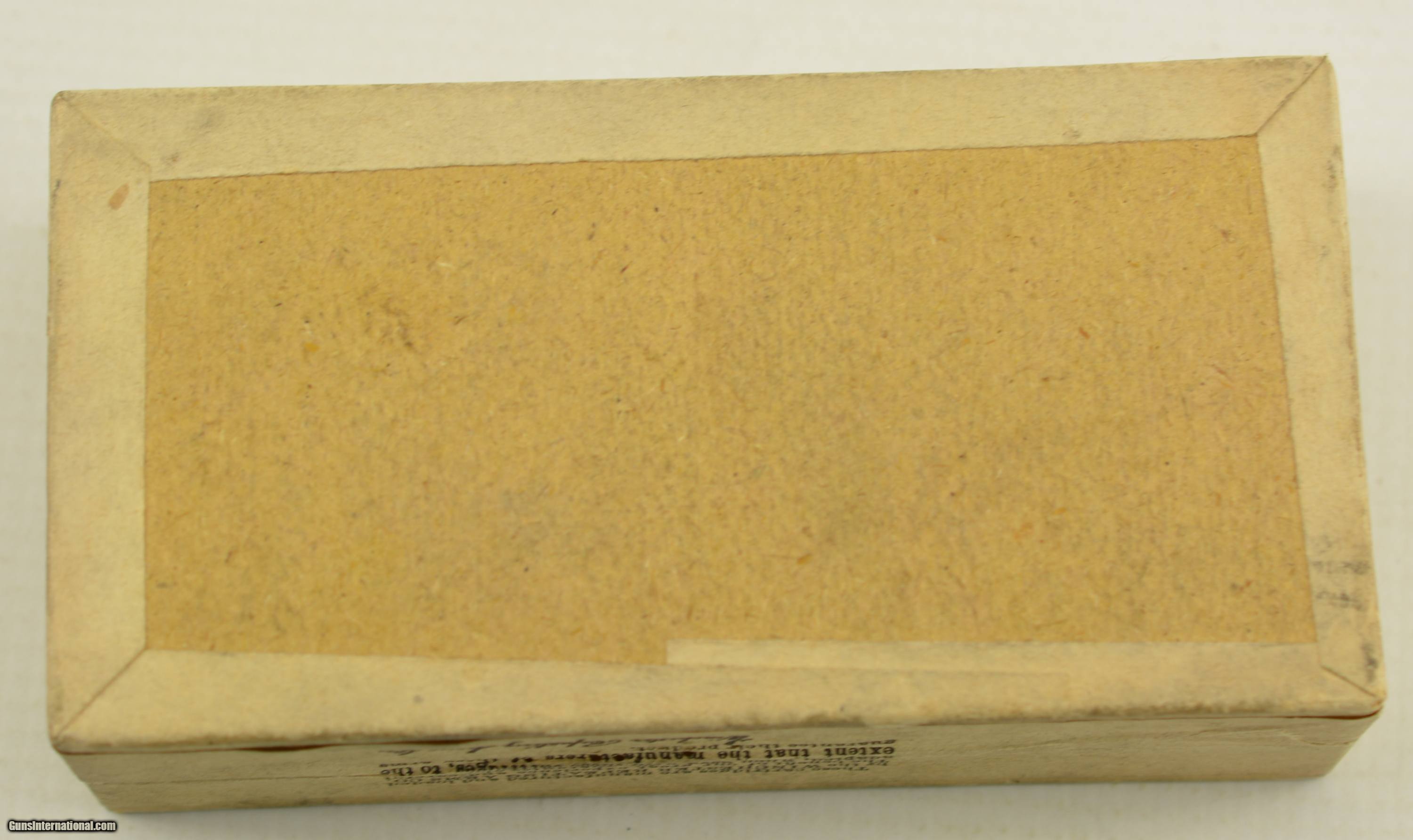 Description: This fifty round two piece half split box wears a most unusual over label reading:"These cartridges are not regular. Special loaded to order". Top label is quite plain with no codes and is obviously pasted over a different green label. Side sealing label is still attached along one long side, remainder was neatly cut and is all present. The Colt patent Fire Arms Company logo and rampant colt are on one side. Box contains 14 correct rounds and remains in excellent condition with bright clean labels. SOLD Manufacturer: Winchester Model: Ammo Caliber Info: .45LC Gauge Info: .45LC |
