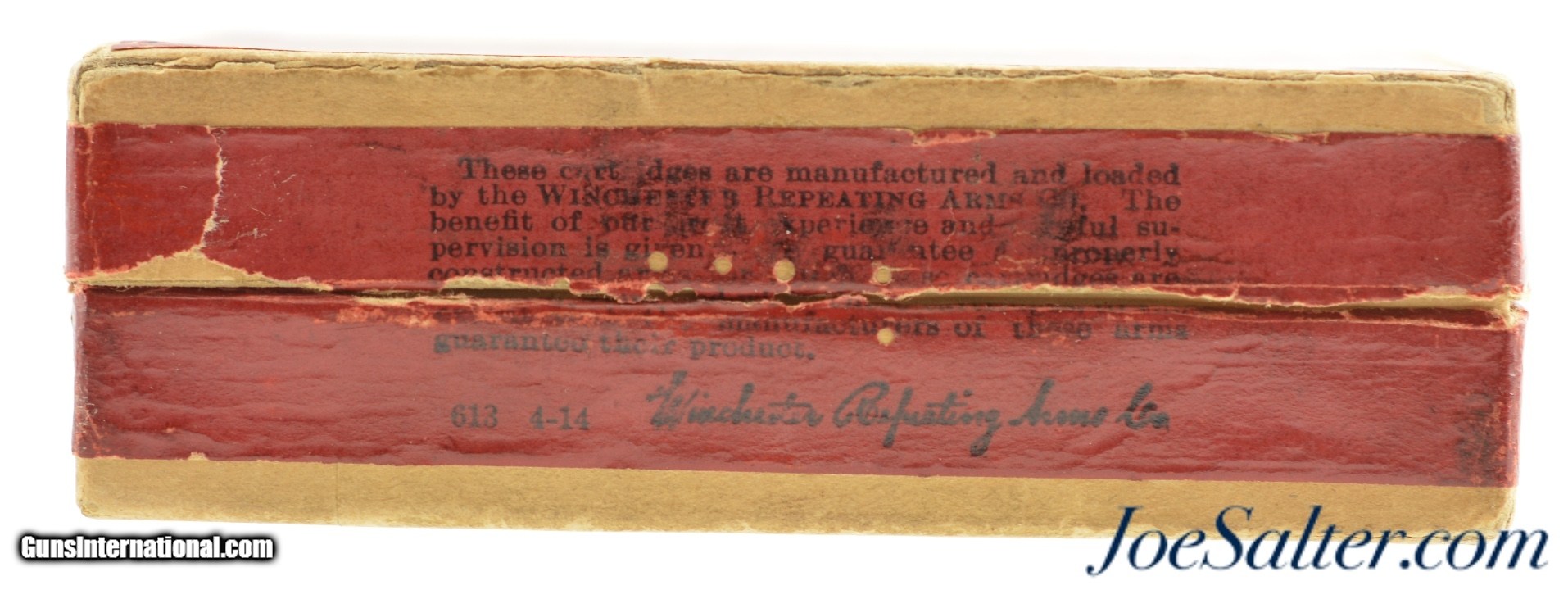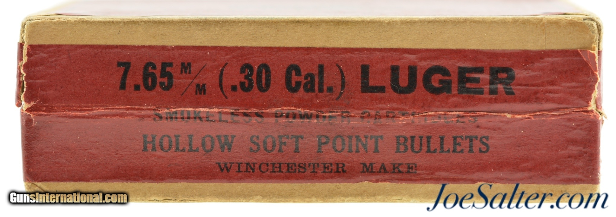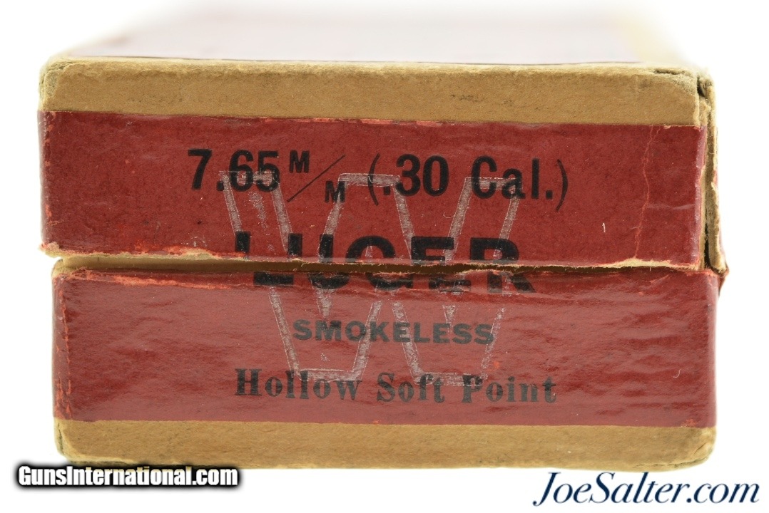 Description: This is a full box, 50 original rounds, of 7.65mm (.30 Luger) ammunition manufactured by Winchester with a "4-14" date code and 93 grain hollow soft point bullets. The two piece, red and black label, half-split box has beautiful, crisp graphics with an excellent cartridge cut and call out for "LUGER AUTOMATIC PISTOLS". The box is solid showing professional repairs to the inside top corners and only a small piece missing from the bottom side label. The cartridges are in near excellent condition with some age spots on a few of the heads. An excellent box to pair with your WWI Luger with the rare Hollow Soft Point loading!; SOLD |