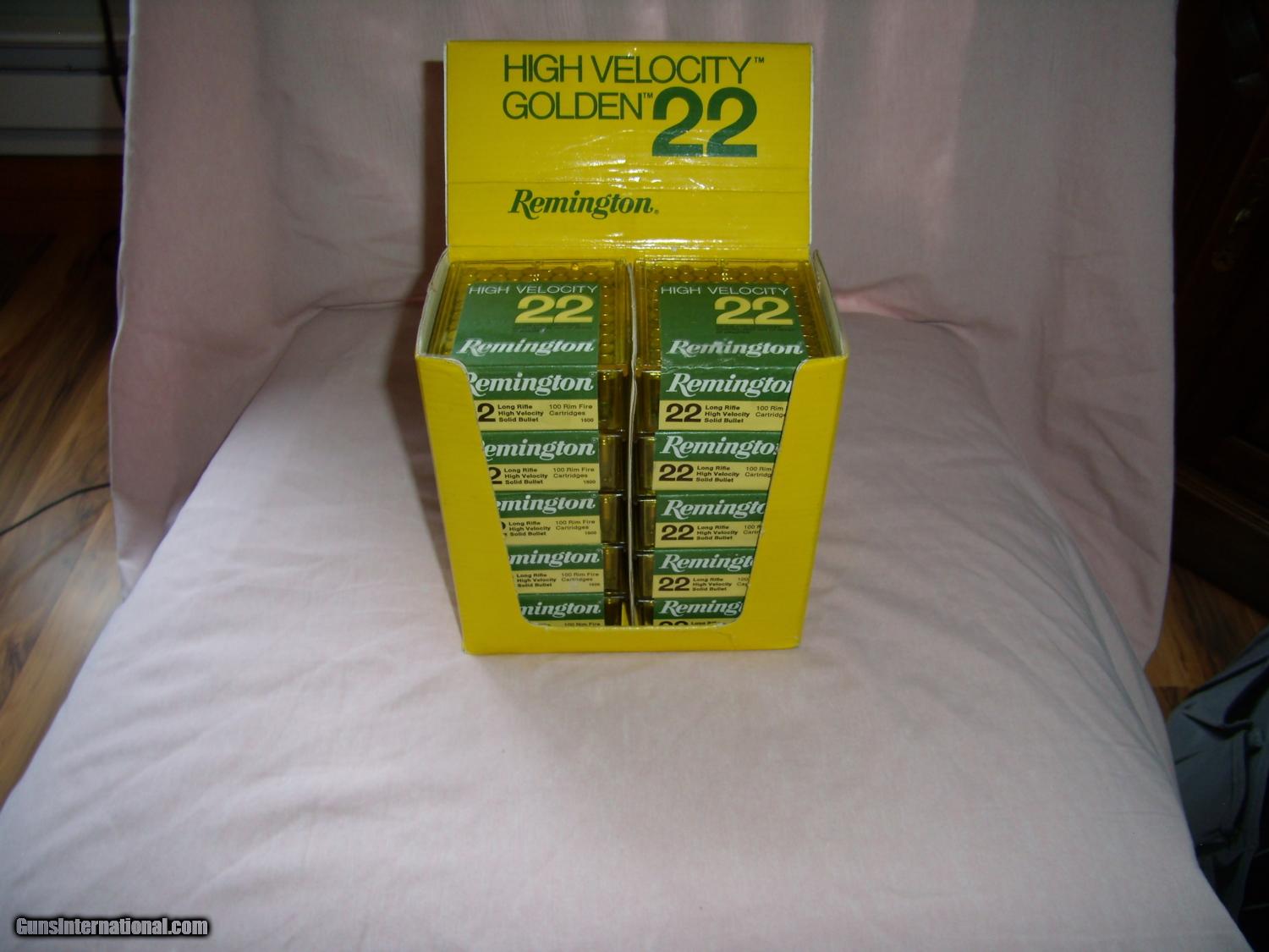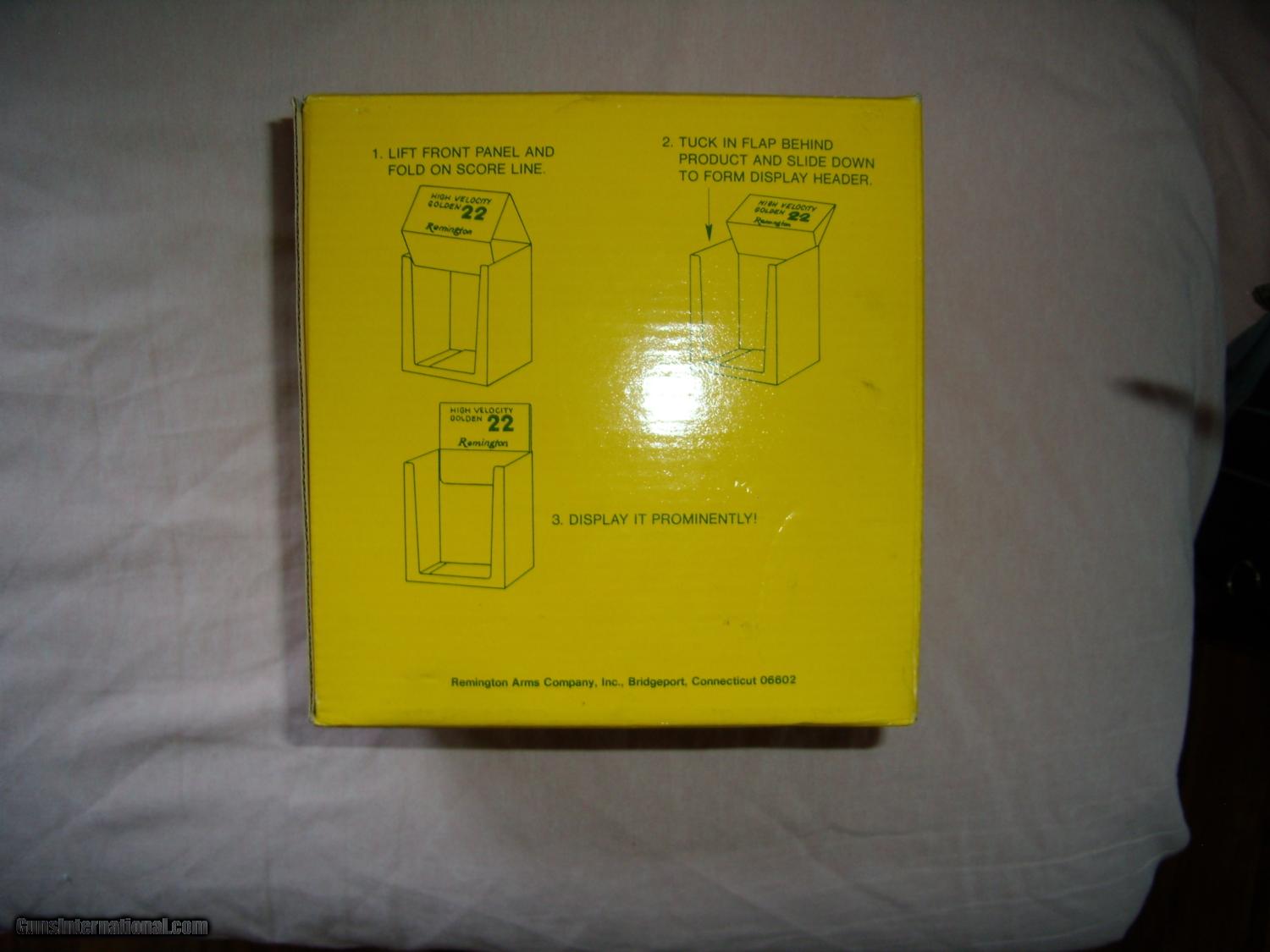 Description: 1400 RDS OF REMINGTON GOLDEN BULLETS, 100 RDS PER BOX, ALL UNOPENED. RETAILERS DISPLAY OF 1000 RDS IN LIKE NEW CONDITION. 4 ADDTIONAL BOXES, 1 CRACKED, OTHERS HAVE SCUFFED LABELS. THE DISPLAY IS IN NEW CONDITION. SOLD |