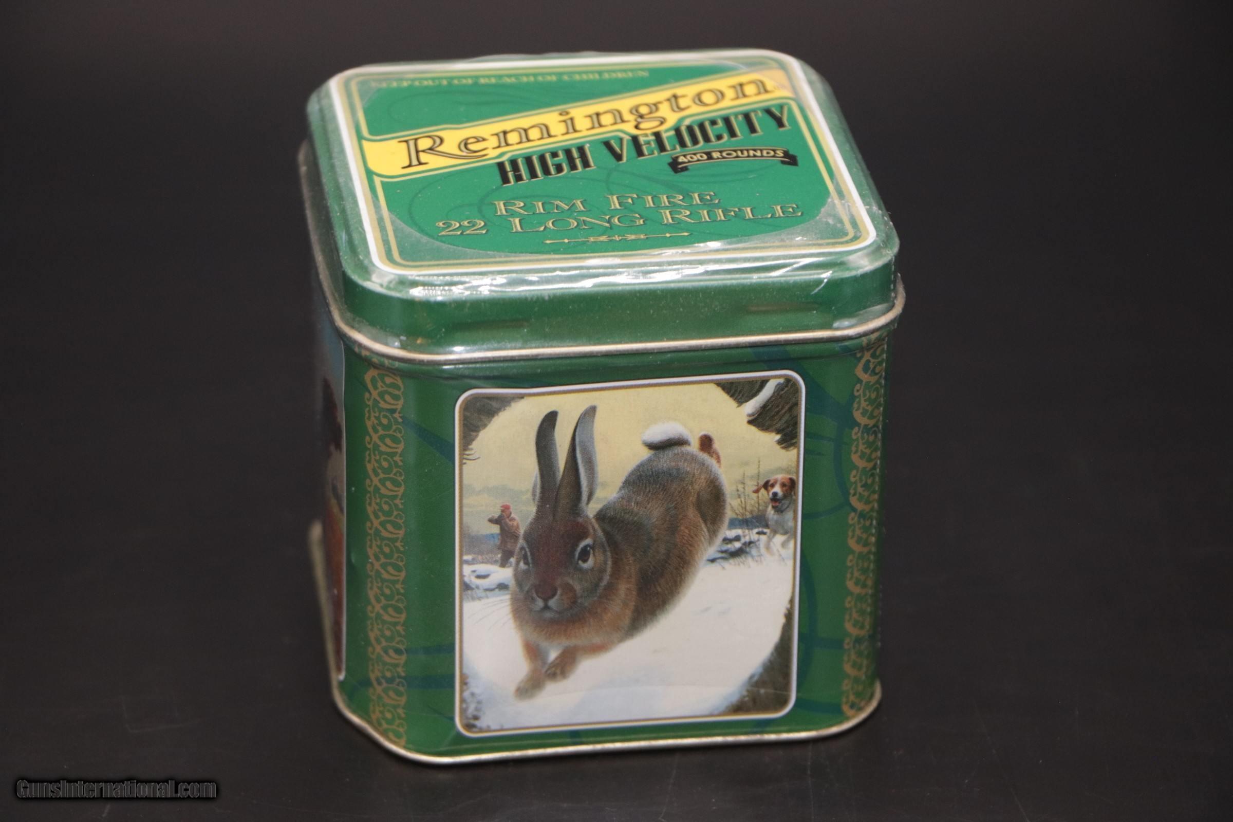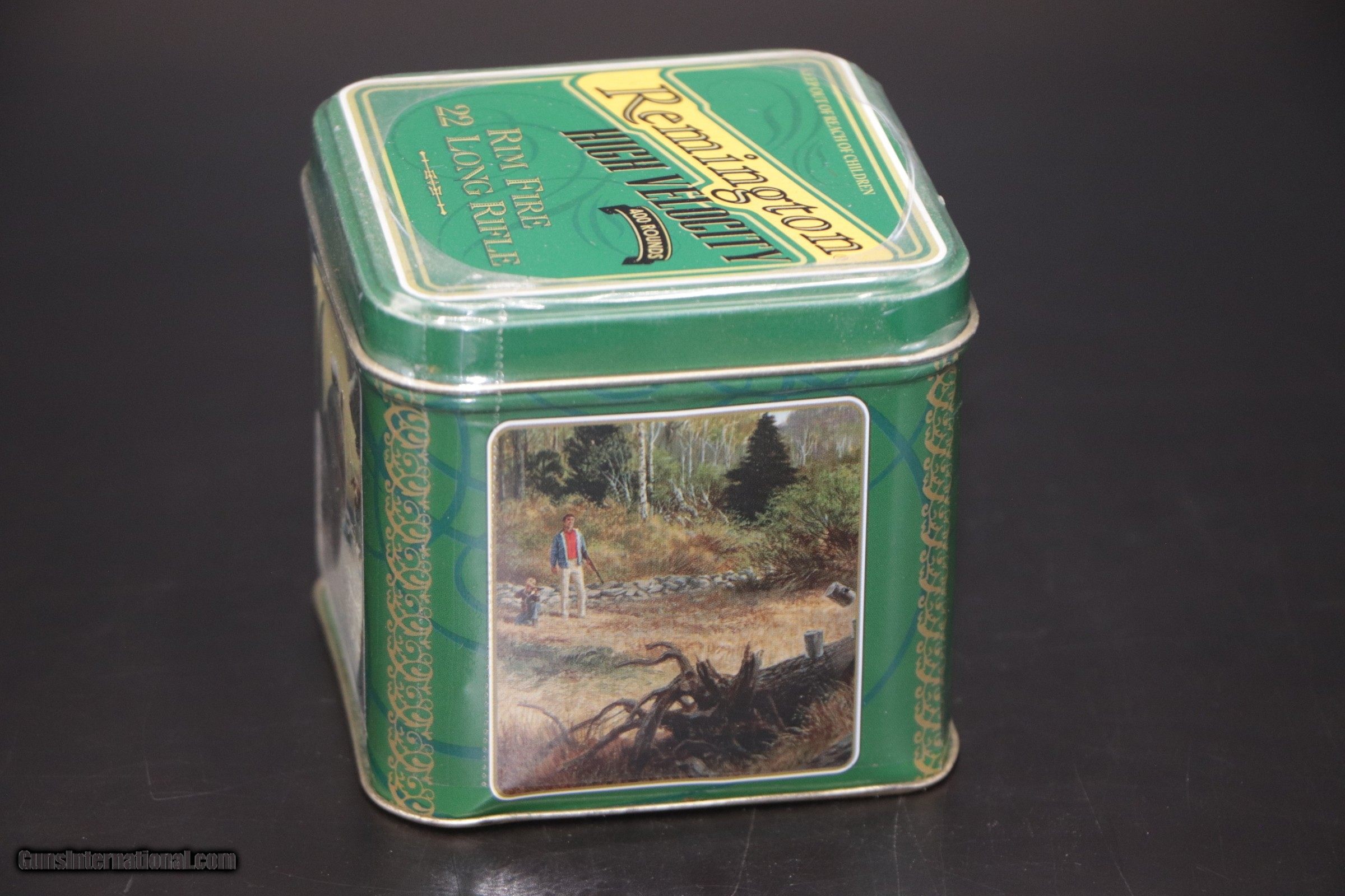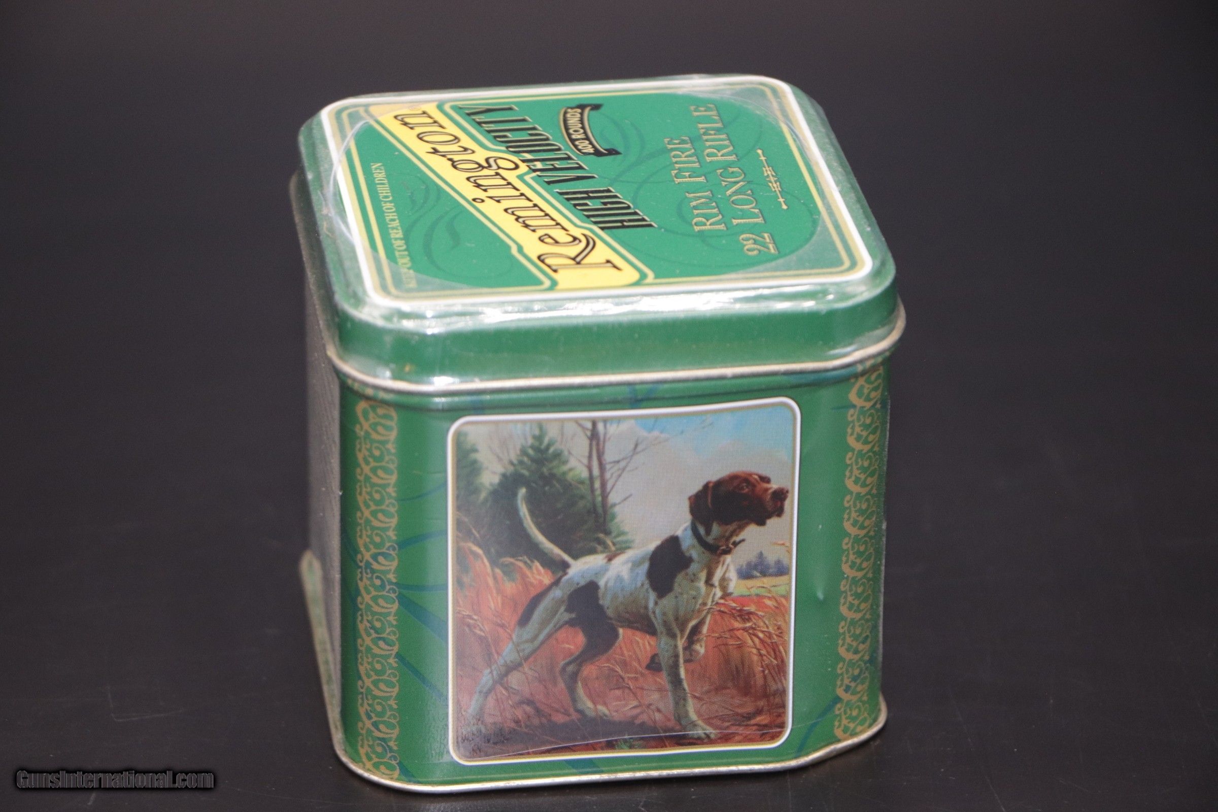 Description: 2002 Remington Artwork Christmas Series. 40 gr. Lead Gold-washed. Green metal tin with yellow Remington banner. Depicts four hunting scenes commissioned by Remington. Mint. Code 1522AT1. $15 S+H SOLD Rifle Caliber: .22 Long Rifle |