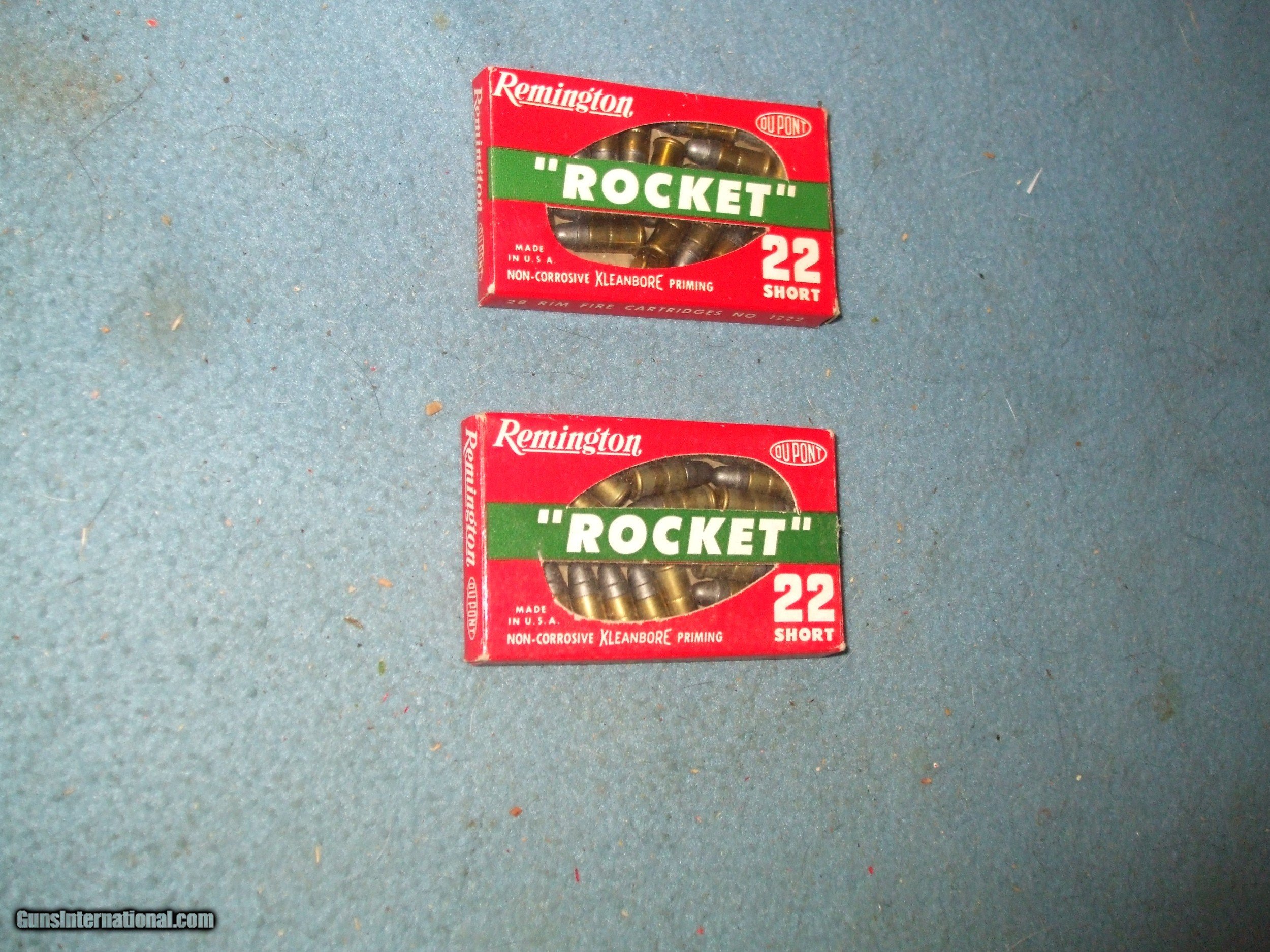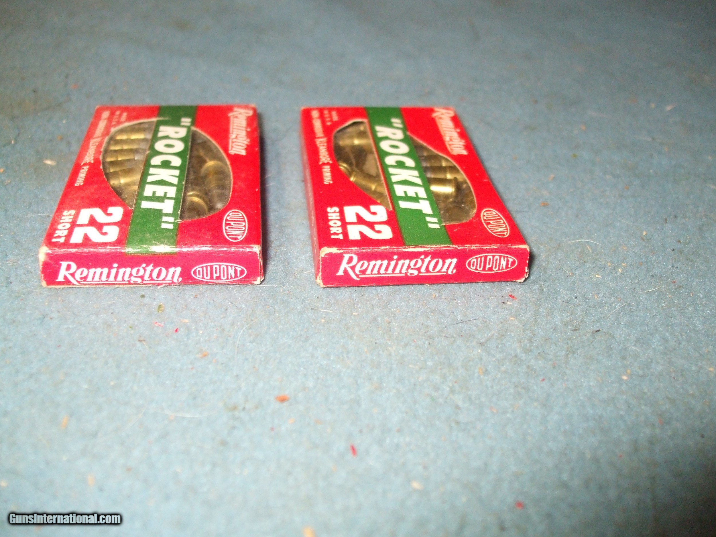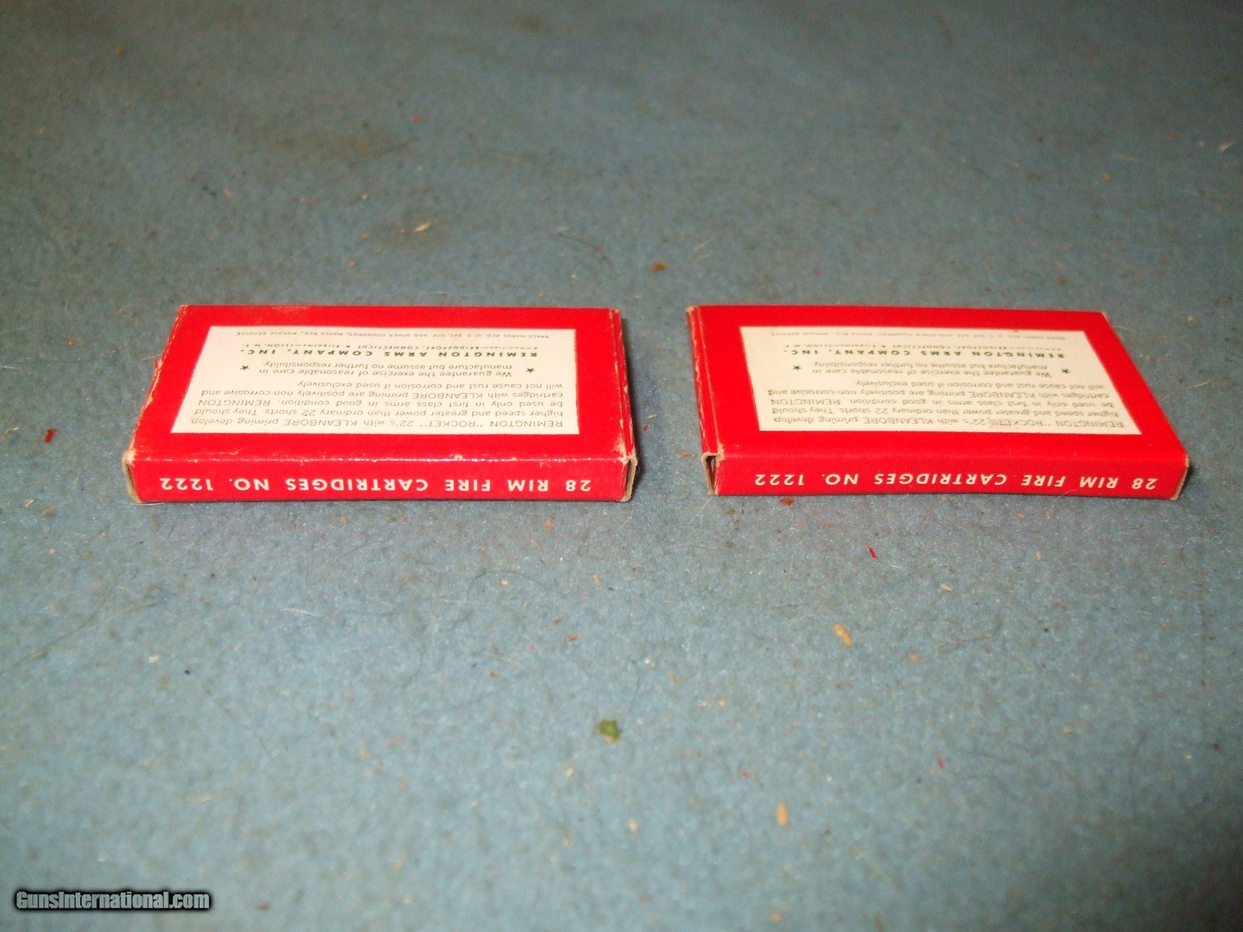 Description: Remington 22 Short "Rocket" chicklet package. Code 1222. 28rds per package. Package intact however the outer cellophane wrapper with pull tab missing on both boxes. Otherwise great example of this unique packaging from Remington. Please note cannot ship to CA, MA, NJ, IL or any other restricted areas. SOLD Handgun Caliber: .22 Short |