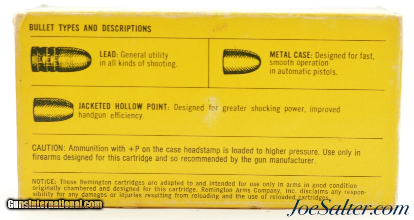 Description: This is a full box, 50 original rounds, of .38 Auto Colt (.38 ACP) ammunition manufactured by Remington with 130 Grain metal case bullets. The box and cartridges are in excellent condition.; SOLD |