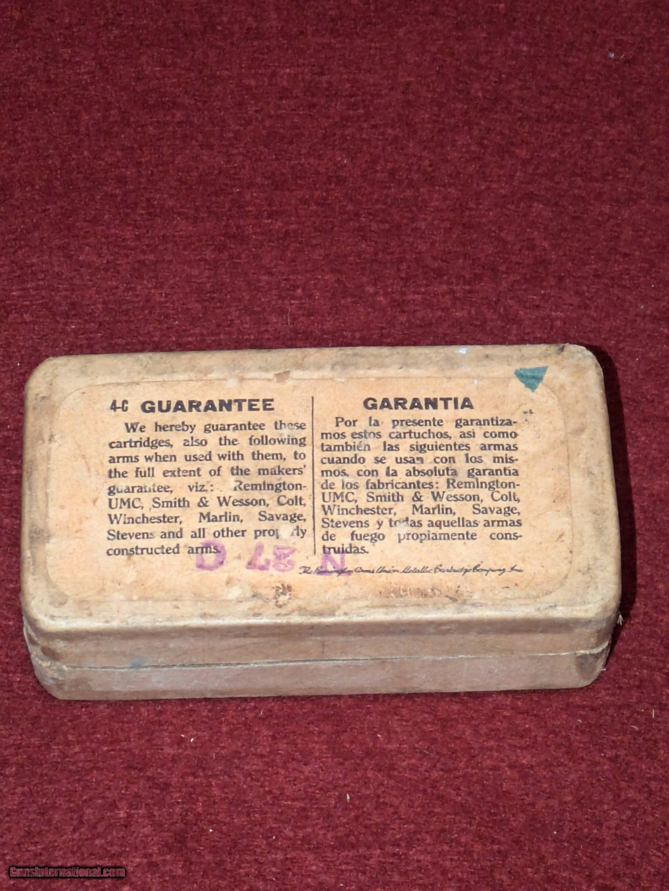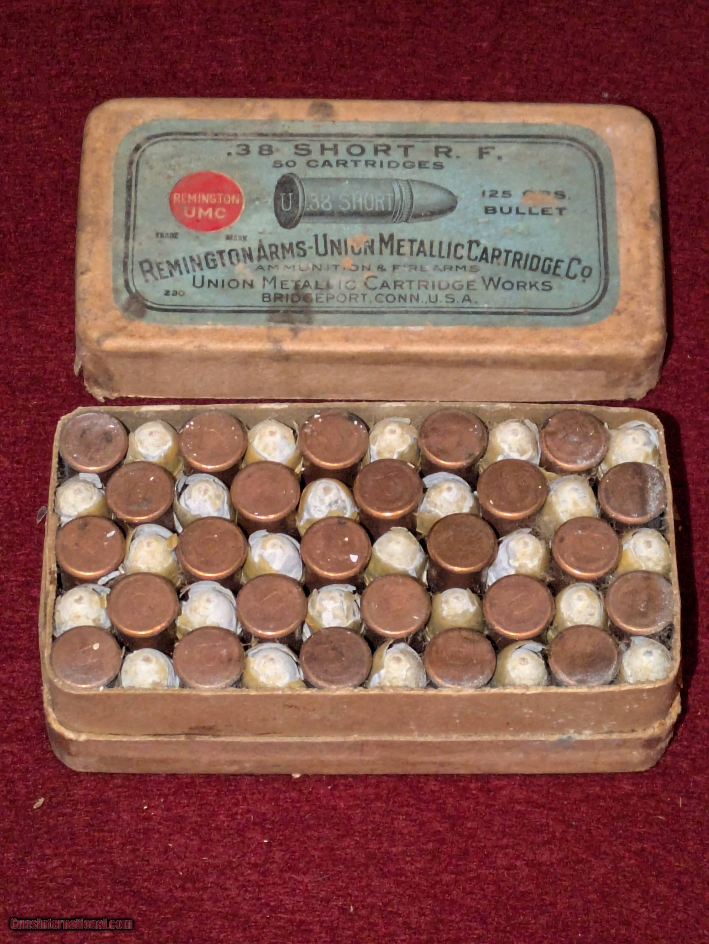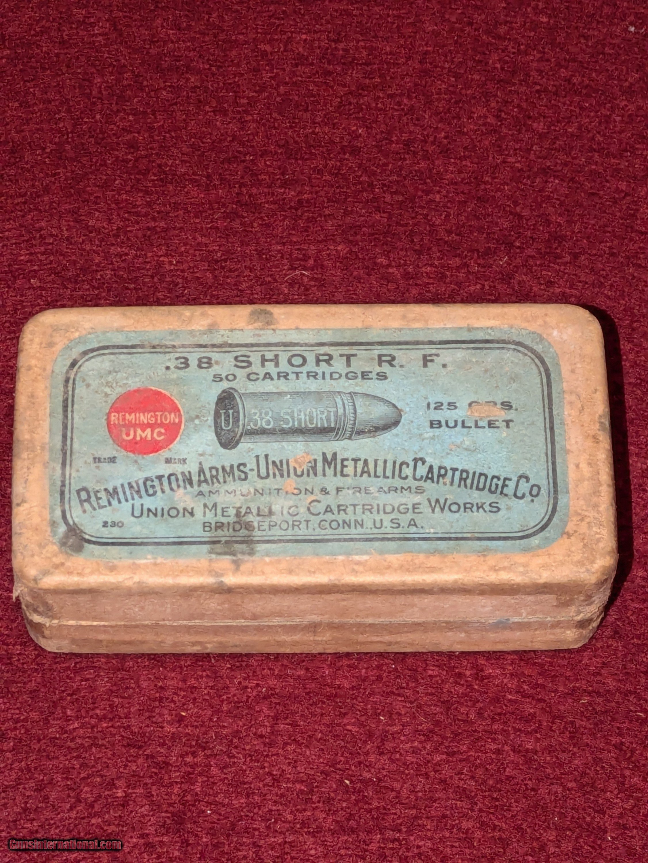 Description: Remington arms- Union Metallic Cartridge company. Full 50 round box of 38 short RIM FIRE ammo. Two piece split box. Box is in nice condition label is fairly nice. Ammo is nice. I combine shipping and also accept visa and MasterCard for payment but it adds 4 percent to total. 125.00 plus shipping SOLD |