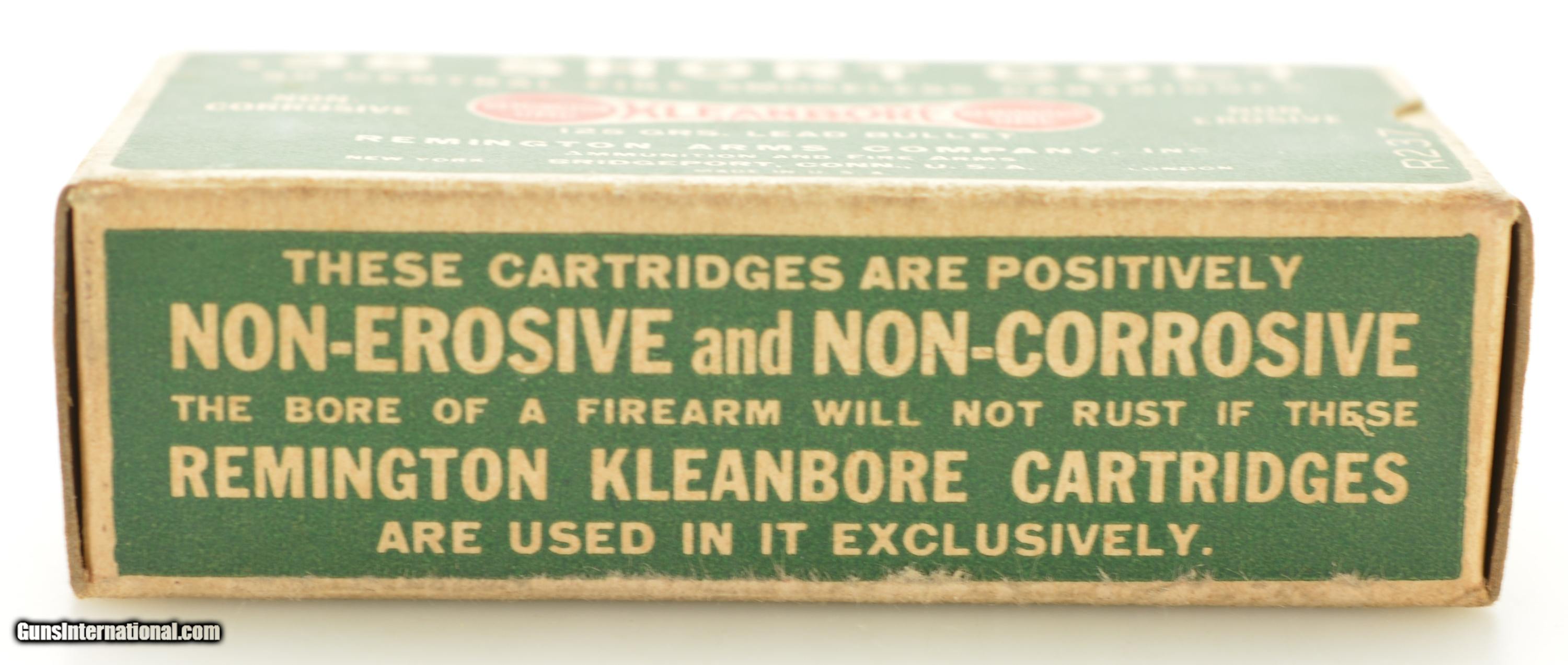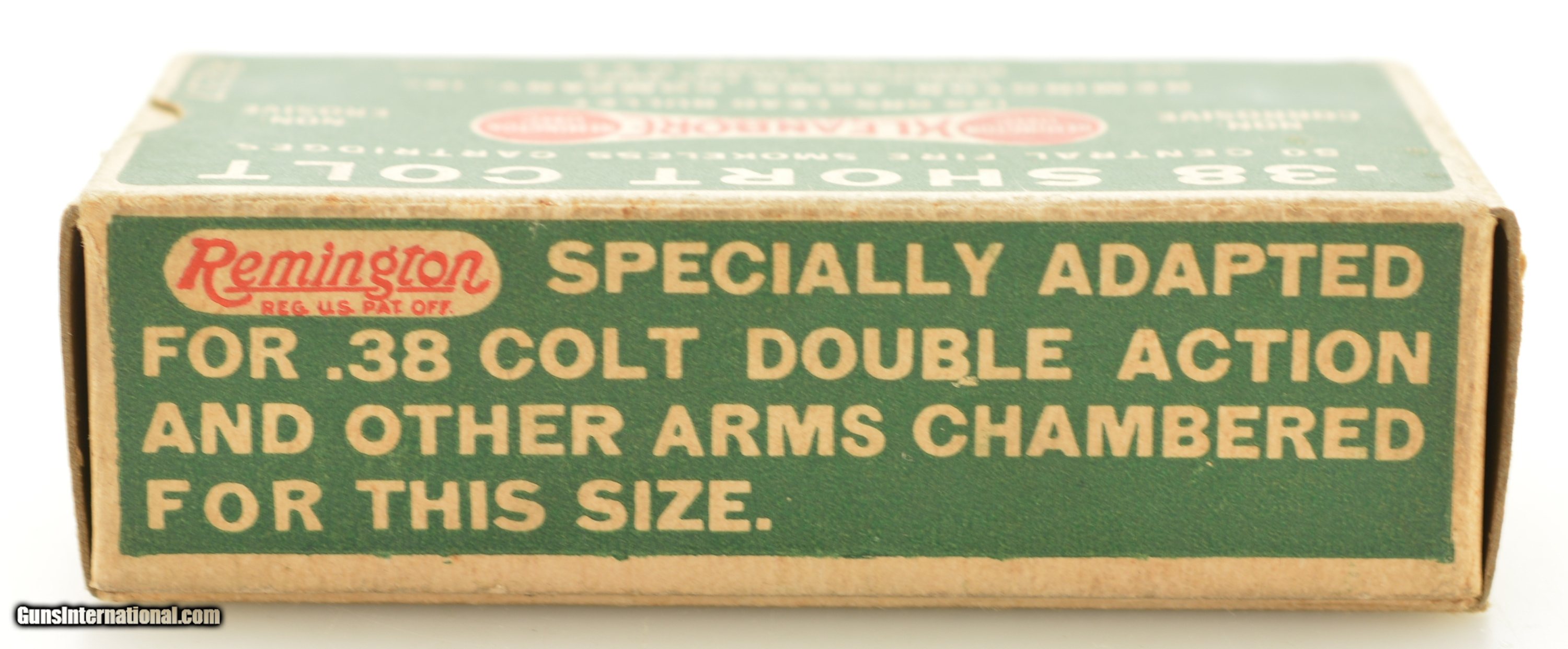 Description: This is a full box, 50 original rounds, of Remington .38 Short Colt ammunition with 125 grain lead bullets. The green and red Kleanbore logo “Dog Bone" box is solid with excellent graphics and mild age darkening. The cartridges are excellent with the bullet lubricant having yellowed with age. A great box for the collector or to display with your 1930's era revolver. SOLD Manufacturer: Remington Model: Ammo Caliber Info: .38 Short Colt Gauge Info: .38 Short Colt |