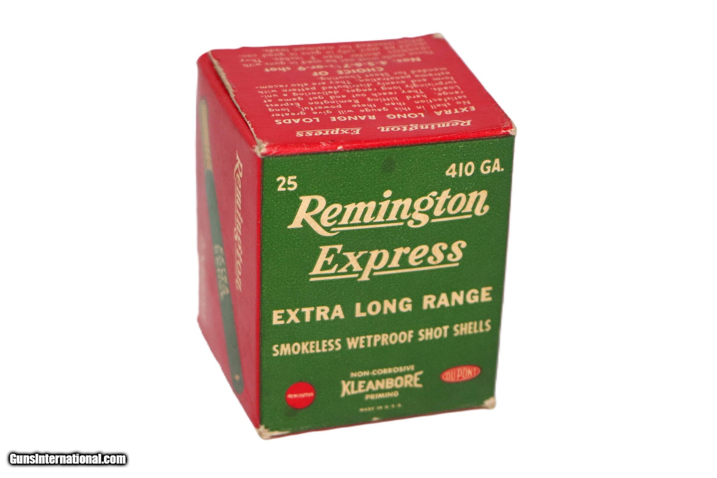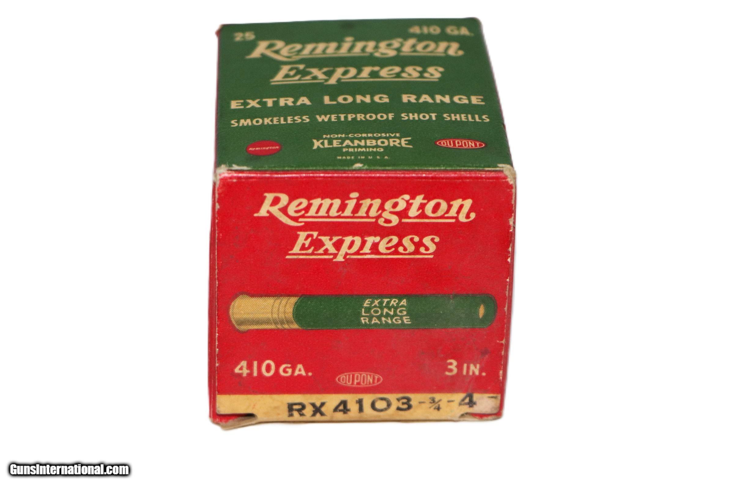 Description: Remington Express, Kleanbore, .410 Gauge, Extra Long Range, 3", Shot Size 4, 3/4 oz. Box and Ammo are excellent. Box has a small tear on inside flap. Add 13.50 S+H SOLD Shotgun Gauge: .410 Gauge |