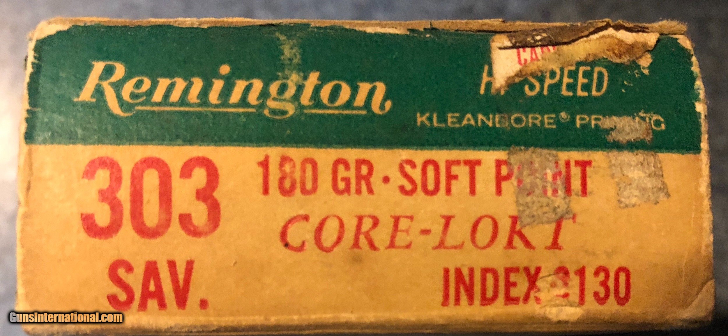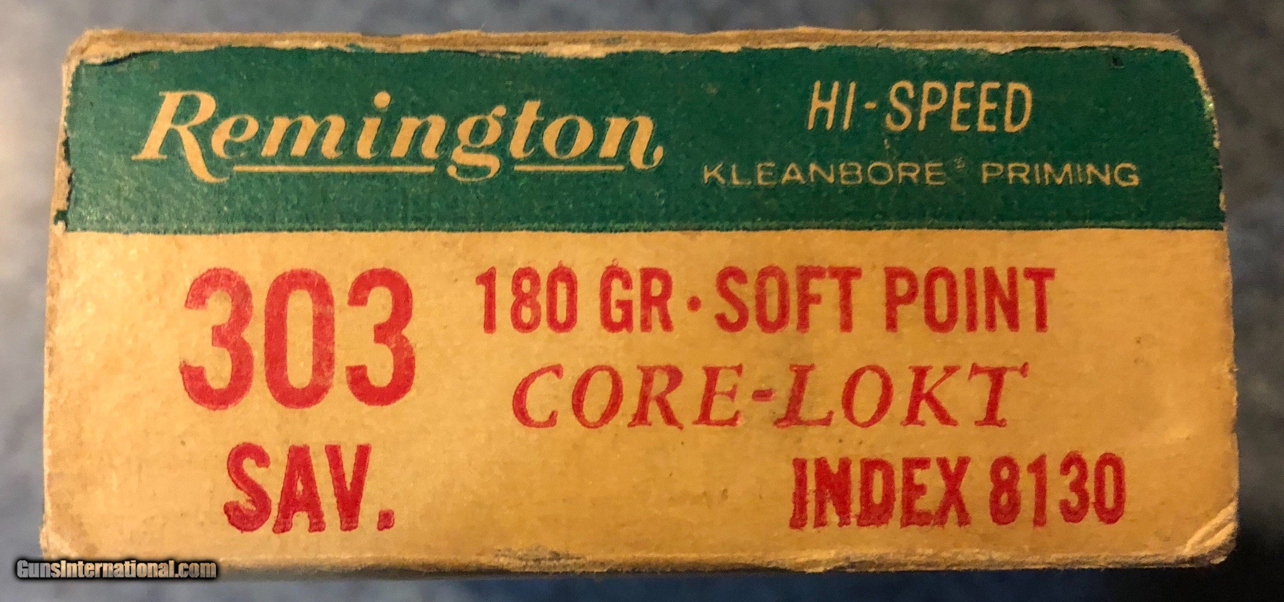 Description: Green box of 20 cartridges Remington Hi-Speed Core lokt, 180 grain soft point index 8130 One box end has a little wear (see pic) SOLD Rifle Caliber: .303 Savage |