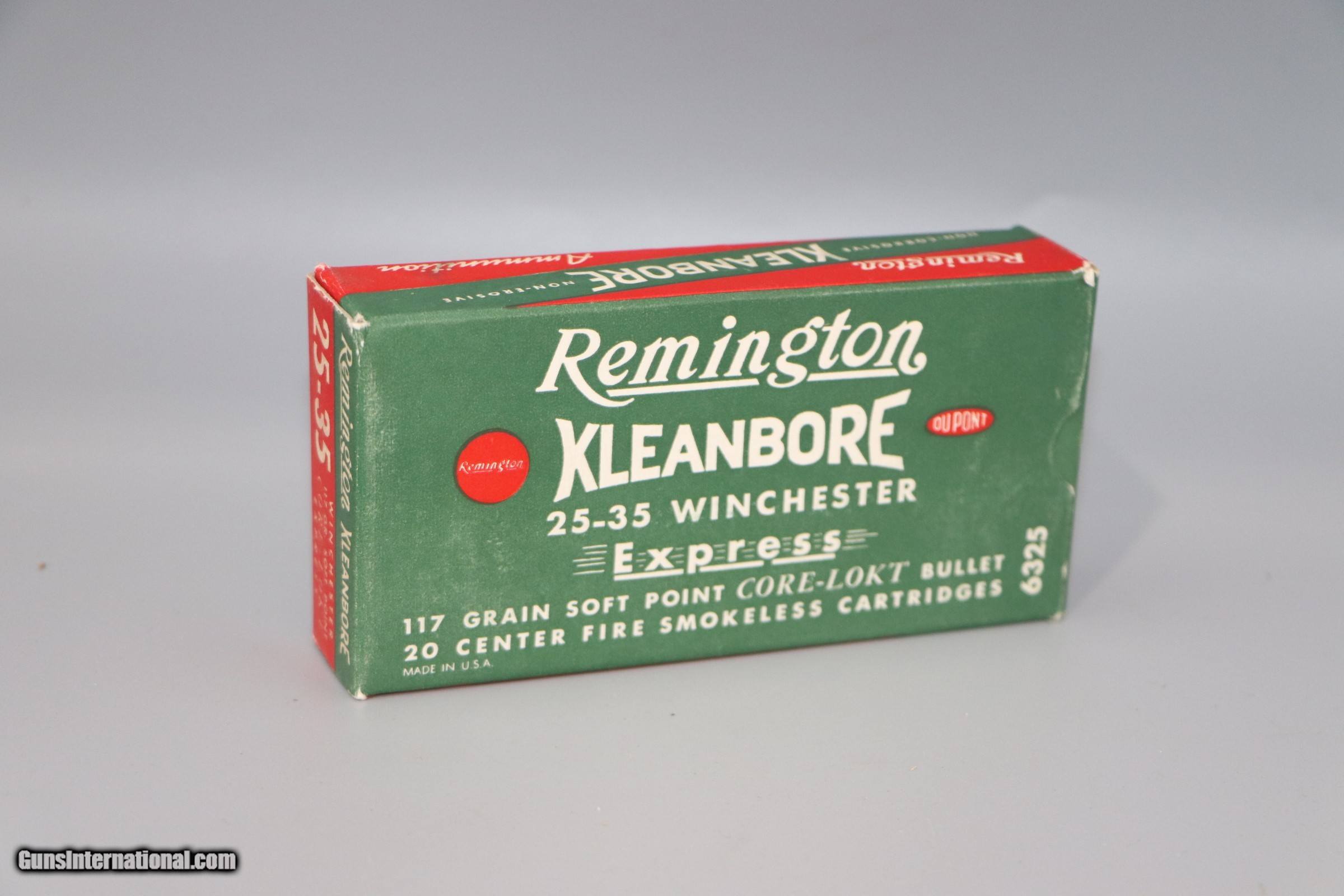 Description: Remington Kleanbore, Express, 25-35 Winchester, 117 Grain, Soft Point, Core-Lokt Bullet, #6325. 20 Exc Factory Correct Rounds. Box is exc- missing one inside flap and has edge wear. Add $15 S+H SOLD |