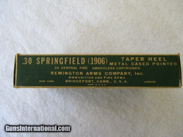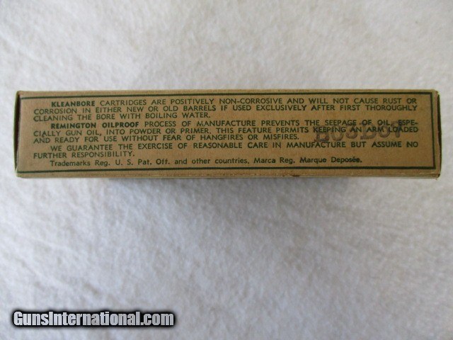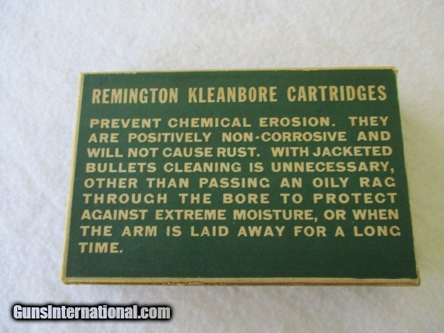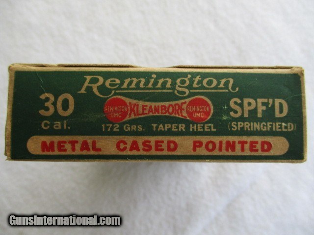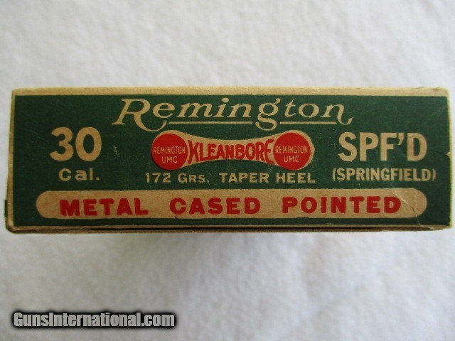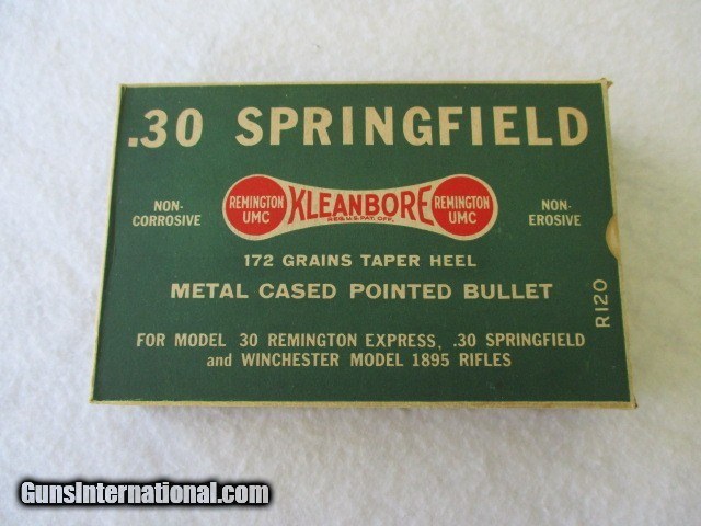 Description: Remington Kleanbore dog bone box in .30 Springfield. Full box of original shells in 172 grains taper heel. Box is in great condition. Buyer pays actual shipping costs. Cannot ship to CA. SOLD |