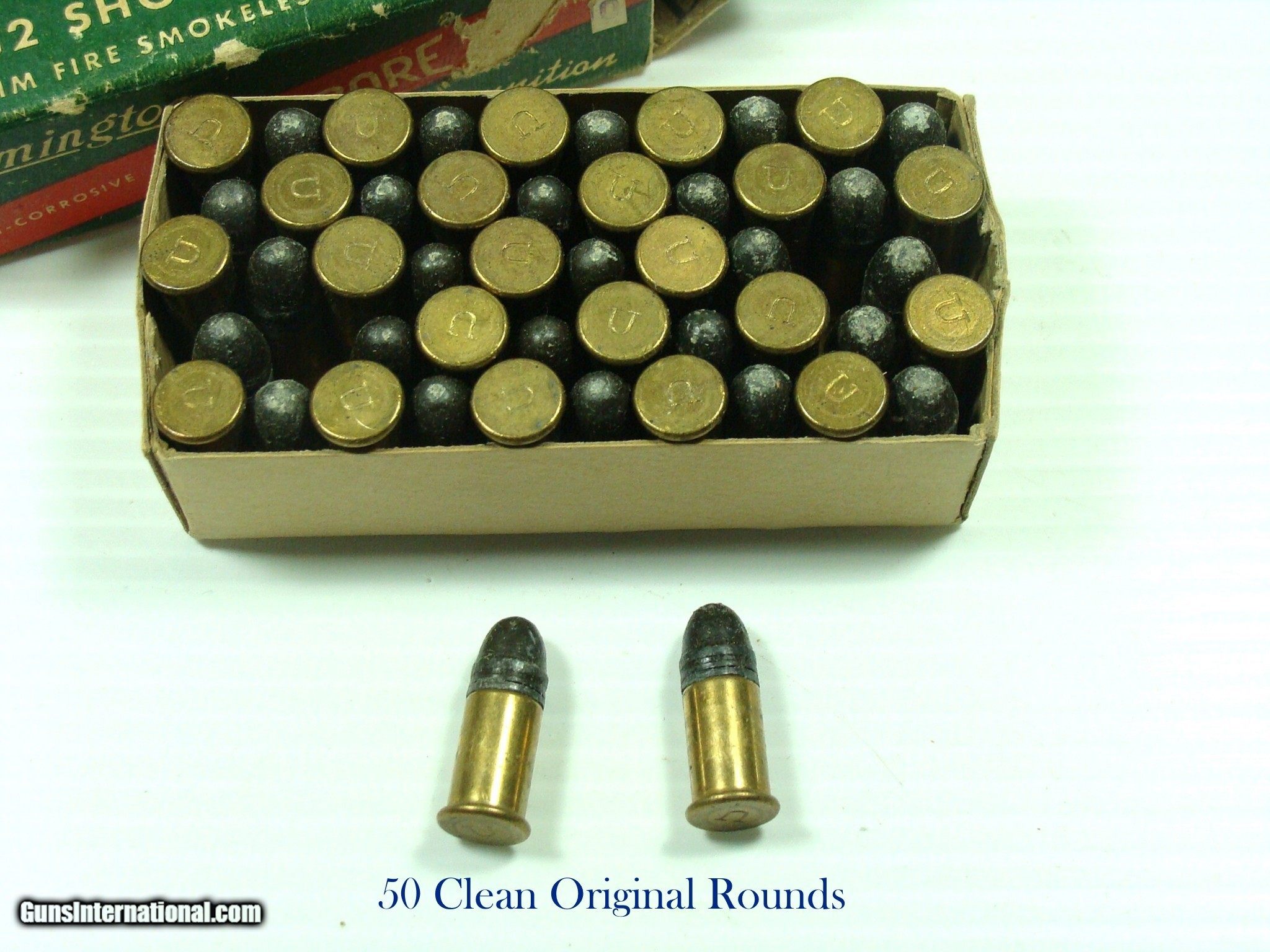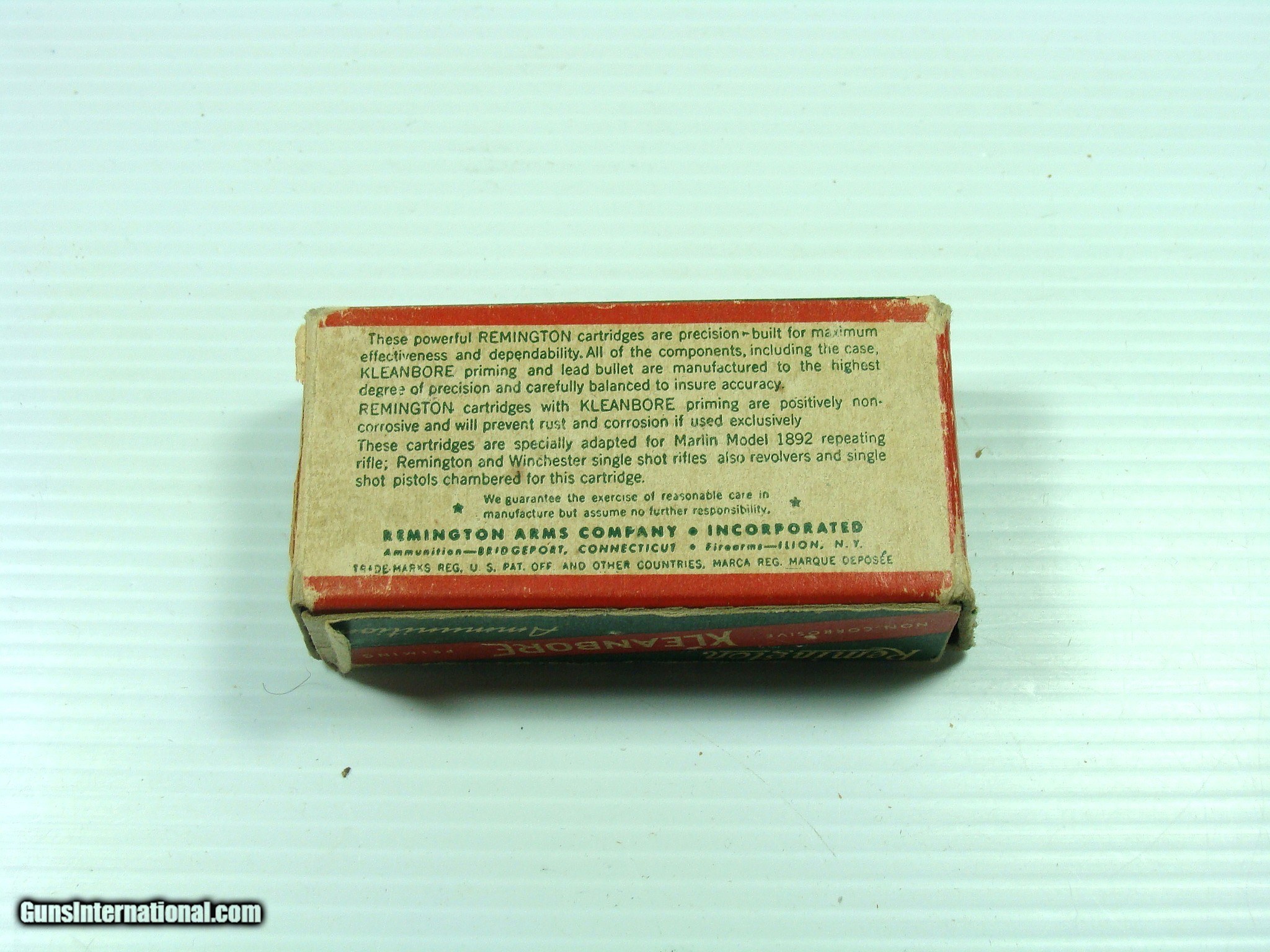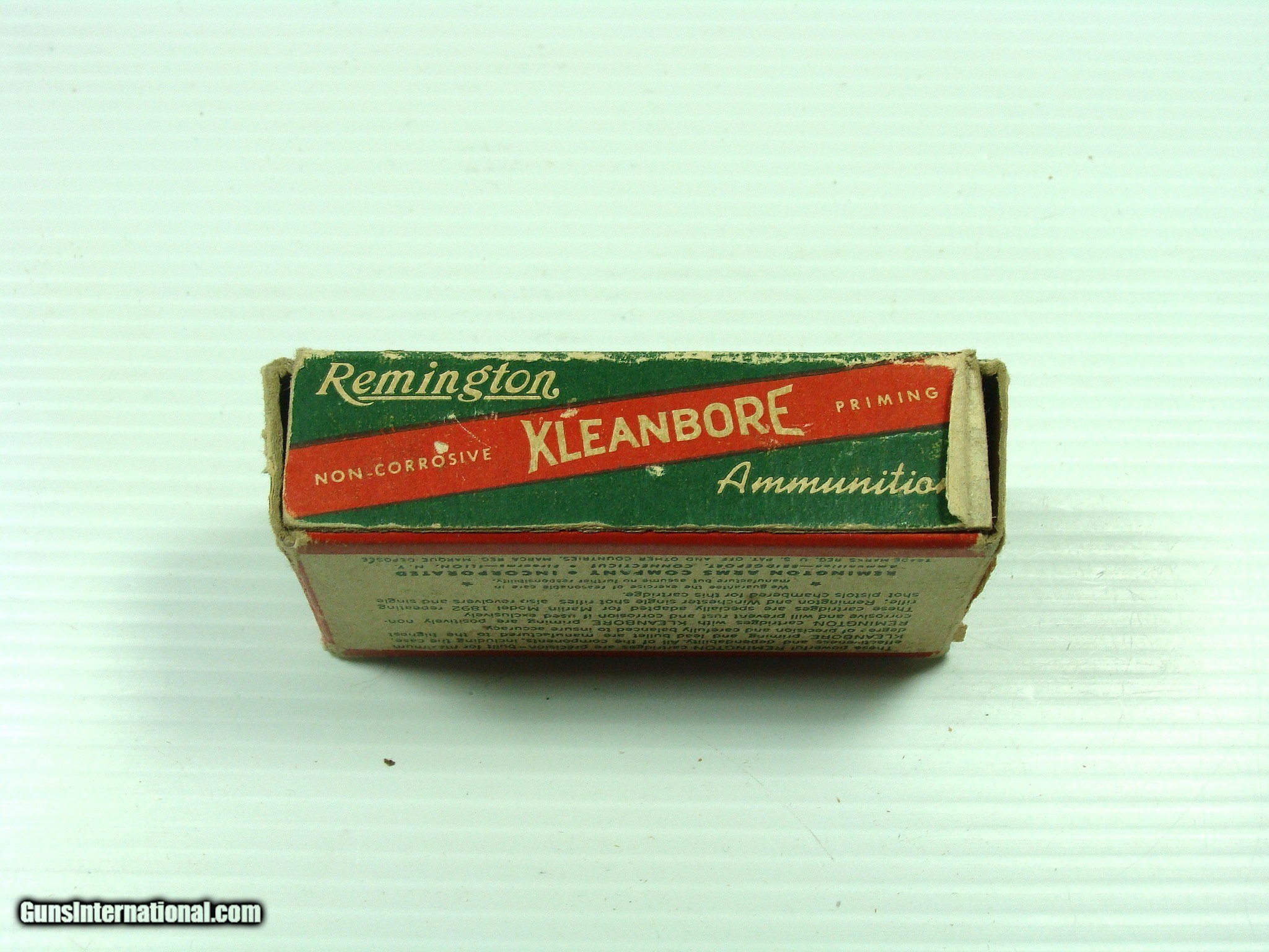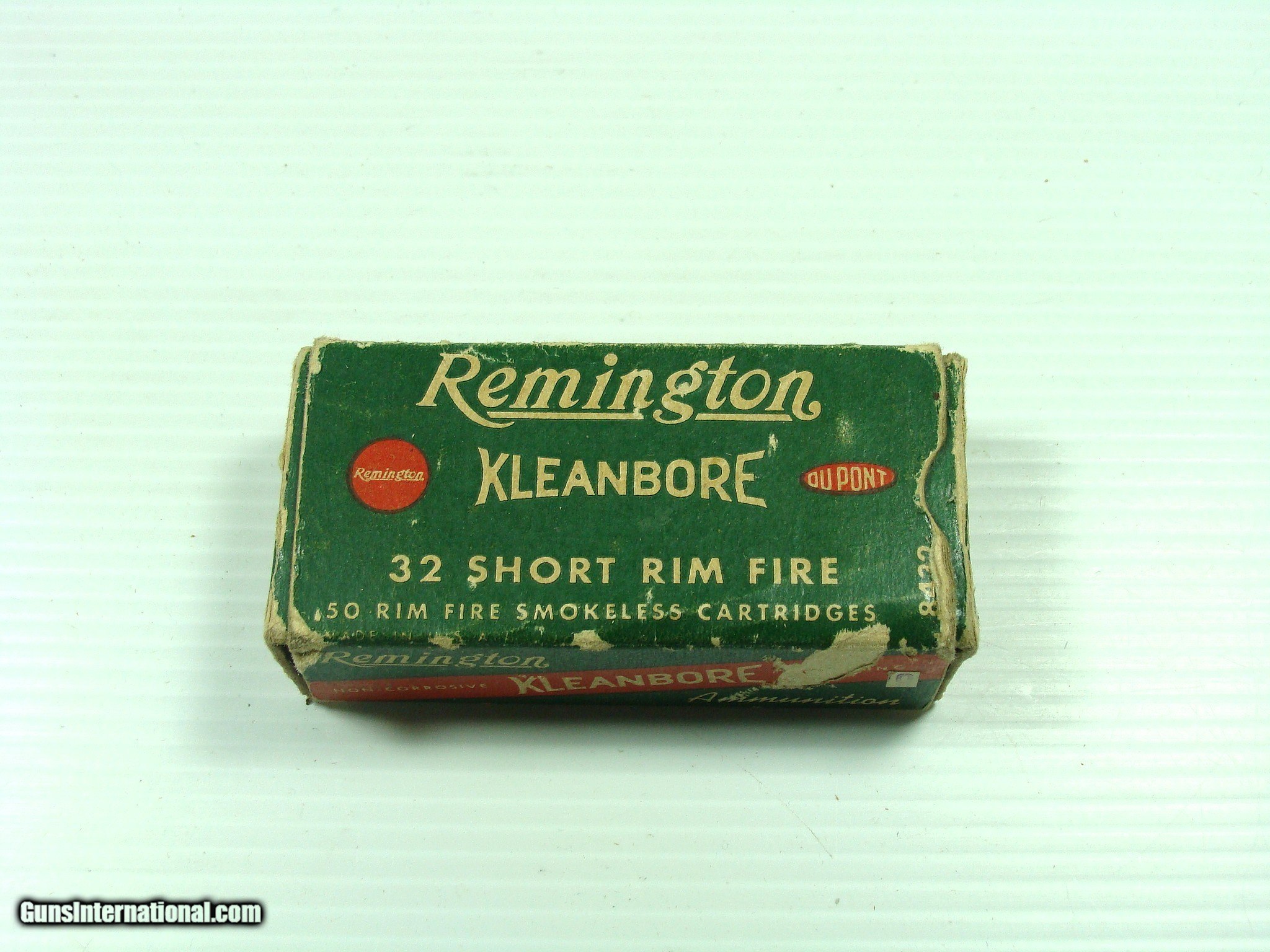 Description: Remington Kleenbore 32 Short Rimfire. Full 50 round box of clean original cartridges. They are loaded with smokeless gunpowder, and loaded down to be safe with pre-1898 firearms. They are not guaranteed to fire, but with their apparent condition I imagine they will function as if new. You must be 18 years or older and that there are no laws preventing their use. All use is at the responsibility of the user. No warranty expressed or implied by their use. Make sure that their use is in a firearm that has been checked for safety by a gunsmith. SOLD |