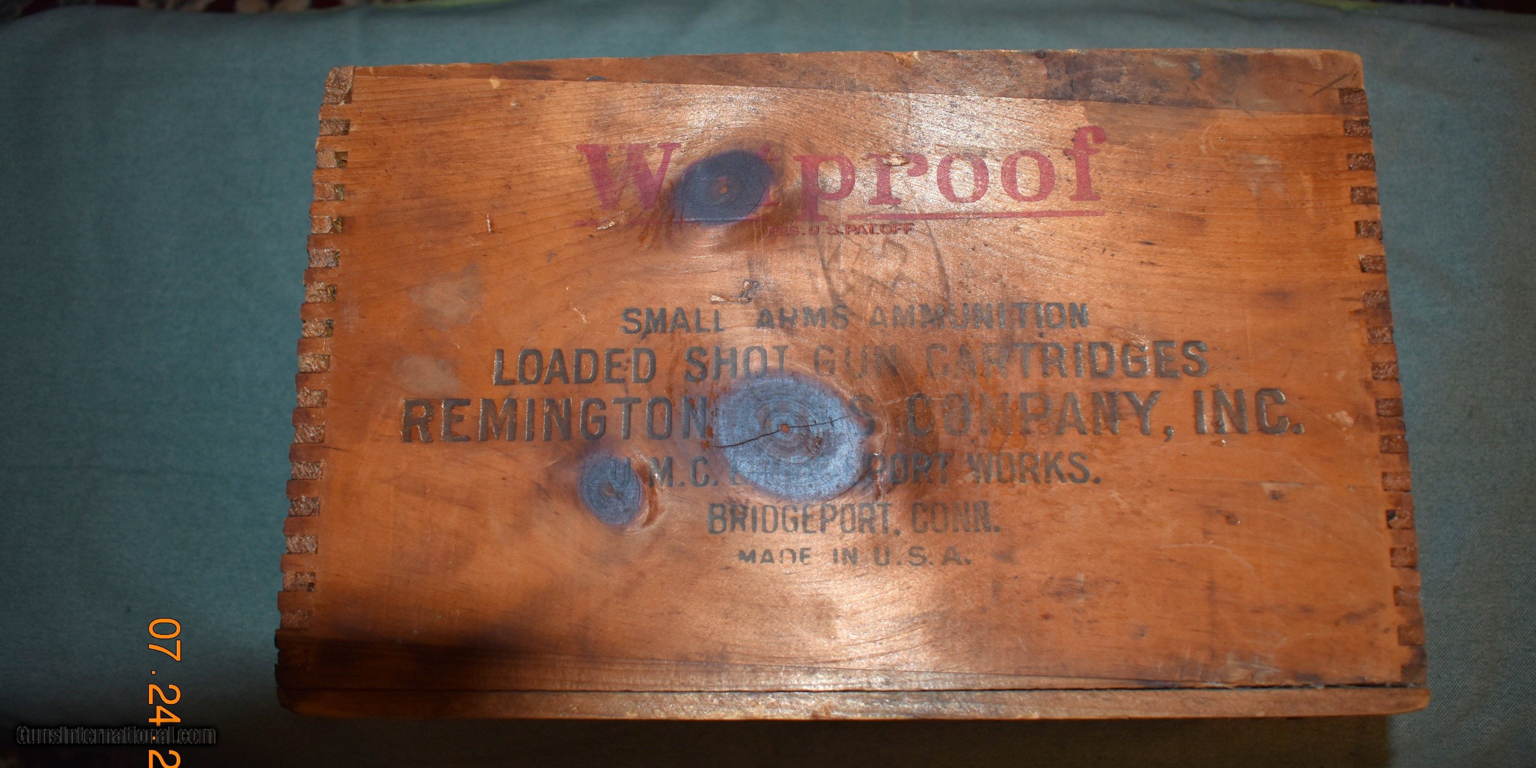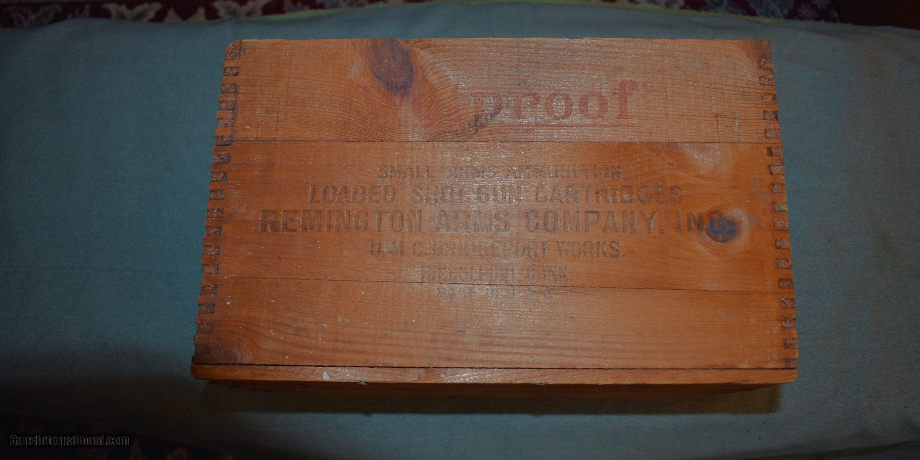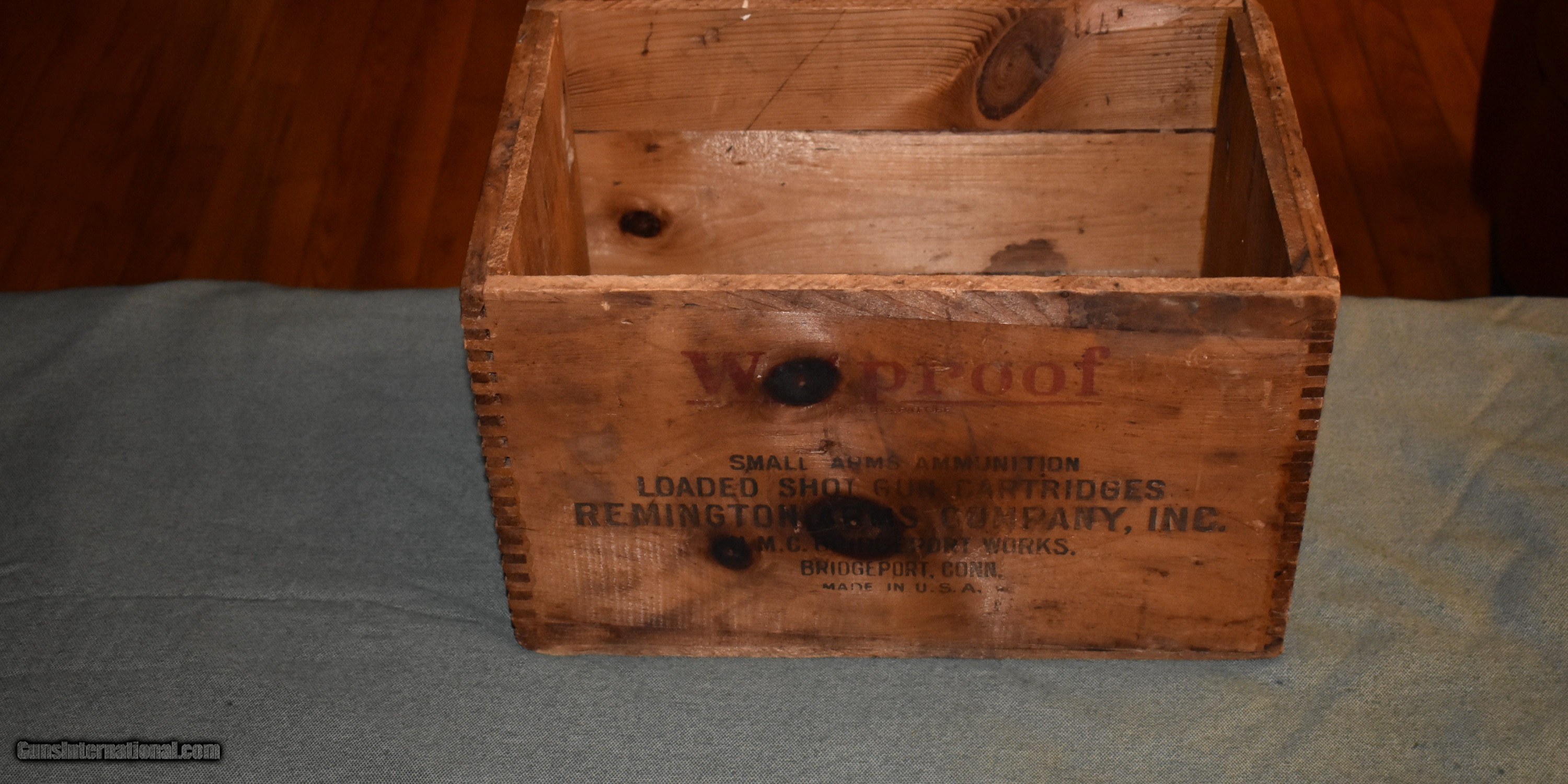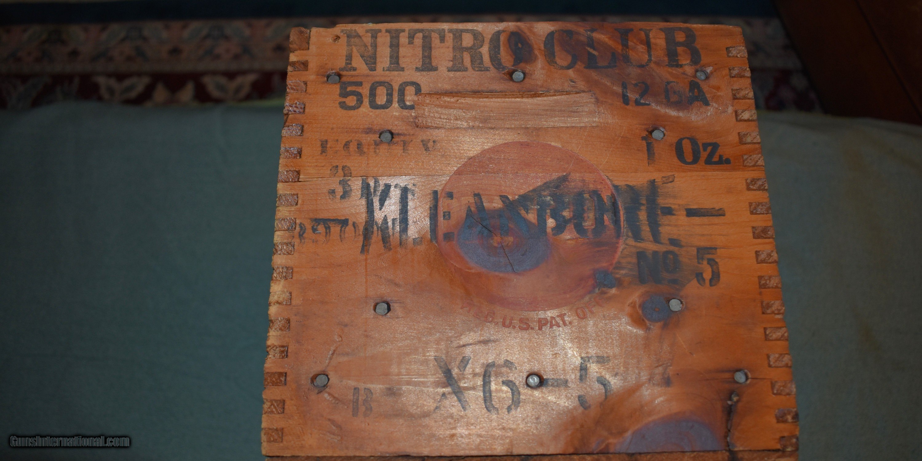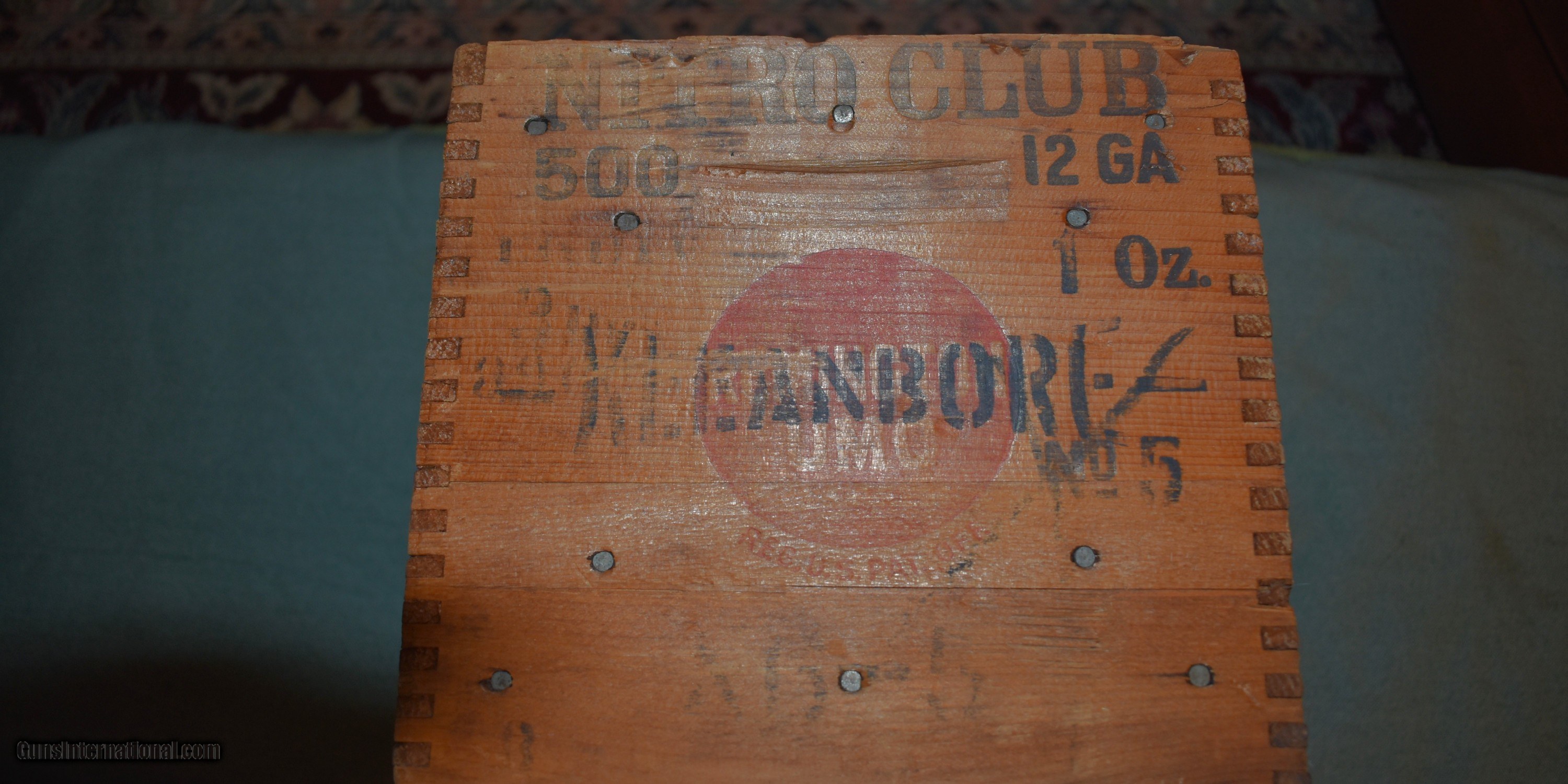 Description: Remington Nitro Club 12 gauge wooden shell box. Circa 1900,this box has dovetailed corner construction. The graphics are slightly faded but are legible. The box is sound and undamaged. A great item to keep magazines or fireplace kindling in or just decoration for your den or gun room. Price includes shipping. SOLD |