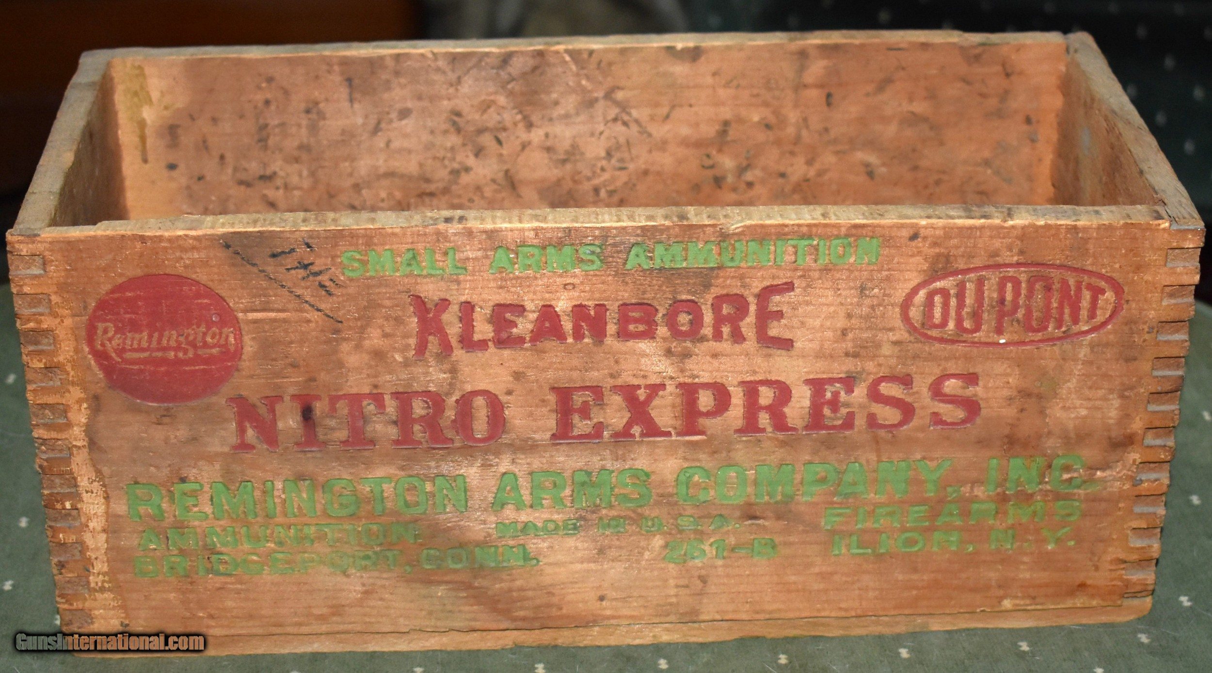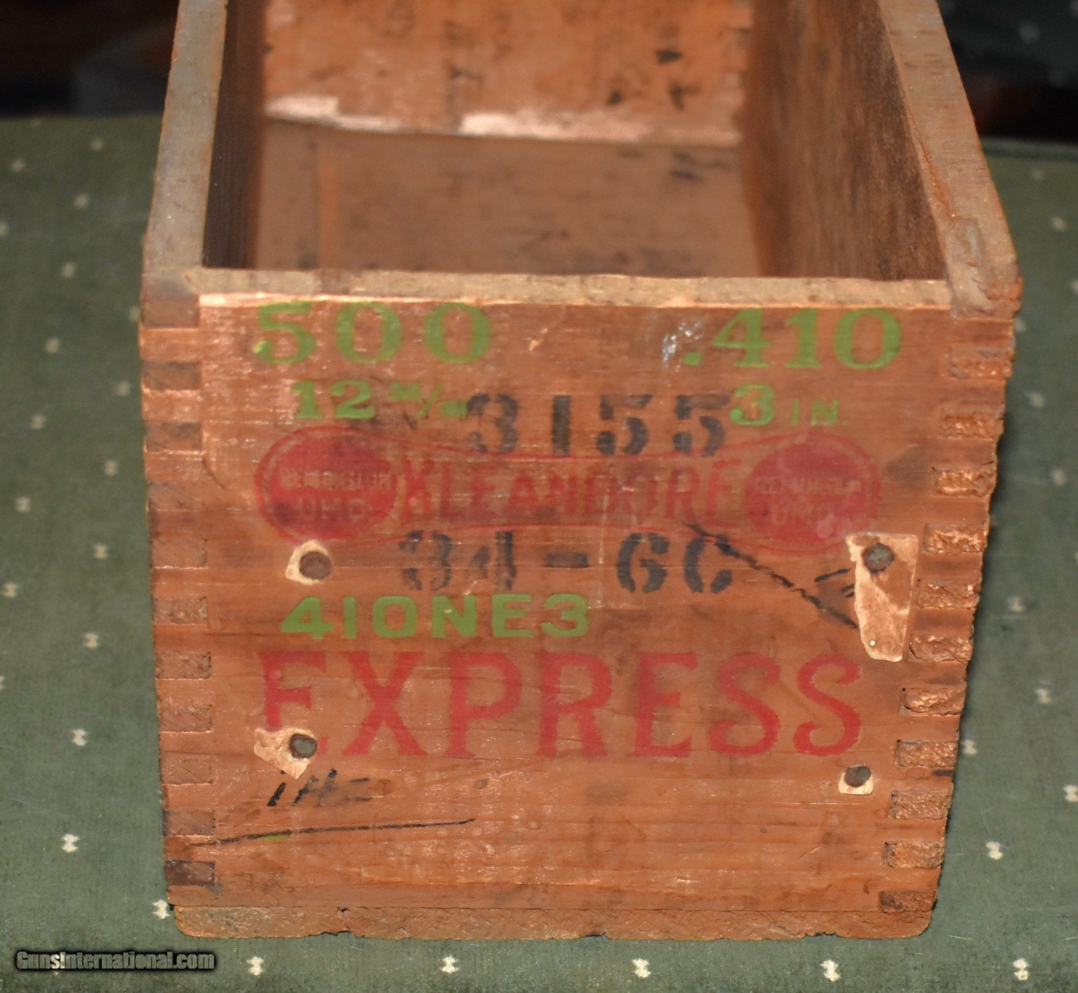 Description: Remington dovetailed corner wooden shell box for 410 Express shotshells. This box is in solid conditin with good graphics. The corners are still tight. Small gauge boxes like this are very scarce and are hard to find. A nice addition to the gun room or den. The price shown includes shipping. SOLD Shotgun Gauge: .410 Gauge |
