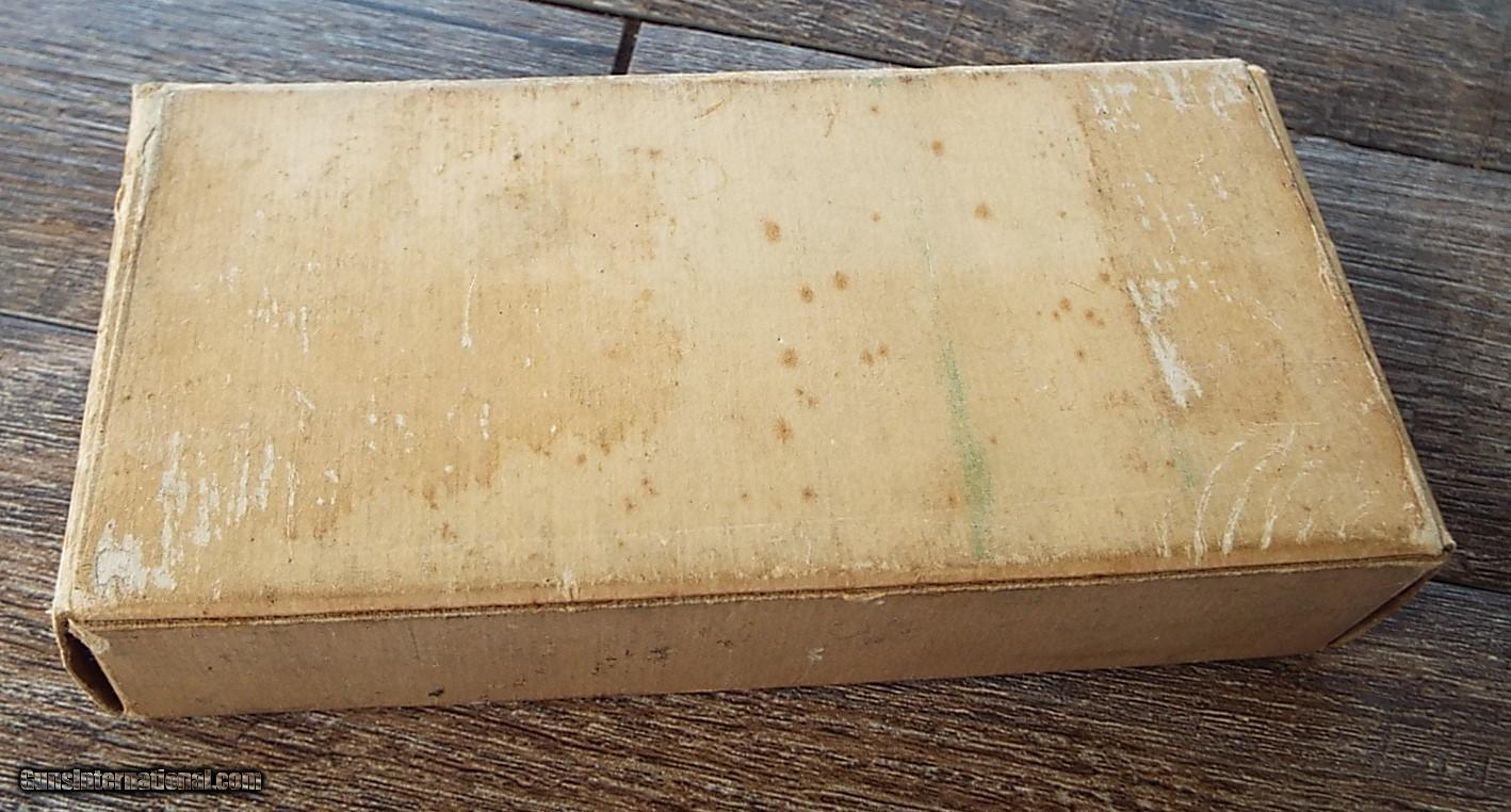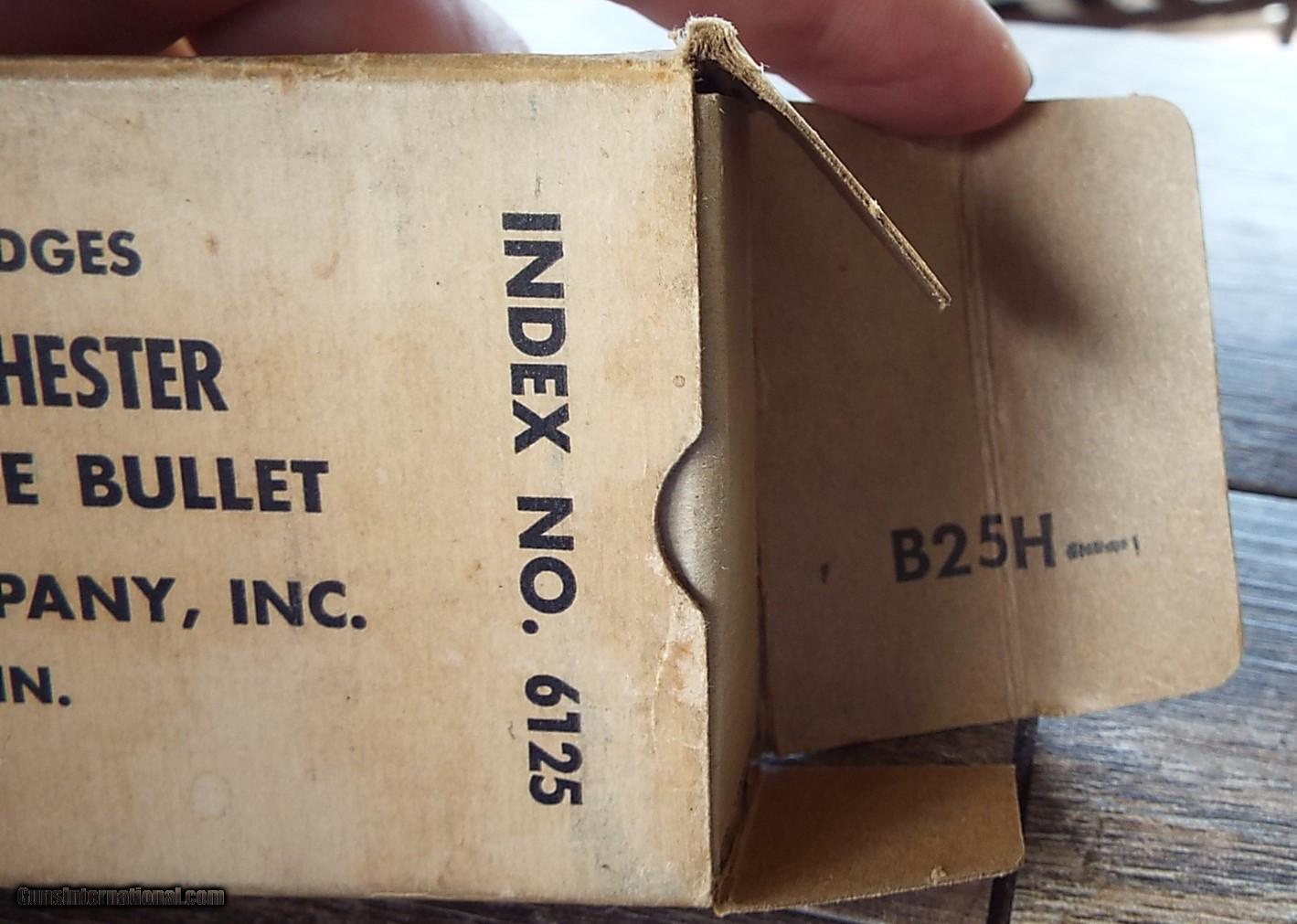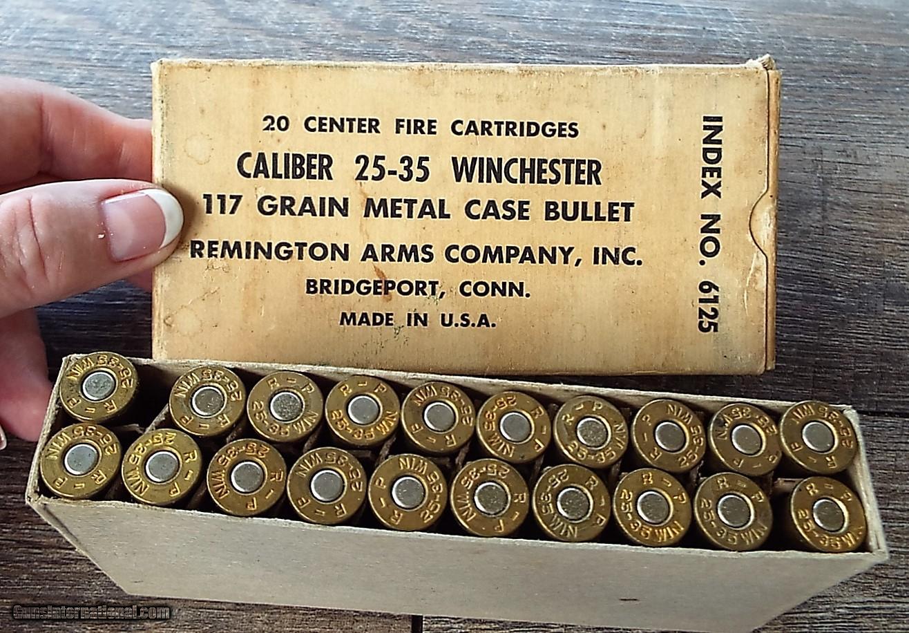 Description: FOR SALE: VINTAGE WHITE BOX OF REMINGTON AMMO~CALIBER 25-35 WINCHESTER 117 GRAIN METAL CASE BULLET .(20) CENTER FIRE CARTIDGES, MILITARY OR LAW ENFORCEMENT AMMO. WITH BRIDGEPORT, CONN. ADDRESS INDEX NO. 6125 HEADSTAMP IS R-P 25-35 WIN., I BELIEVE FROM THE EARLY '60s. BOX IS DISCOLORED, BUT FIRM WITH NO TEARS...AMMO IS EXCELLENT! PLEASE VIEW ALL PICTURES AS THEY ARE PART OF THE DESCRIPTION, SHIPPING IS $15 GROUND, LOWER 48 ONLY! ANY QUESTIONS CALL 772-349-0334 THANKS FOR LOOKING! SOLD |