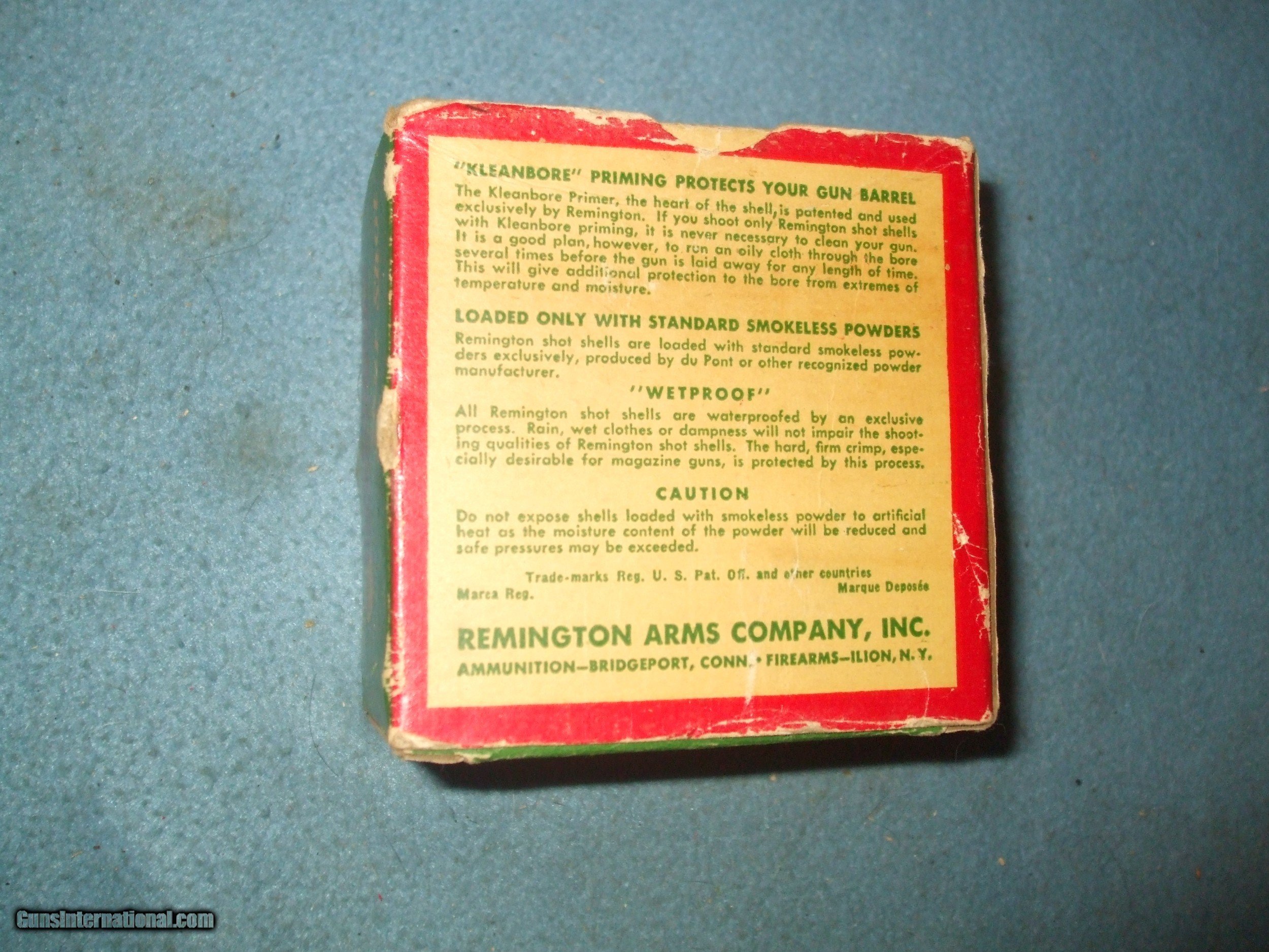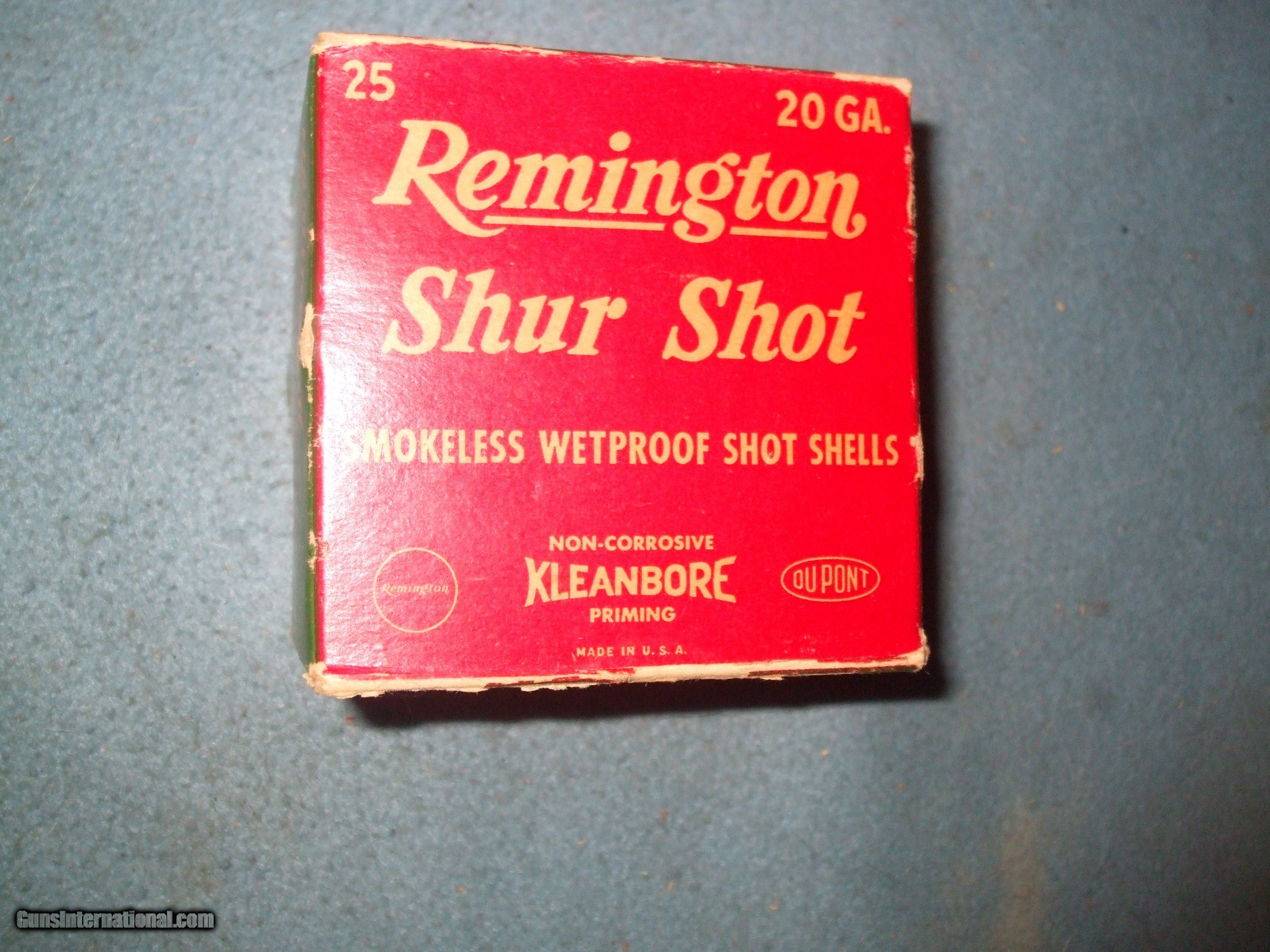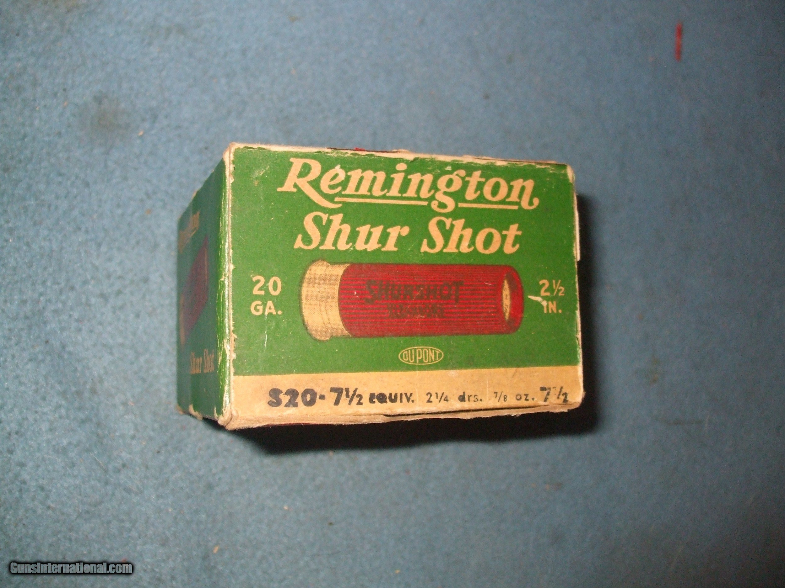 Description: Remington Shur Shot 20ga 2 1/2" 2 1/4-7/8-7 1/2. Code S20-7 1/2. Note this is rare 2 1/2" shell not standard 2 3/4". Not a full box 24 rds. Paper shell roll crimp. Box fair condition ammo excellent. Pleae note cannot ship to CA, MA, NJ, IL or any other restricted areas. I am located in Delaware and can deliver locally. SOLD Shotgun Gauge: 20 Gauge |
