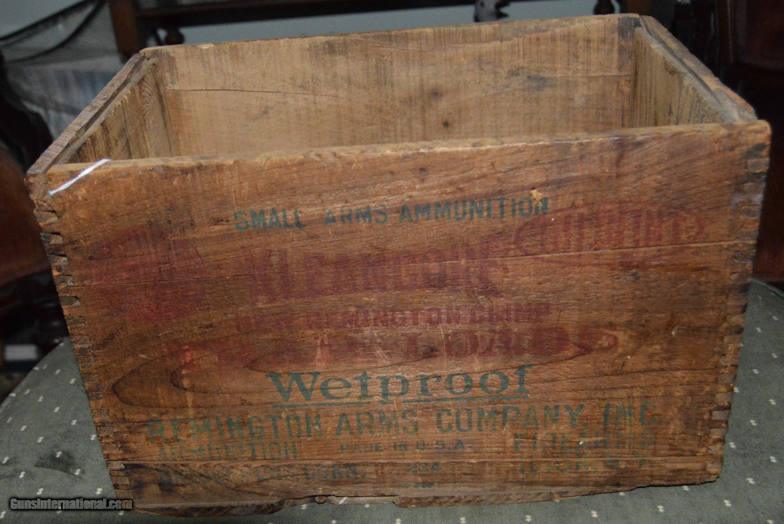 Description: A Remington Shur Shot 12 gauge Trap load wooden shell box circa 1940s.this box has the early style dovetailed corners and is very soundly constructed.The lettering is slightly faded but is still legible.This is a great item for your den,gun room,or hunting camp.Great to store magazines or fireplace kindling.Dimemions 141/2" lomg,91/2" wide,and 9" deep. SOLD |