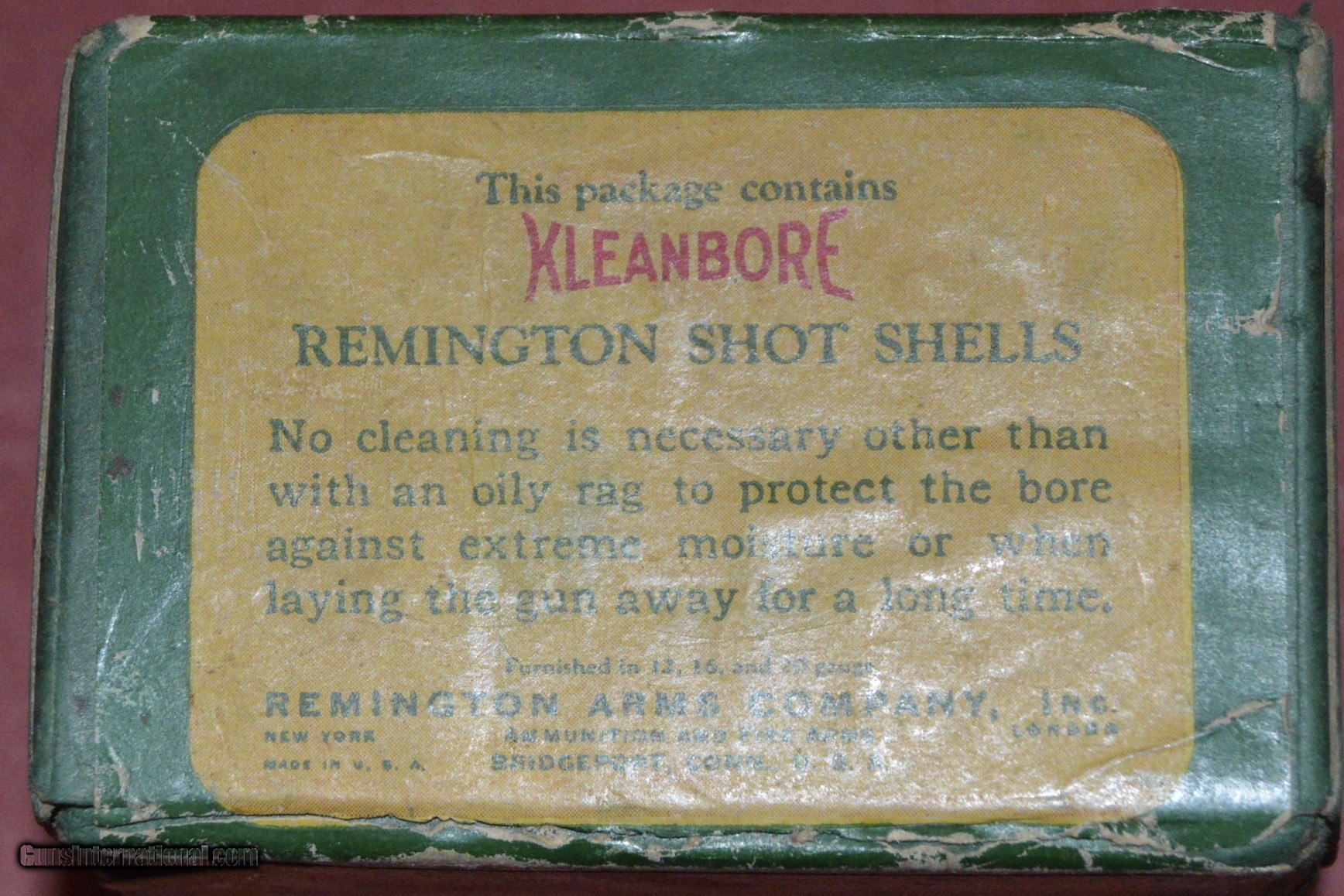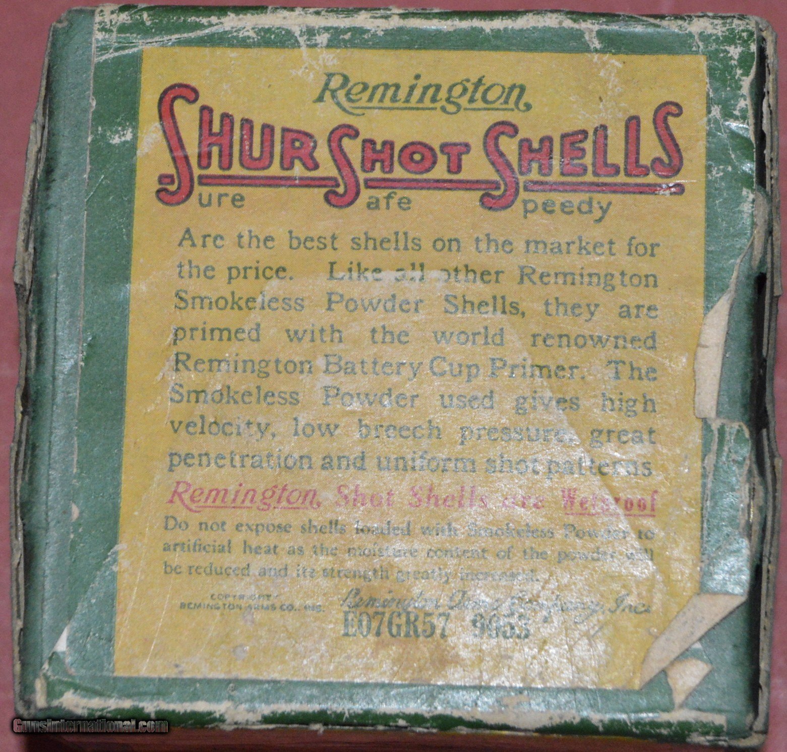Description: A full 2 piece box of Remington UMC shur shot 20 gauge shells circa 1920s.The graphics are bright and the box is in very good condition.This box shows the dogbone logo and the UMC sunburst logo.Loaded with 7/8oz of #9 shot. SOLD |