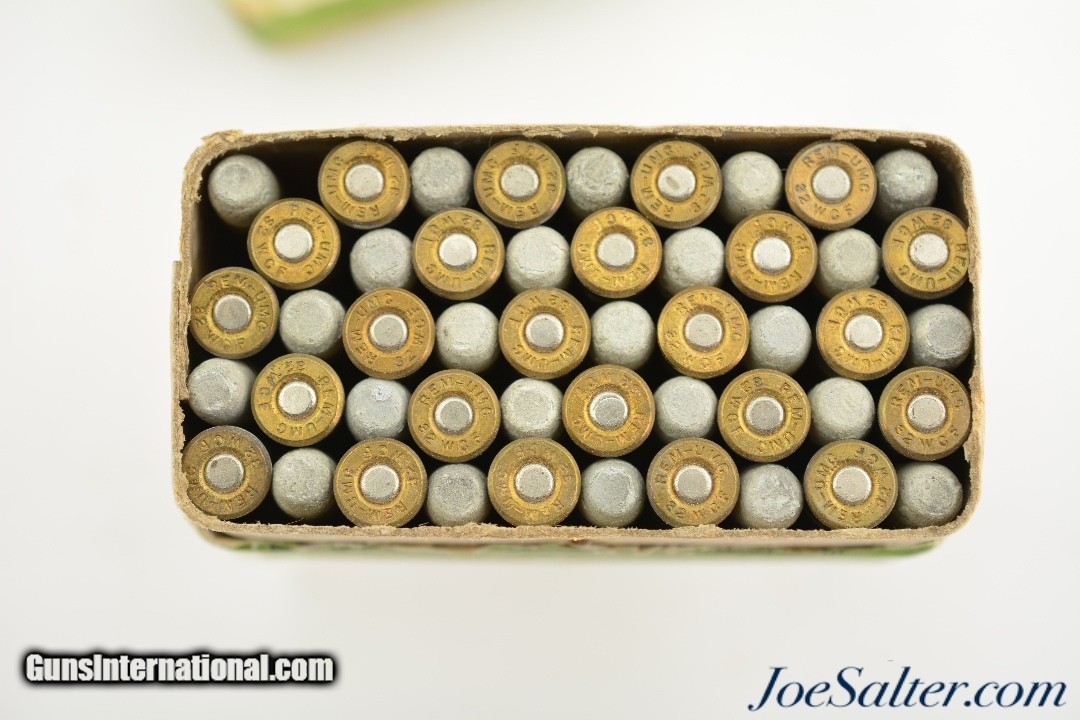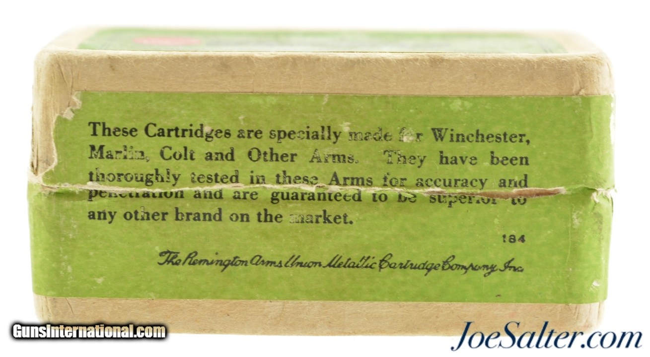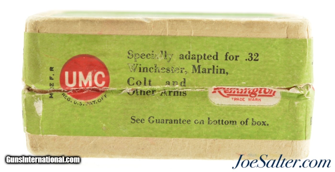 Description: This is a partial box, 48 original rounds, of .32 WCF ammunition manufactured by Remington UMC. The early combined company logo box is in excellent condition with intact top and bottom labels and 95% of the side label having excellent, bright graphics, call outs for Marlin, Colt and Winchester. The box is solid with some minor rub wear. The cartridges are in very good to excellent condition. SOLD |