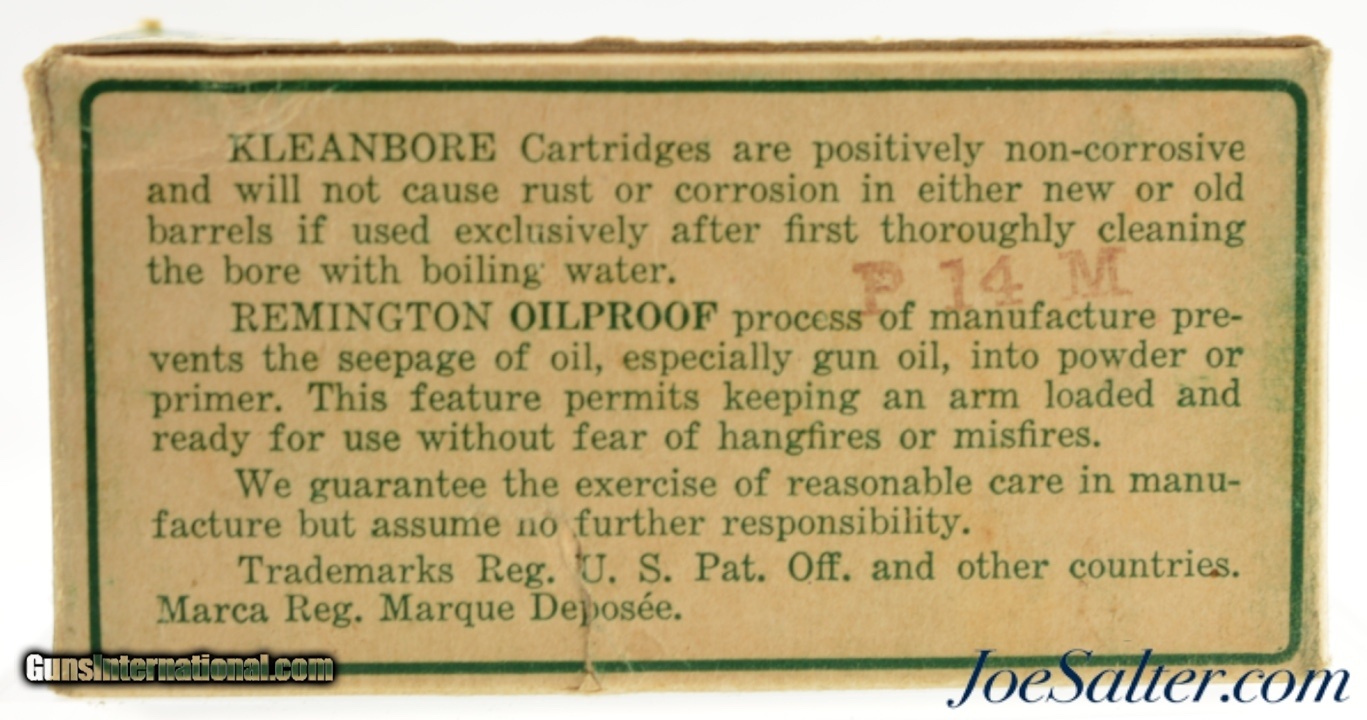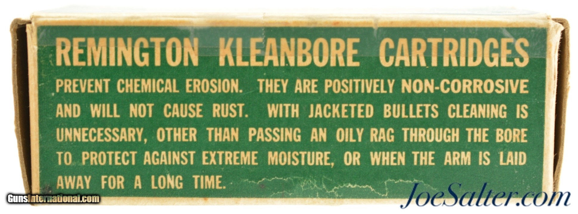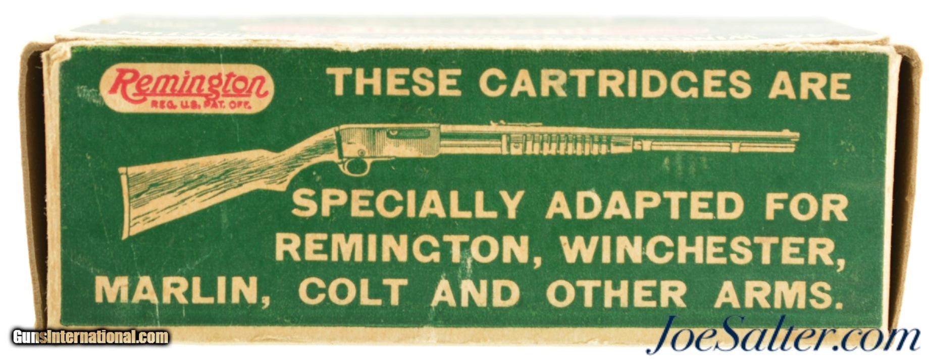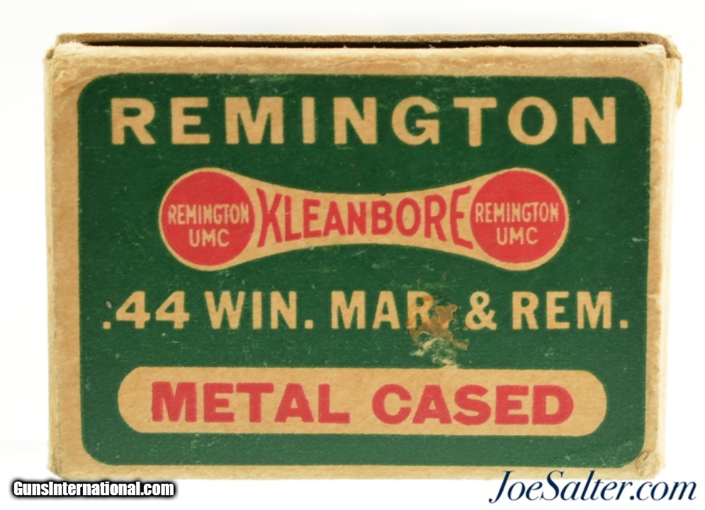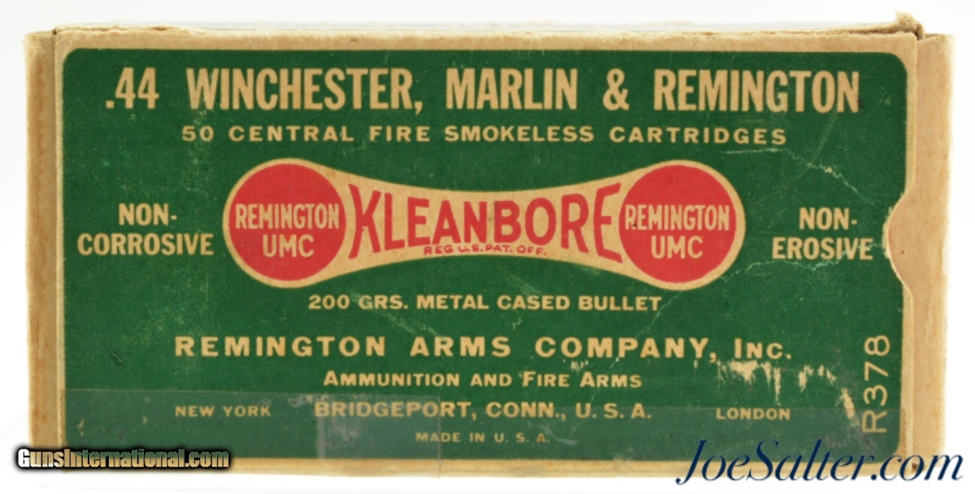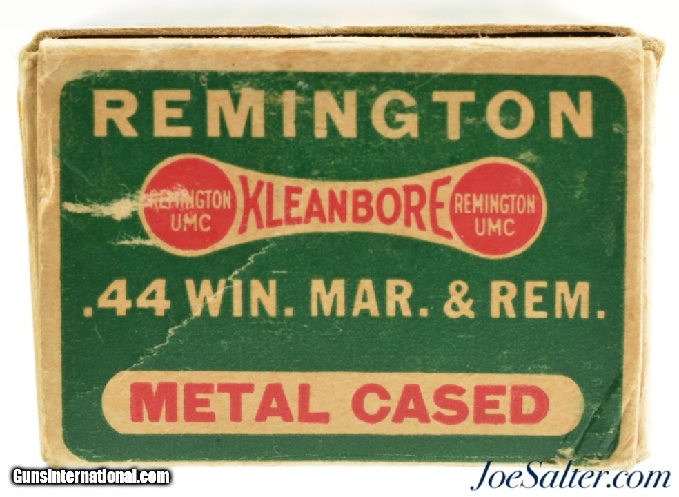 Description: This is a full box, 50 original rounds, of .44 WCF (.44-40) ammunition manufactured by Remington UMC with 200 grain metal case bullets. The 1930's one piece green and white box has the "Dogbone" shaped KLEANZBORE logo with call outs for Winchester, Marlin and Remington rifles with a very nice Model 14 Remington pump rifle illustration on the side. The box shows older tape repairs along one edge of the top and slight seam separation on several corners but is otherwise solid with very good, bright colors and crisp graphics. The cartridges are in excellent condition. SOLD |