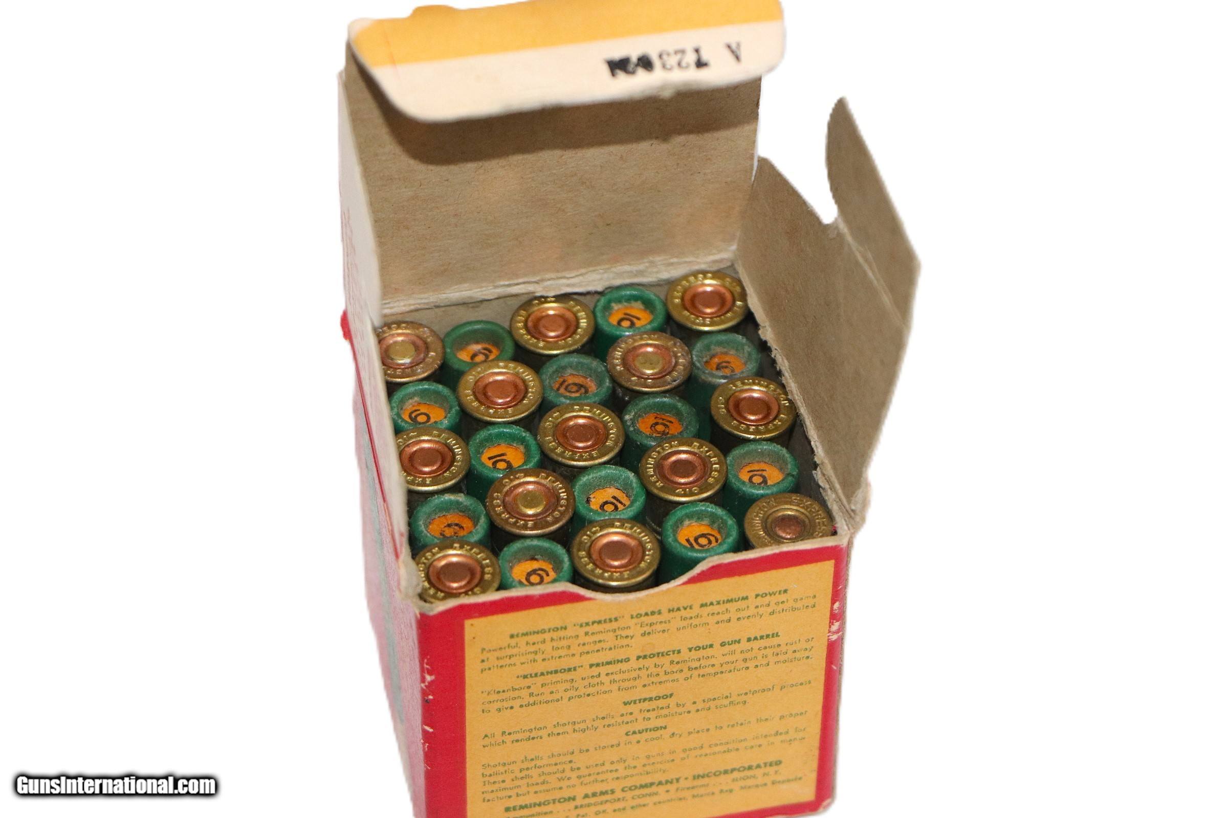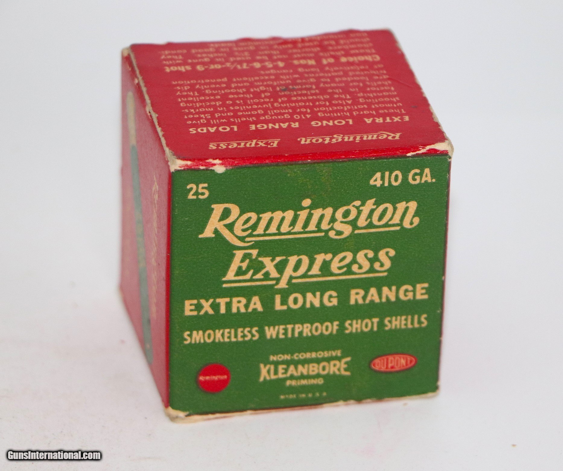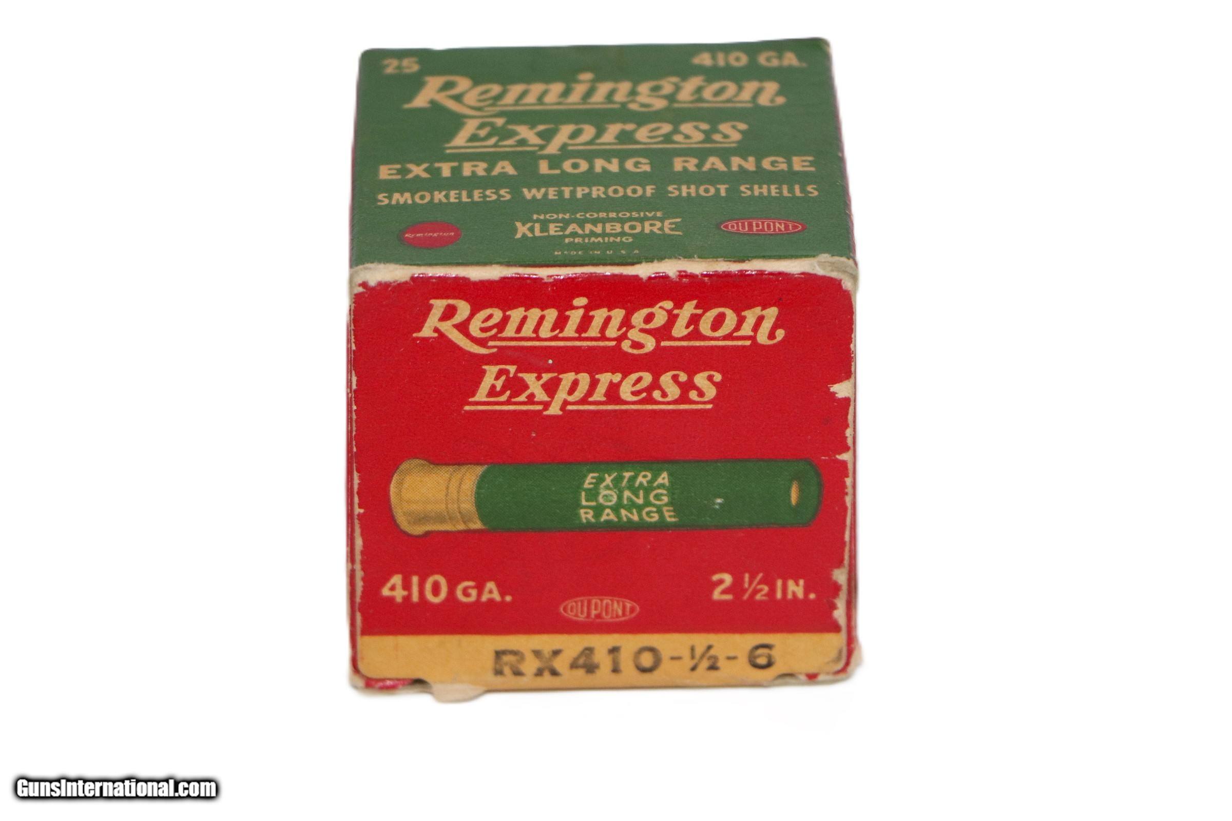 Description: Remington Express, Kleanbore, .410 Gauge, Extra Long Range, 2-1/2", Shot Size 6. 25 Exc Factory Rounds. Box is VG with some light edge ad corner wear. Add 13.50 S+H SOLD Shotgun Gauge: .410 Gauge |