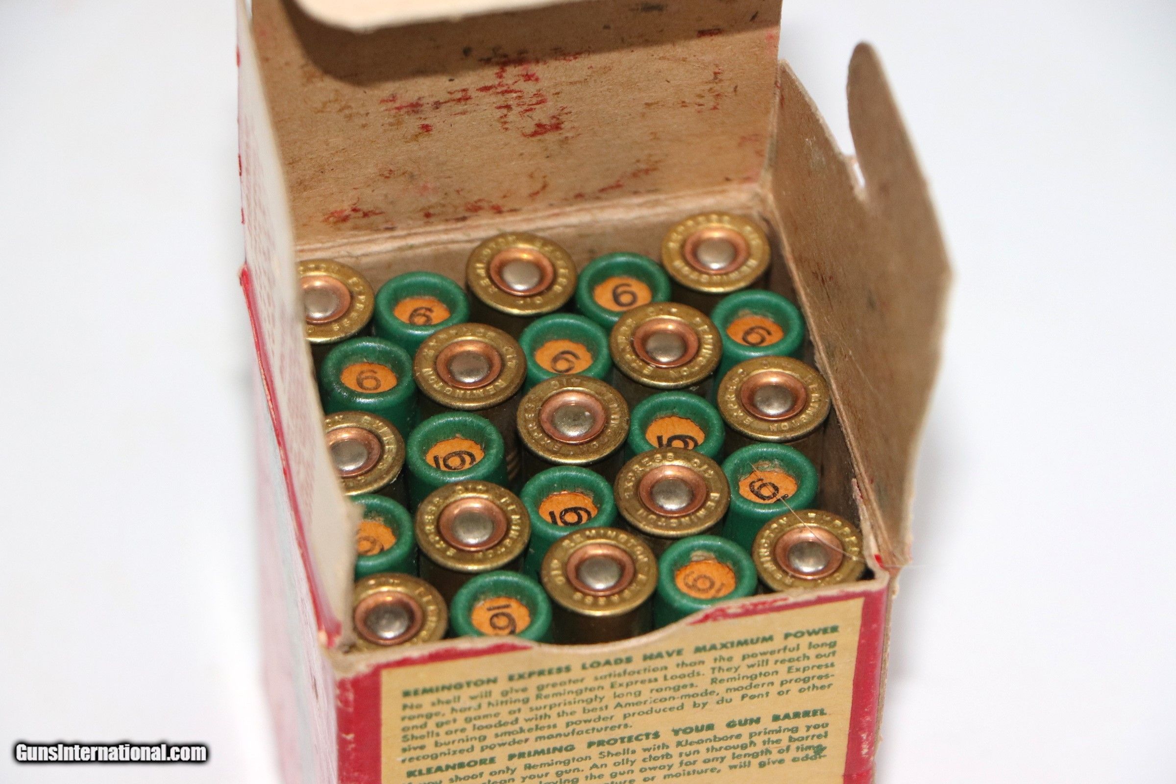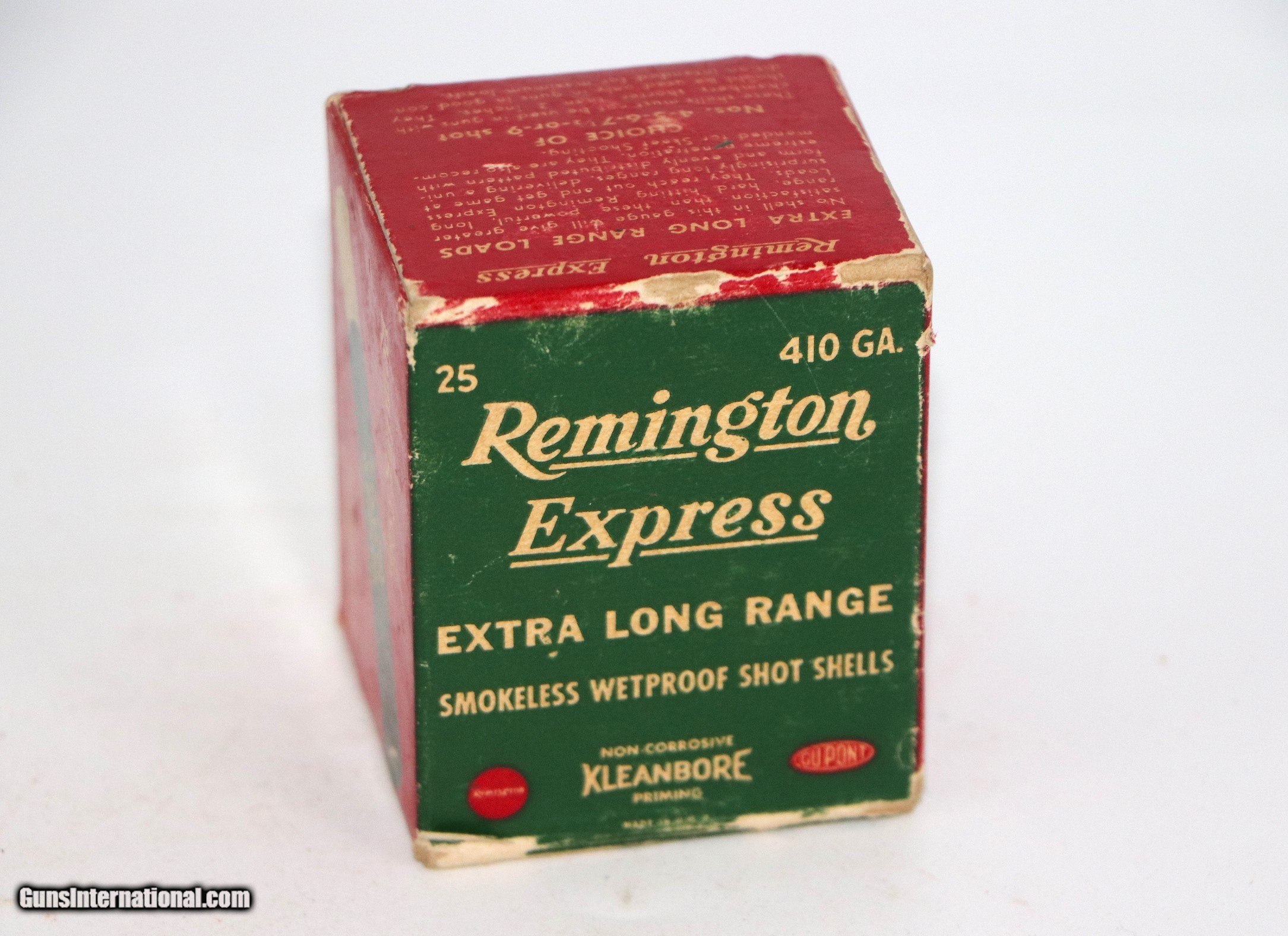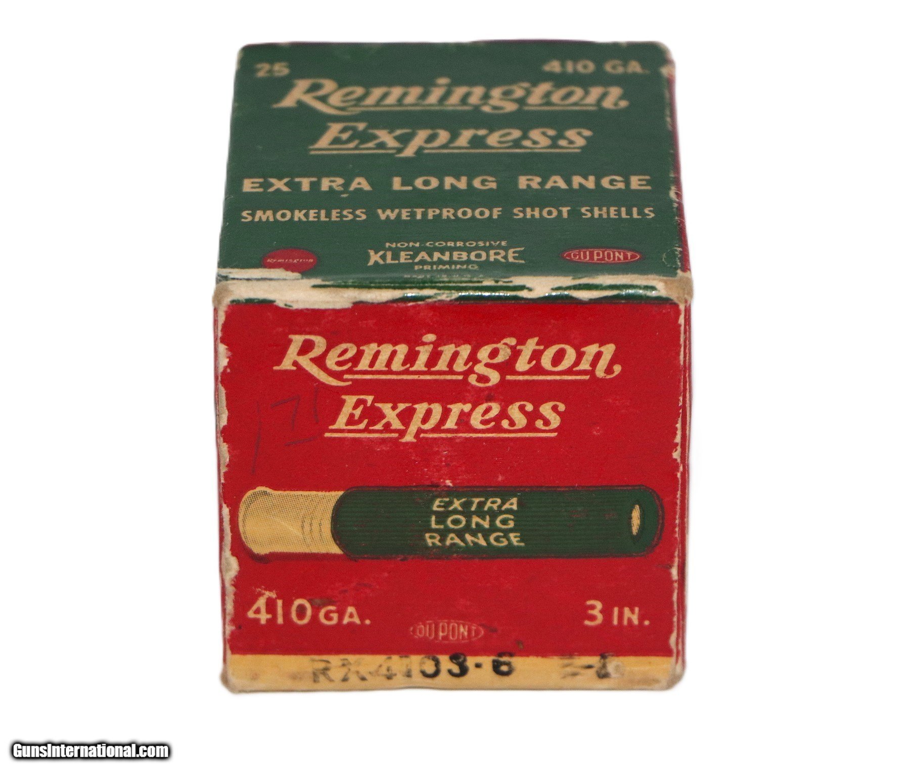 Description: Remington Express, Kleanbore, 410 Ga., 3", Size 6, 25 Excellent Shells. Box is good with scuffs, edge and corner wear, exc color. Add 13.50 S+H SOLD Shotgun Gauge: .410 Gauge |