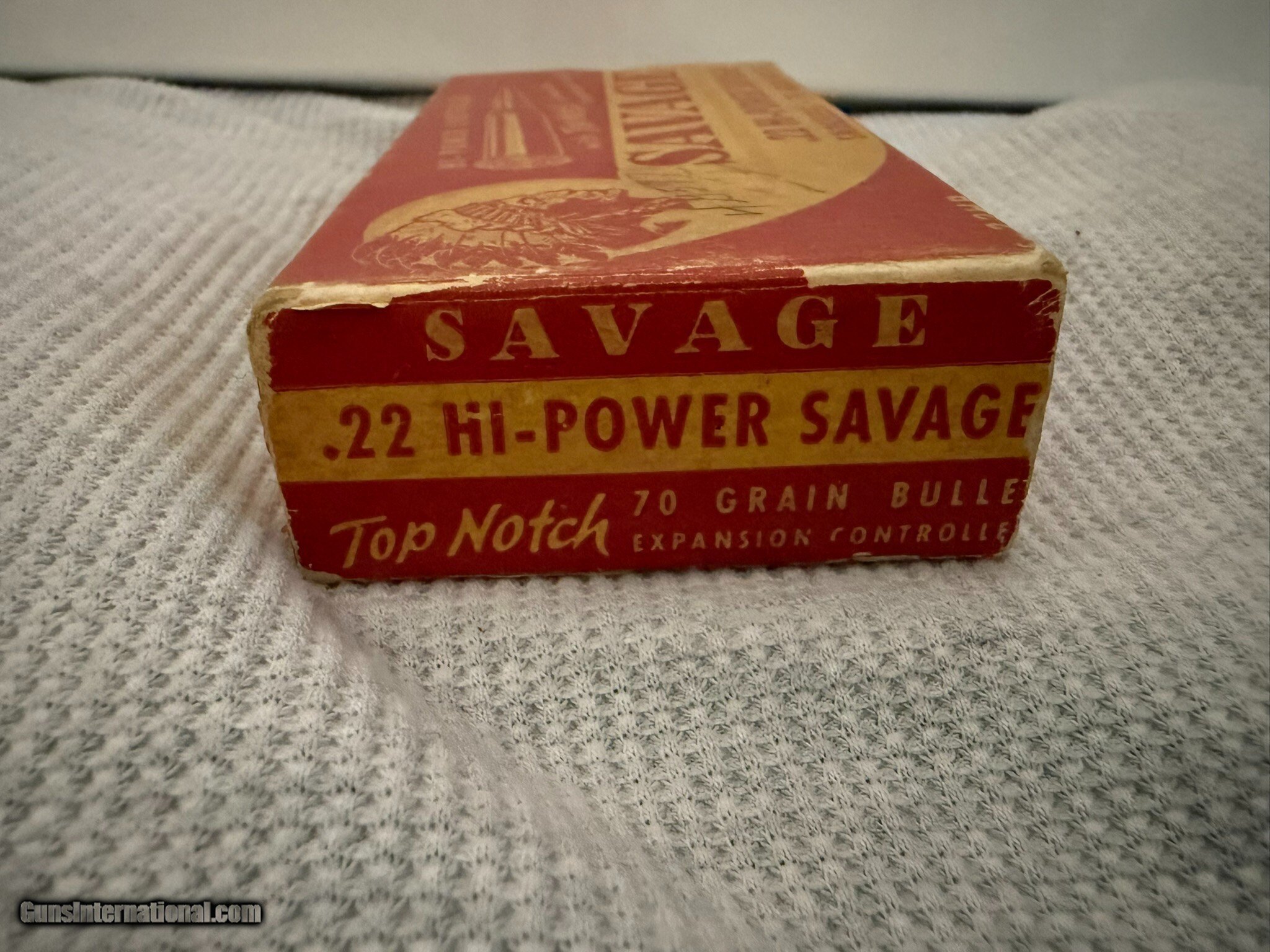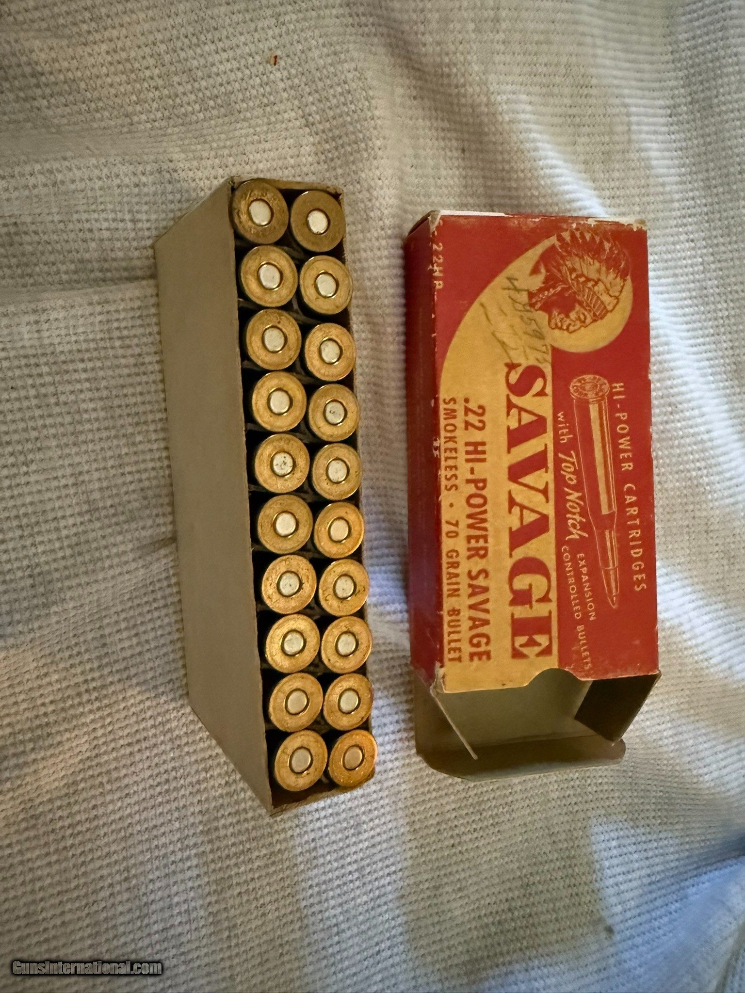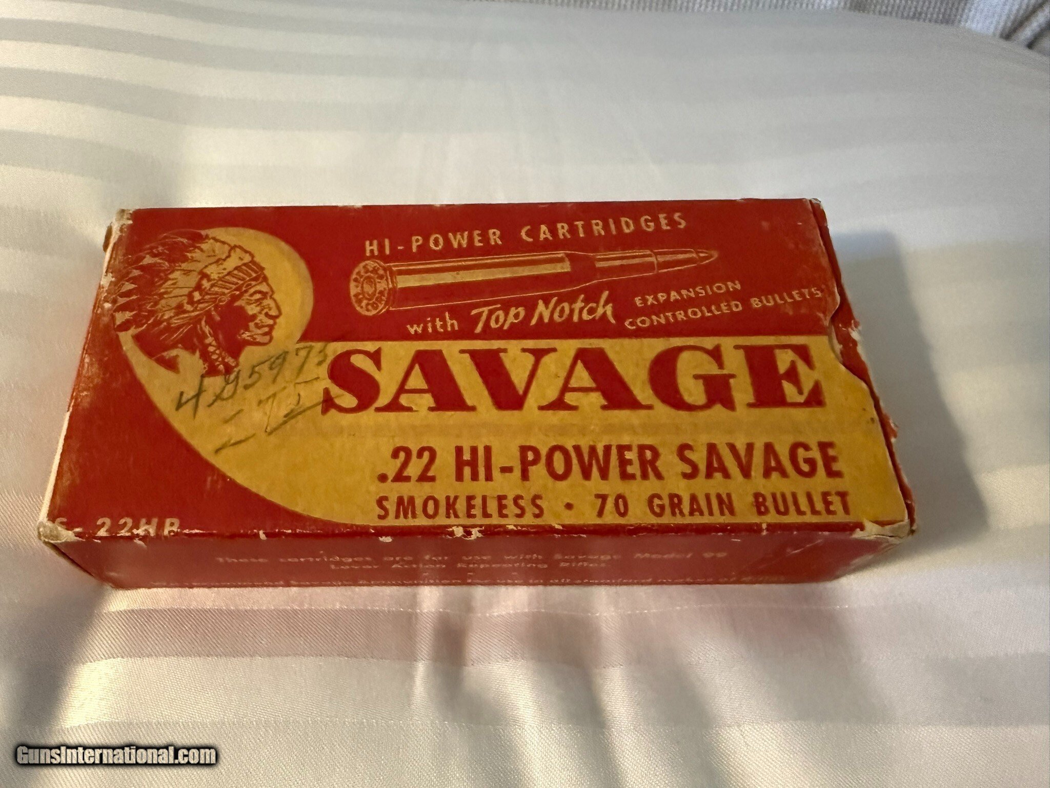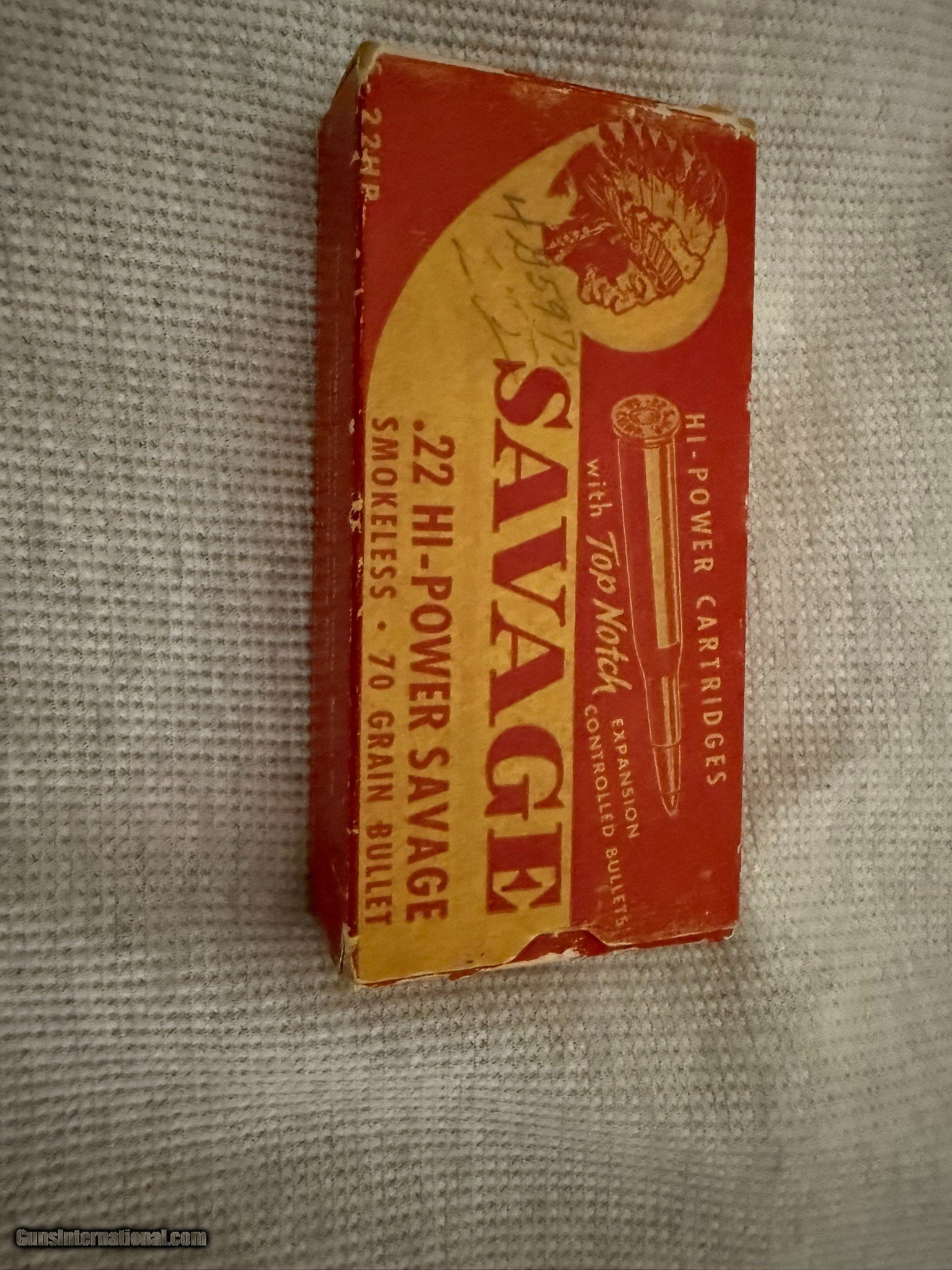 Description: Nice box of Vintage Savage 22 High Power. Box shows wear on all corners and end flap but all attached to the box. The Box is full. Rifle Caliber: .22 Savage Hi-Power Price: $200.00 Shipping: $25.00 Pay with