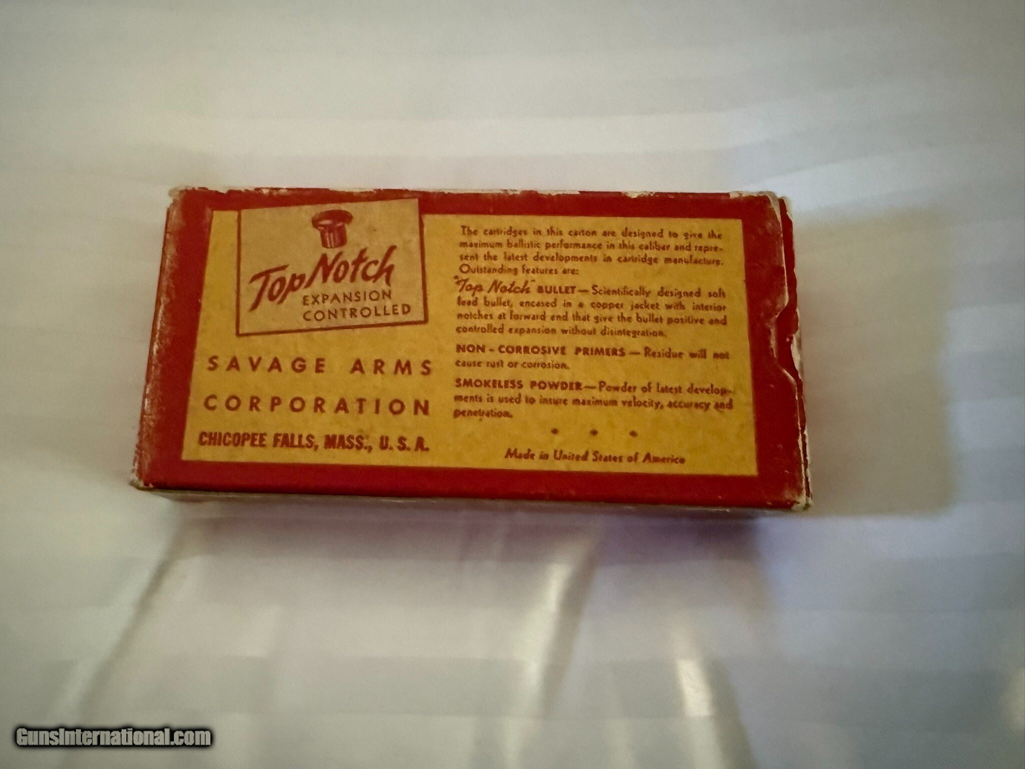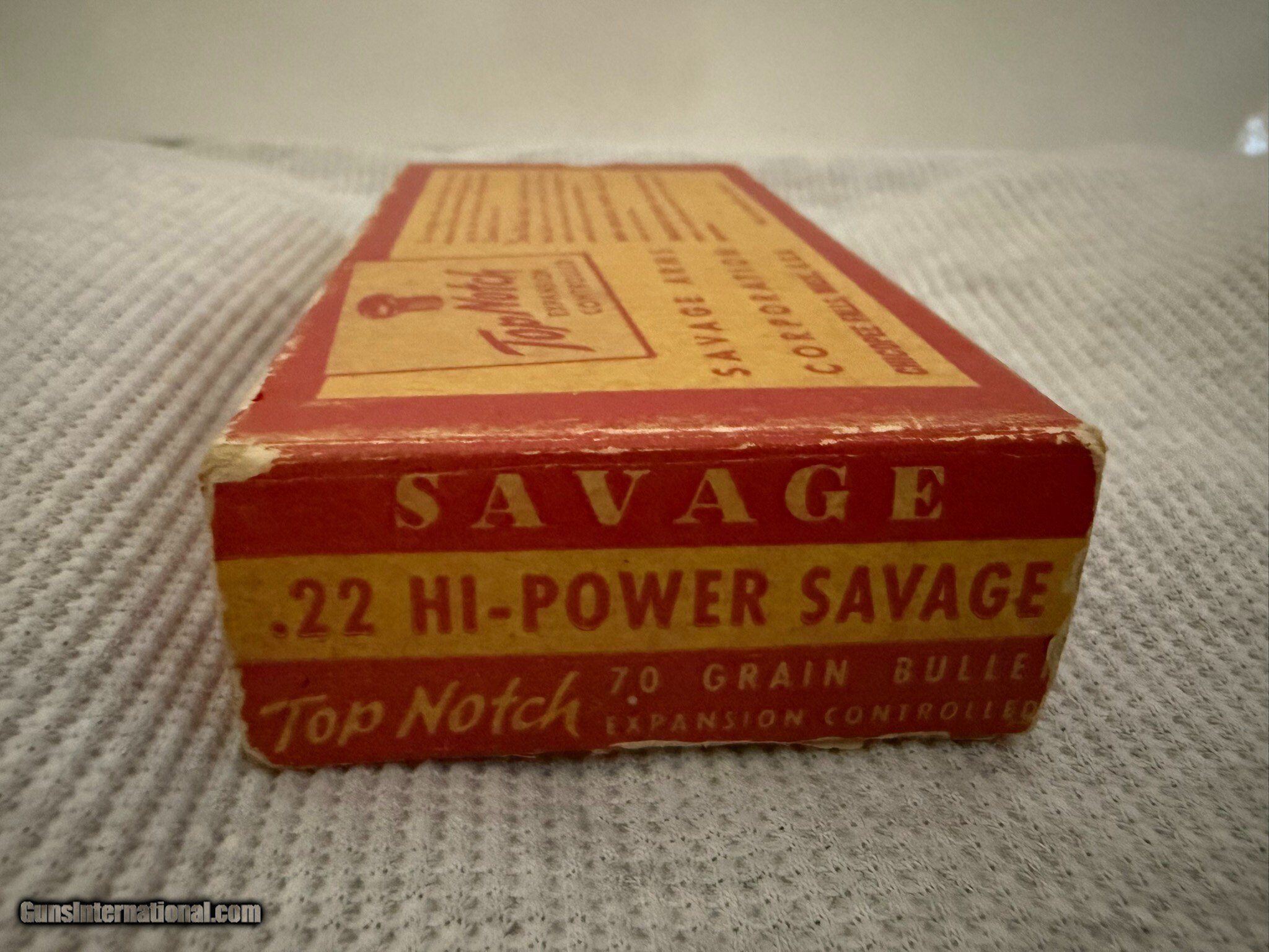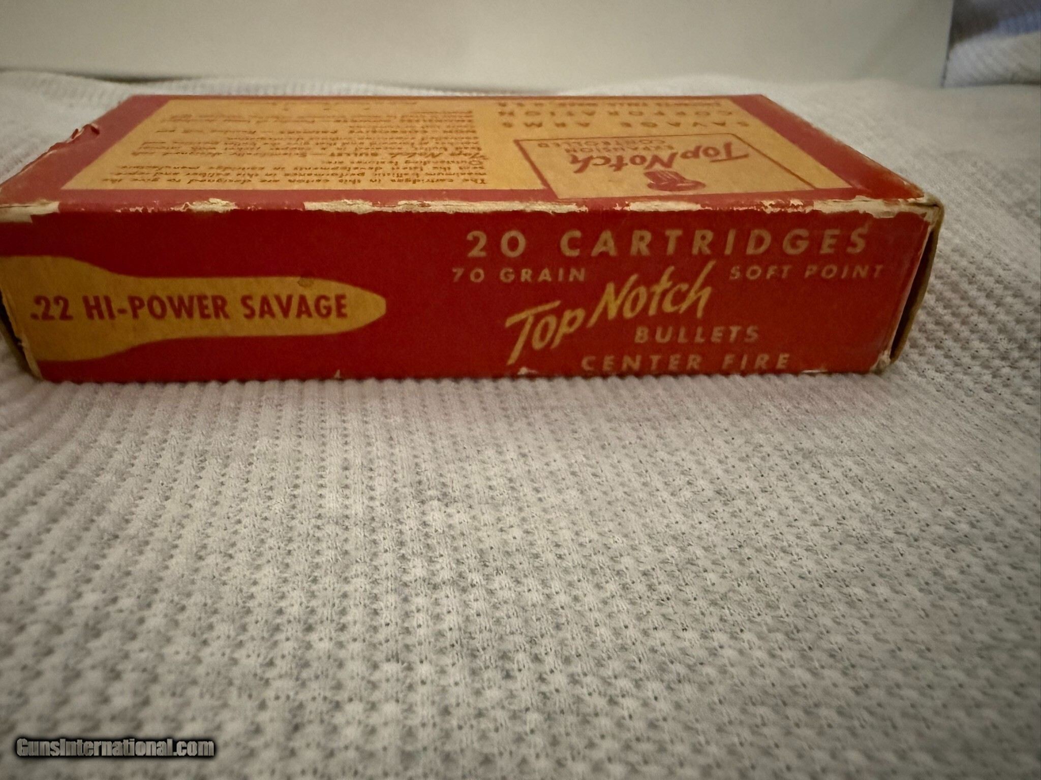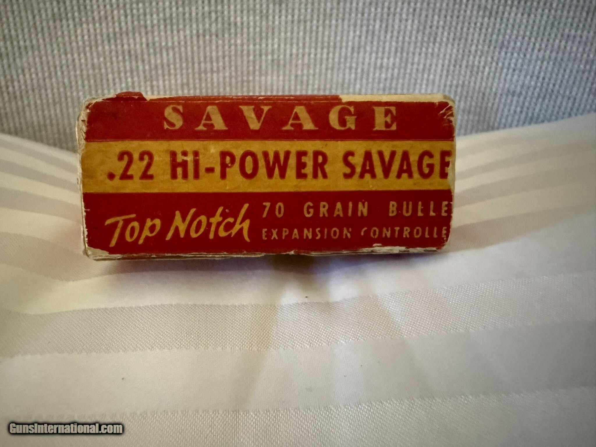 Description: Nice box of Vintage Savage 22 High Power. Box shows wear on all corners and end flap but all attached to the box. The Box is full. Rifle Caliber: .22 Savage Hi-Power Price: $200.00 Shipping: $25.00 Pay with