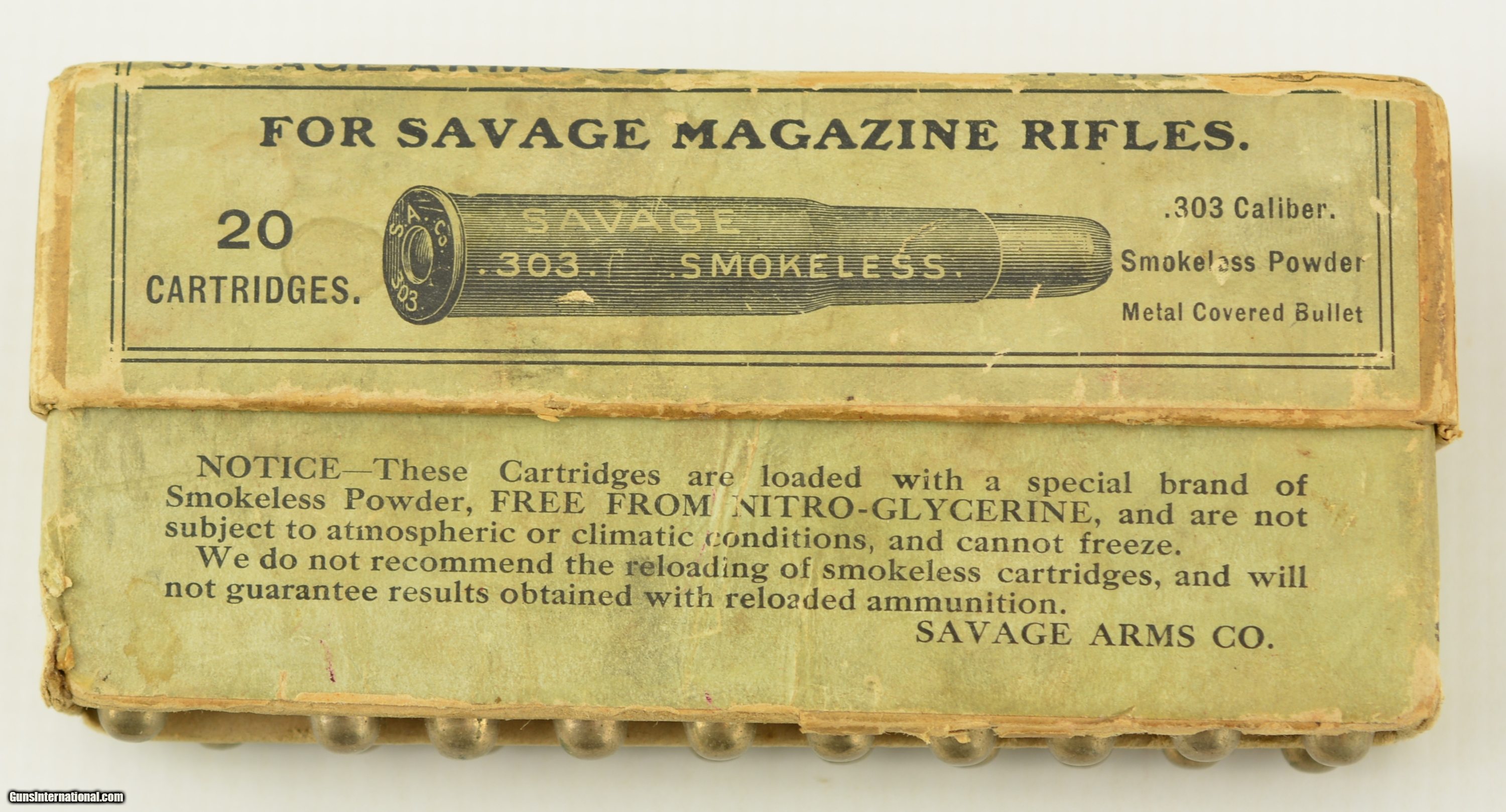 Description: Scarce Box of Savage 303 full metal jacket cartridges. This original box houses all of its original rounds. Head stamp SA Co 303 Sav. The cases show spots of old corrosion. The 2 pieces box is cover marked No 1 (Full patch). The front face shows the graphics of the cartridge with the metal cased bullet. The box ends show the Savage Indian head logo and the No 1 Savage 303 steel jacket. The bottom of the box is missing. These metal jacket cartridges were primarily built for use in the various Limited Production savage Military Muskets. A scarce and seldom found cartridge box. This box was sourced out of Canada. it may have been supplied by Savage to go with the 1914 Montreal Home guard muskets. SOLD Manufacturer: Savage Model: Ammo Caliber Info: .303 Sav Gauge Info: .303 Sav |