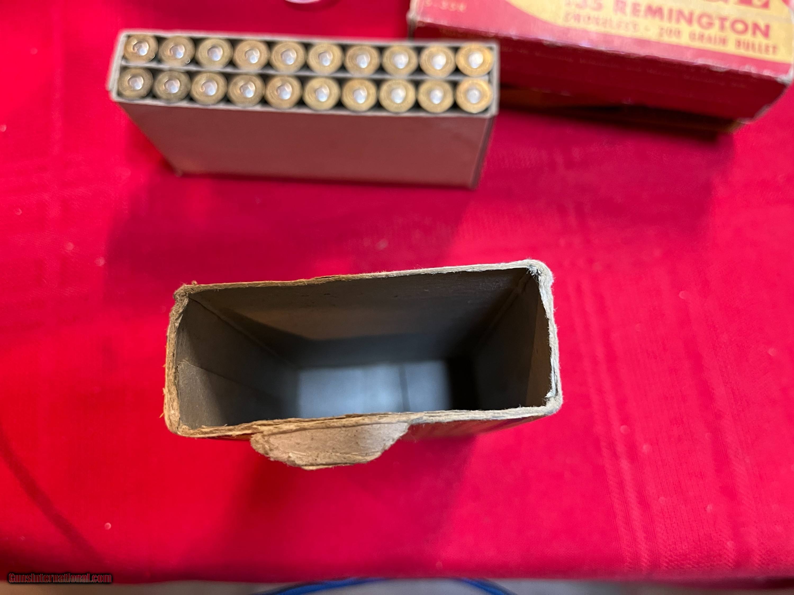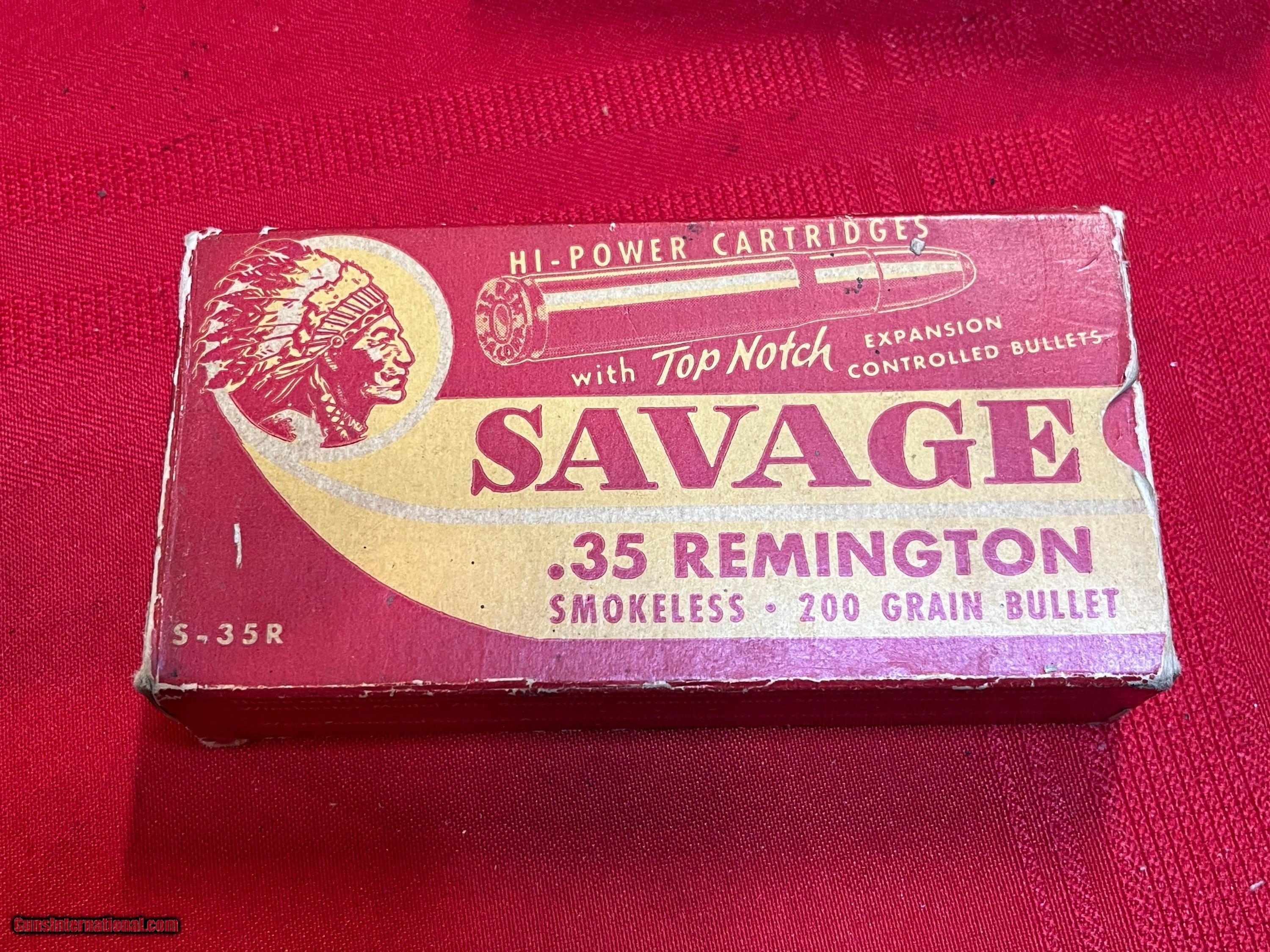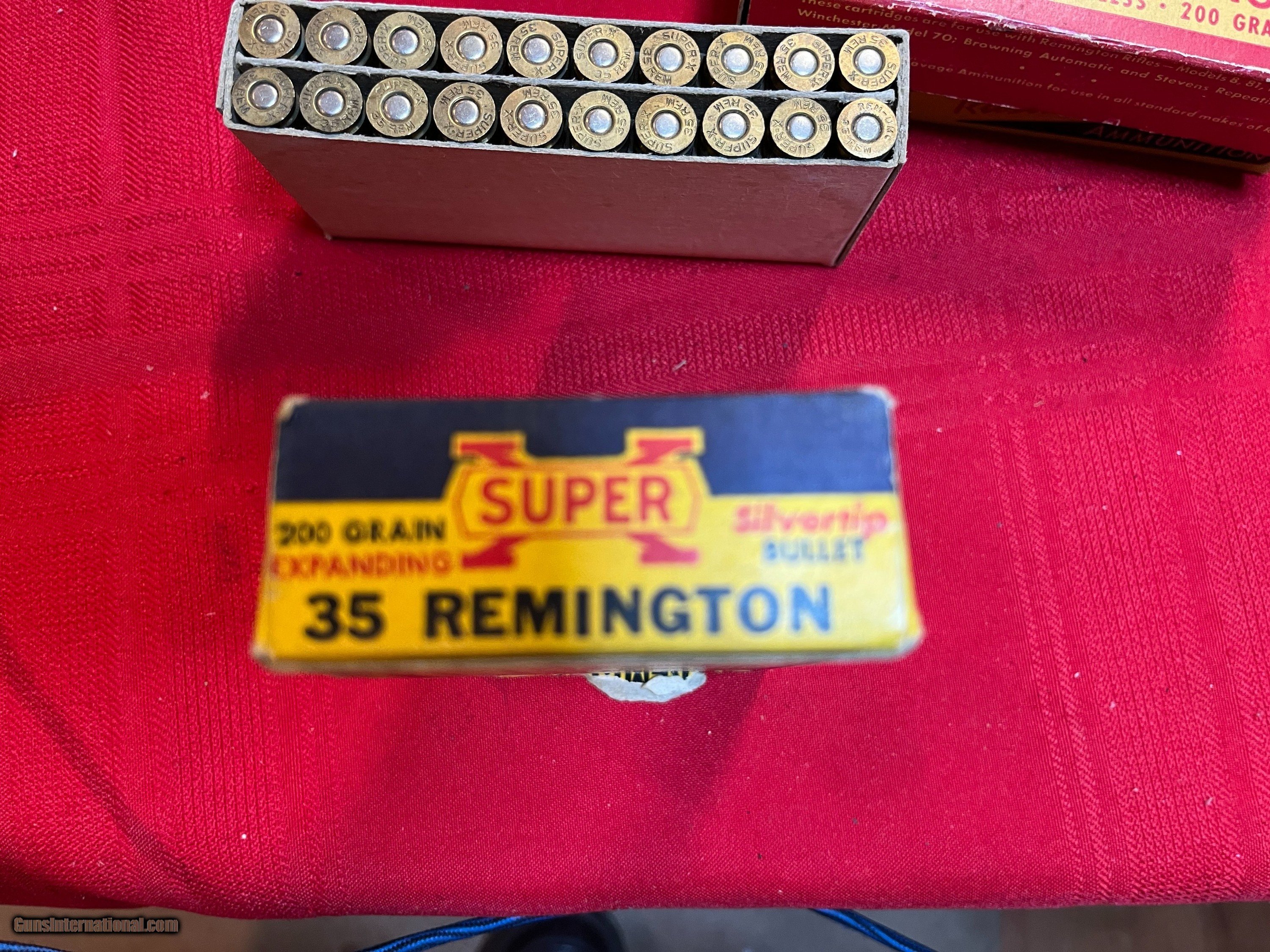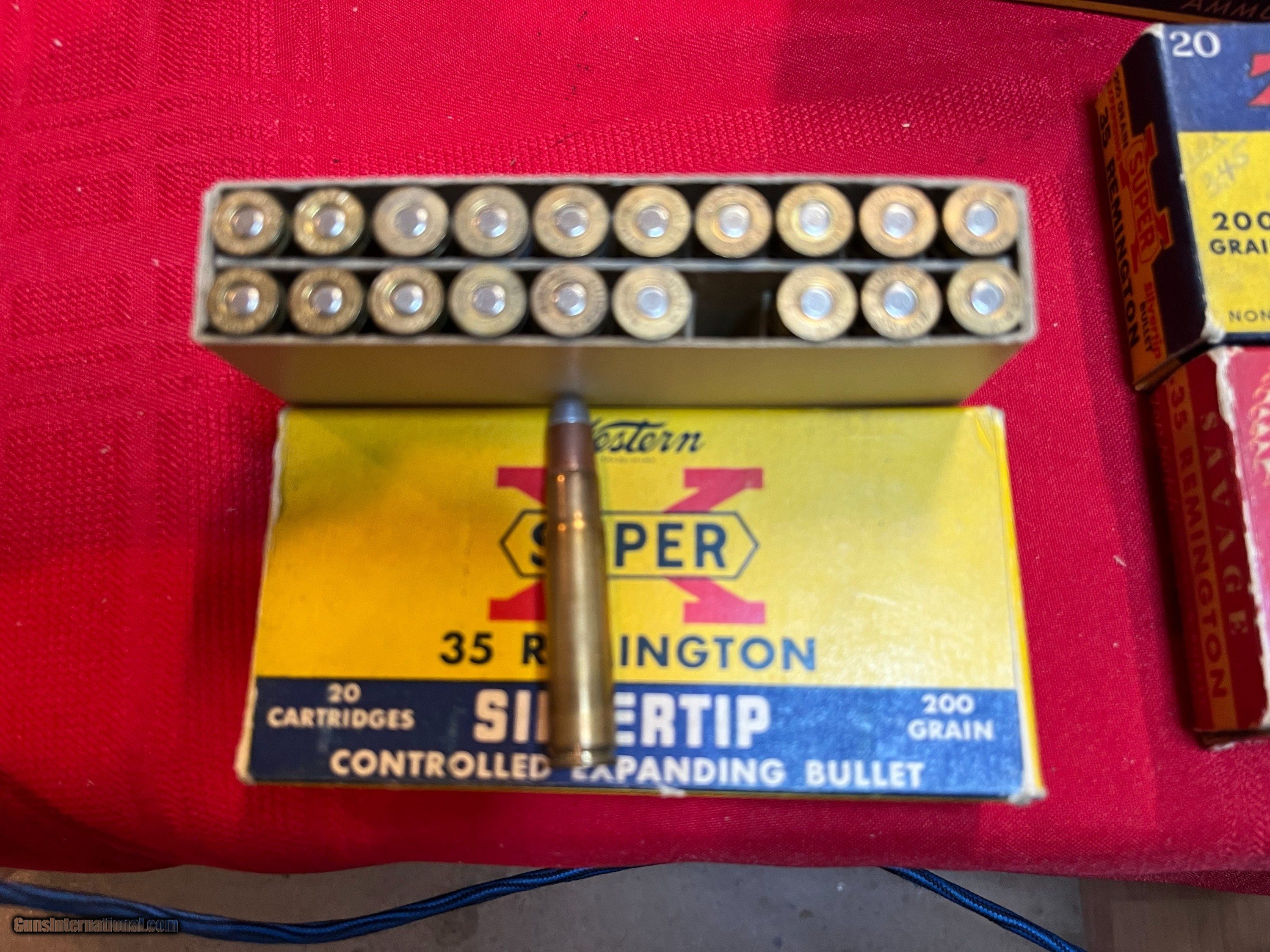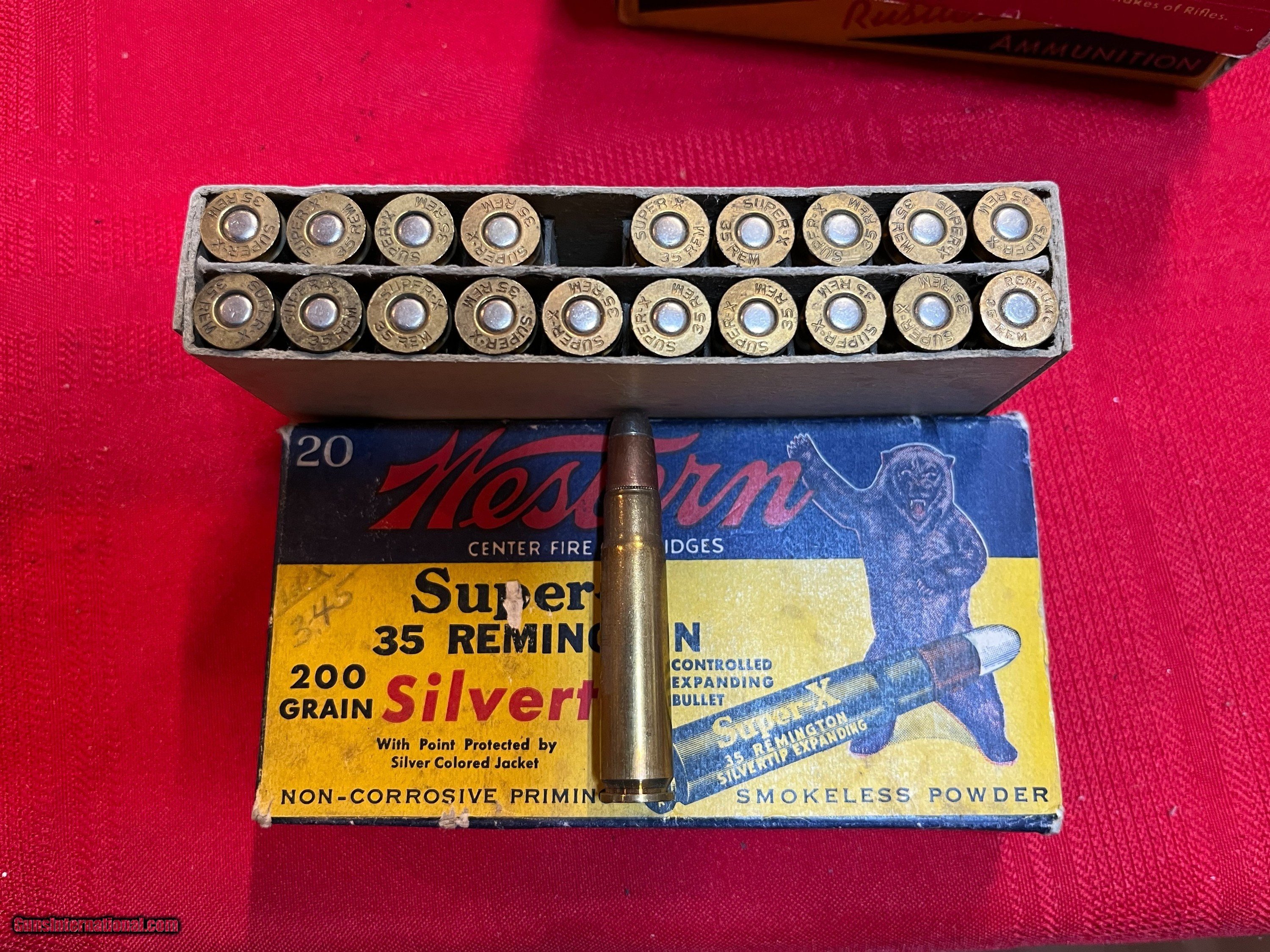 Description: 1. Box SuperX 35 REM SilverTip 200 grain. Perfect ammo and box. $65 2. Bear box Super X 35 REM Silver Tip. Missing 1 end flap. $80 3. Box Savage 35 REM. Ammo is reloaded Remington brand cases. $50 SOLD Rifle Caliber: .35 Remington |