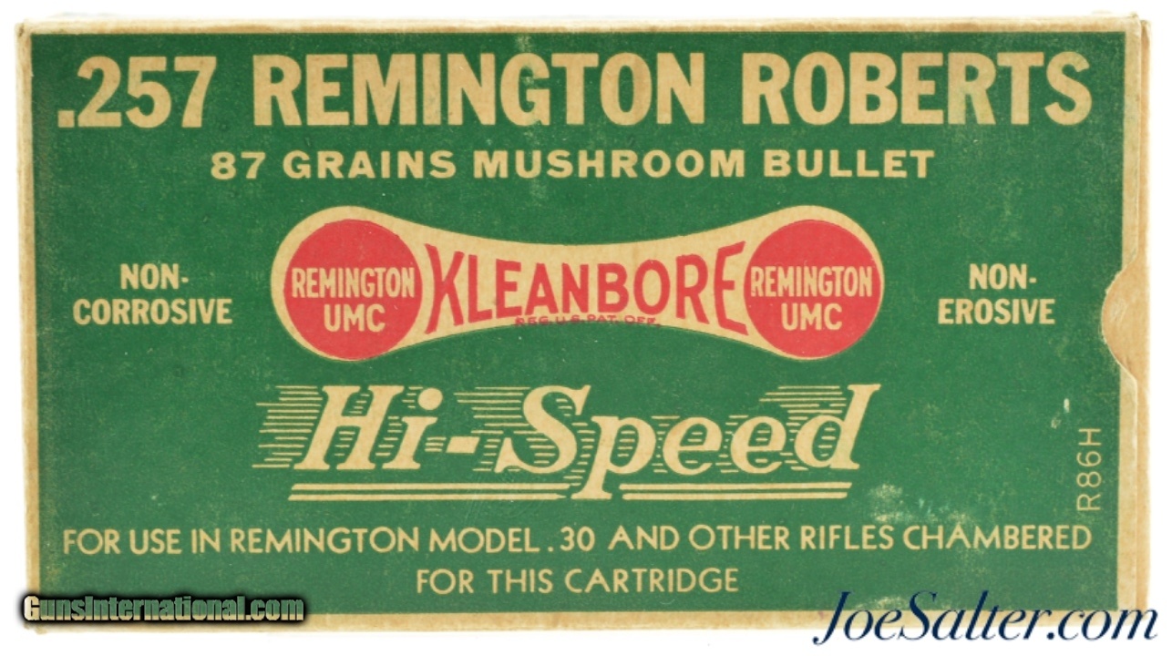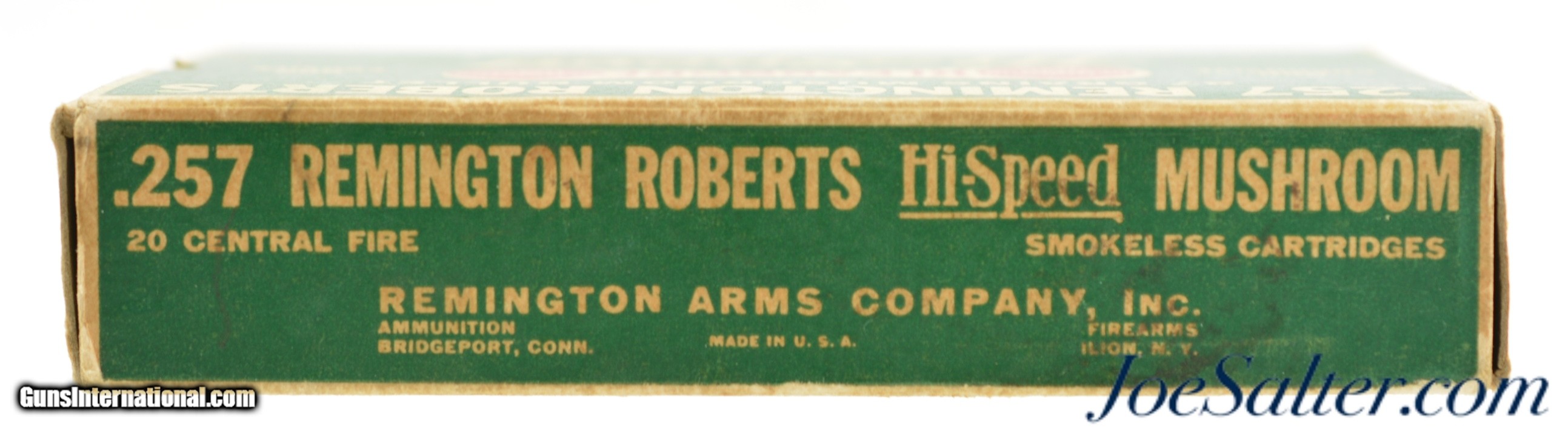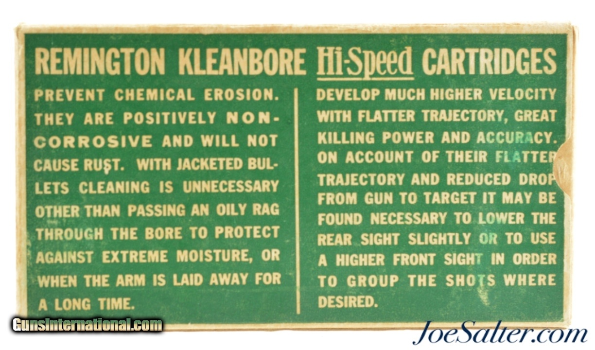 Description: This is a full box, 20 rounds, of .257 Remington Roberts ammunition manufactured by Remington. The 1930's one piece green, red and white "Dog Bone" Kleanbore logo Hi-Speed box is in excellent condition with bright color and crisp graphics with minor edge wear having a call out for the Remington Model 30 rifle with end flaps are marked "HI-SPEED MUSHROOM". The cartridges all have matching head stamps with one appearing to be the original loading with flat primer and the balance likely reloaded with oval primers and different hollow point bullet showing some age darkening of the brass. A classic "Dog Bone" box in a scarce caliber. SOLD |