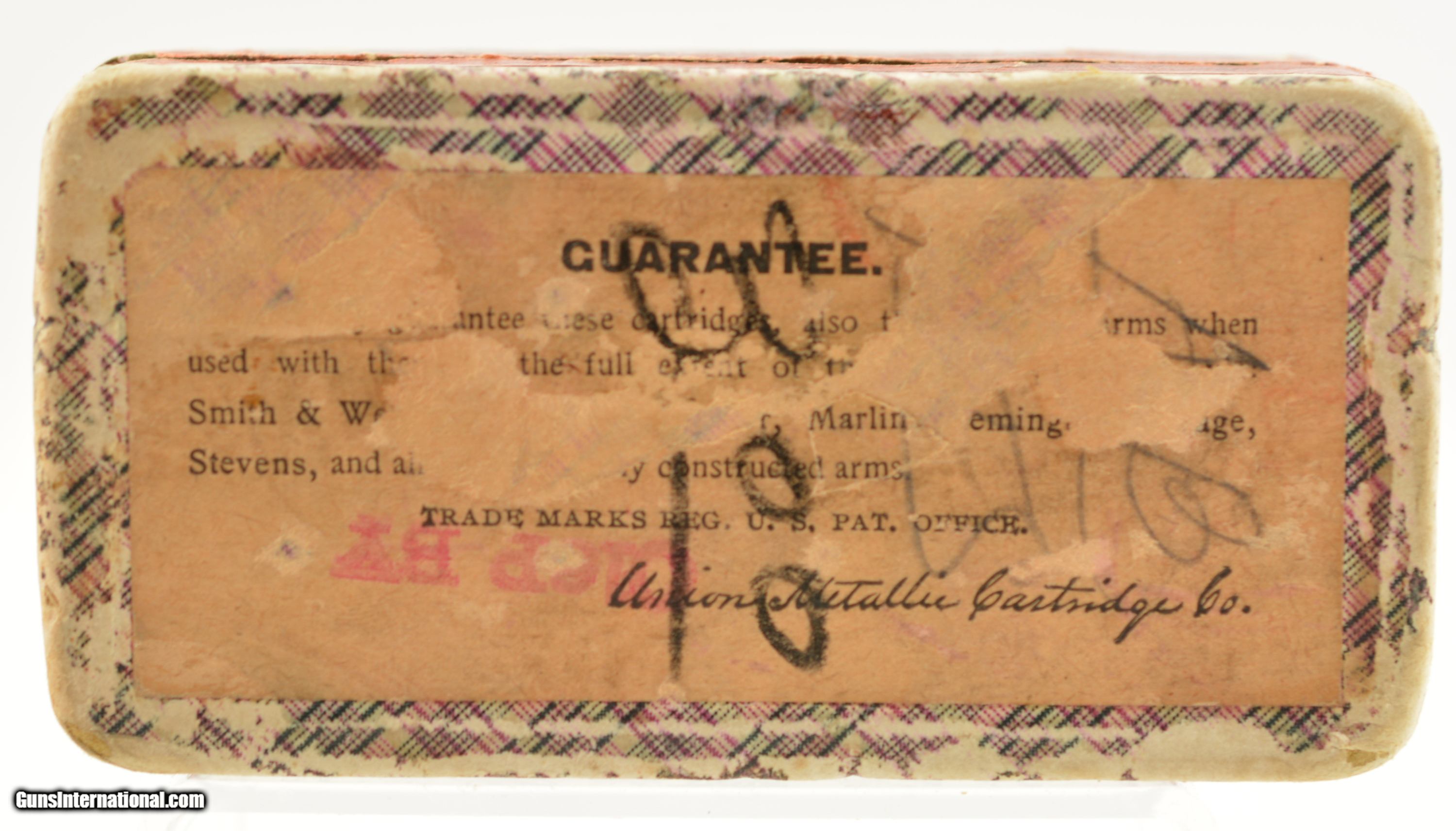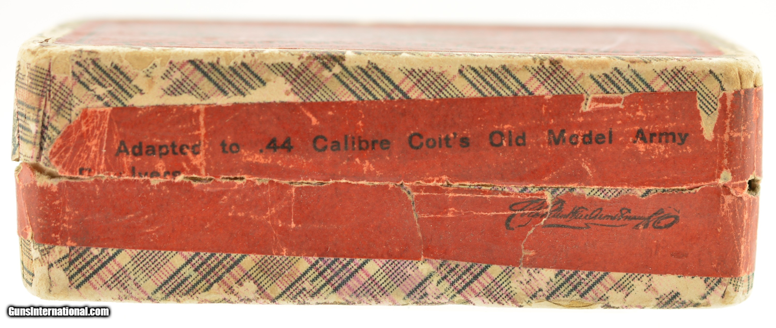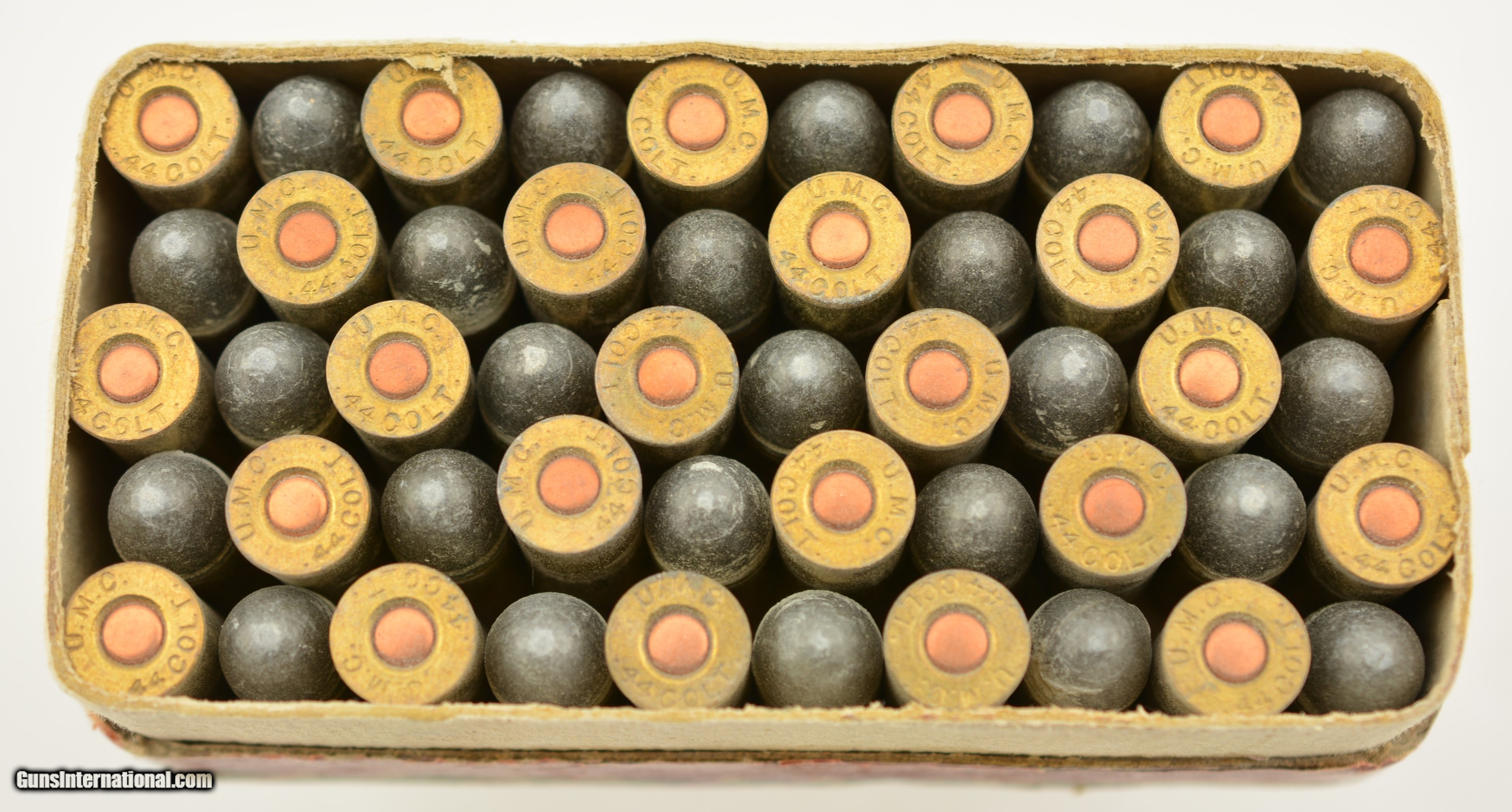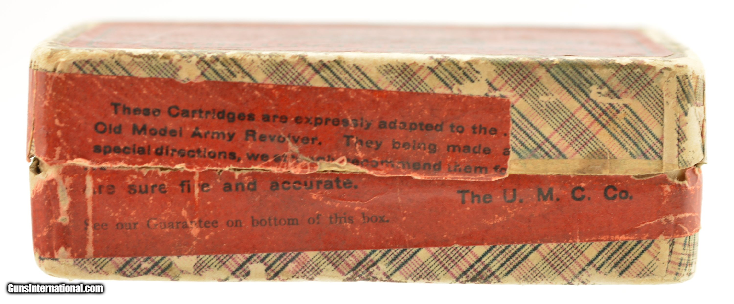 Description: This is a full box, 50 original rounds, of .44 Colt black powder ammunition manufactured by UMC (The Union Metallic Cartridge Co.) with 210 grain lead bullets marked on the top label “FOR COLT'S OLD MODEL REVOLVERS". The two piece fabric box is solid with an intact top label showing excellent graphics featuring a very nice cartridge cut and has about 85% of the side label intact. The cartridges are in excellent condition. A very nice example of this scarce ammo that will display well with your Colt Old Army revolver. SOLD Manufacturer: UMC Caliber Info: .44 Colt Gauge Info: .44 Colt |