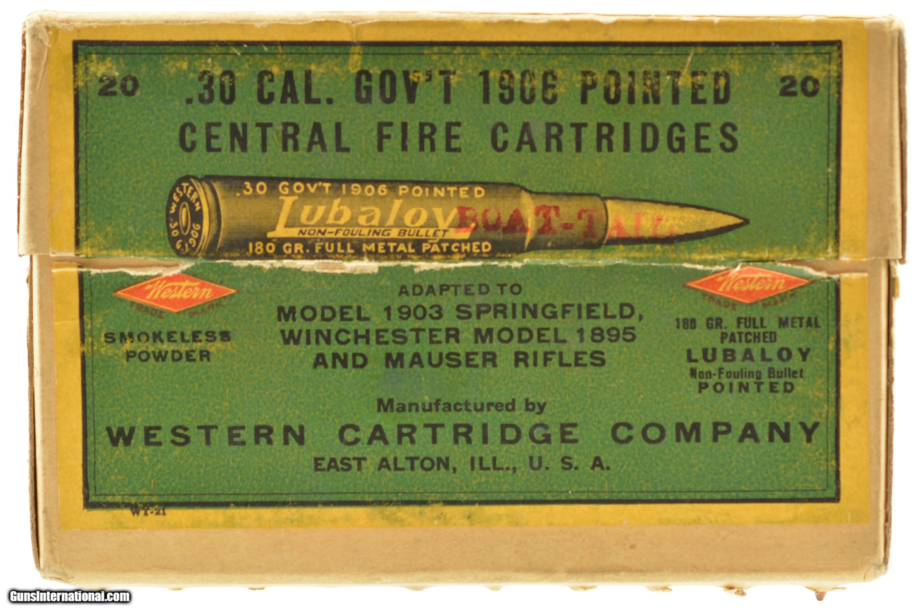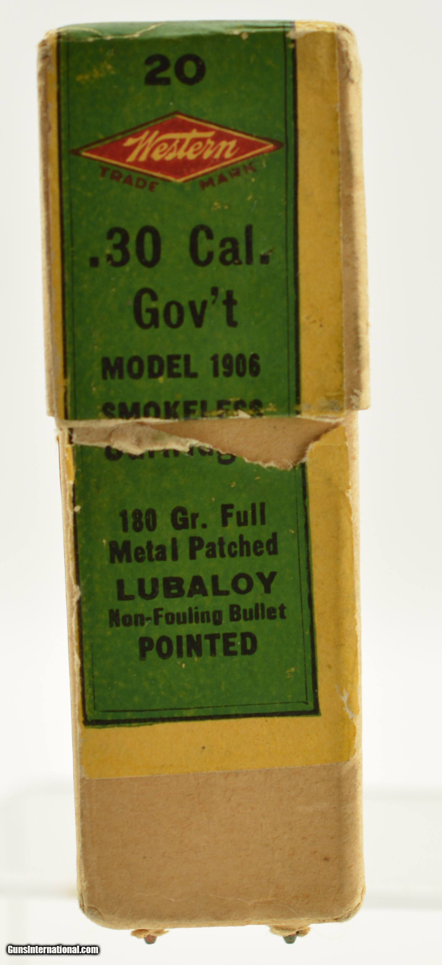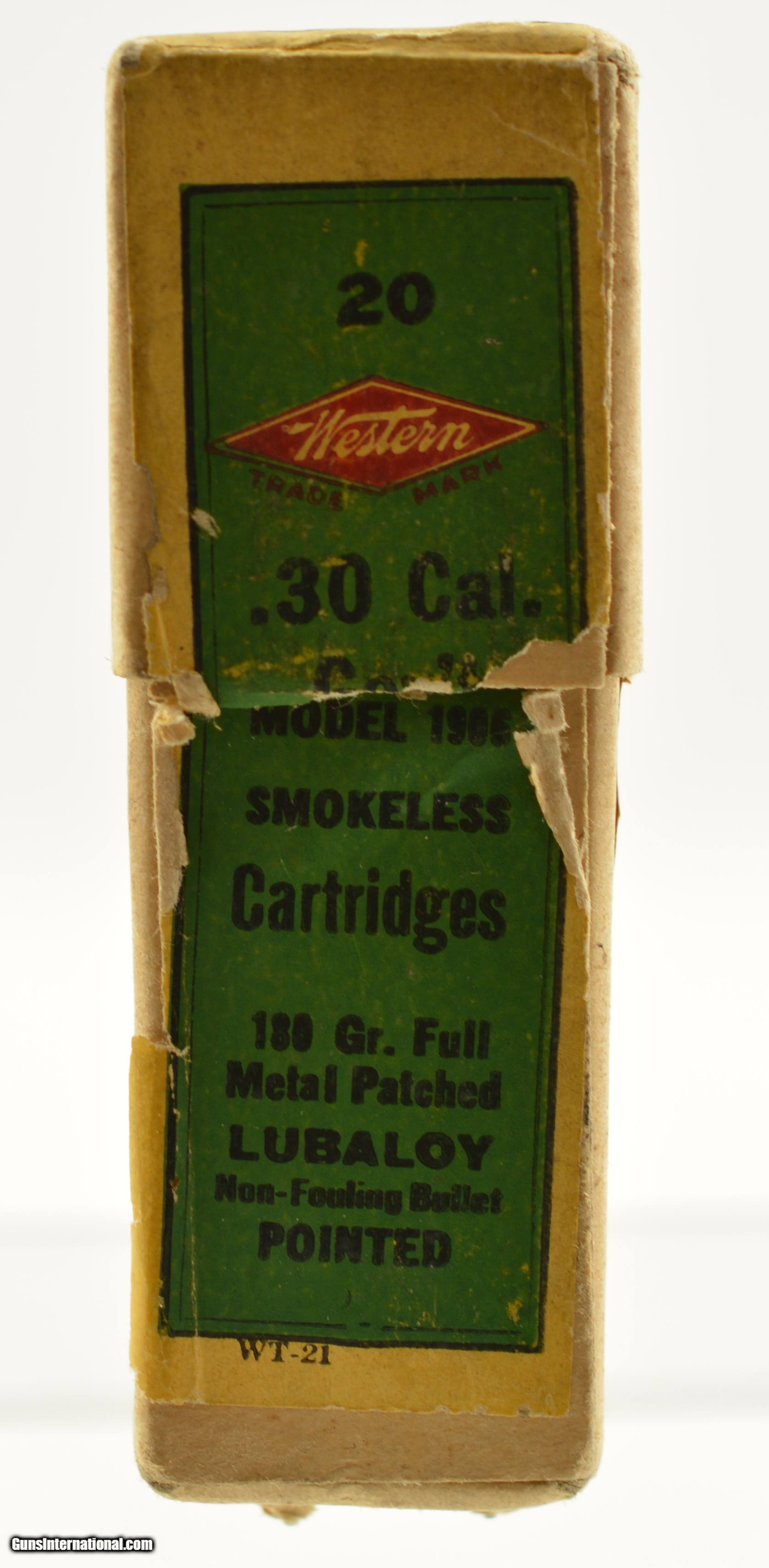 Description: This is a full box, 20 original rounds, of .30 Government 1906 ammunition with 180 grain Lubaloy Boat-Tail full metal patched bullets. The two piece green and yellow label with red diamond Western logos has excellent primary and side labels with crisp graphics and bright color showing a detailed cartridge cut with Lubaloy logo and red overprint "BOAT-TAIL" type. The buff box is solid with tiny holes on the bottom where the pointed tips are peaking through. The cartridges are in excellent condition. SOLD |
